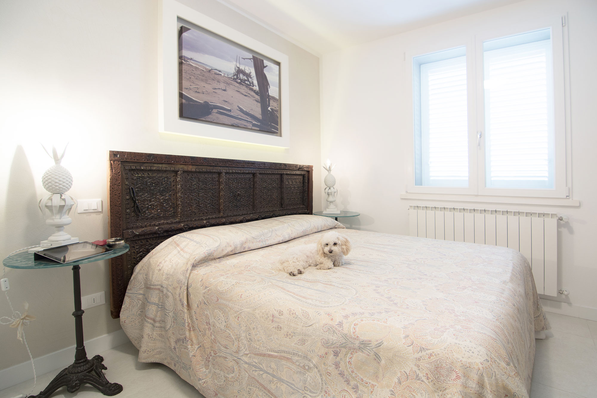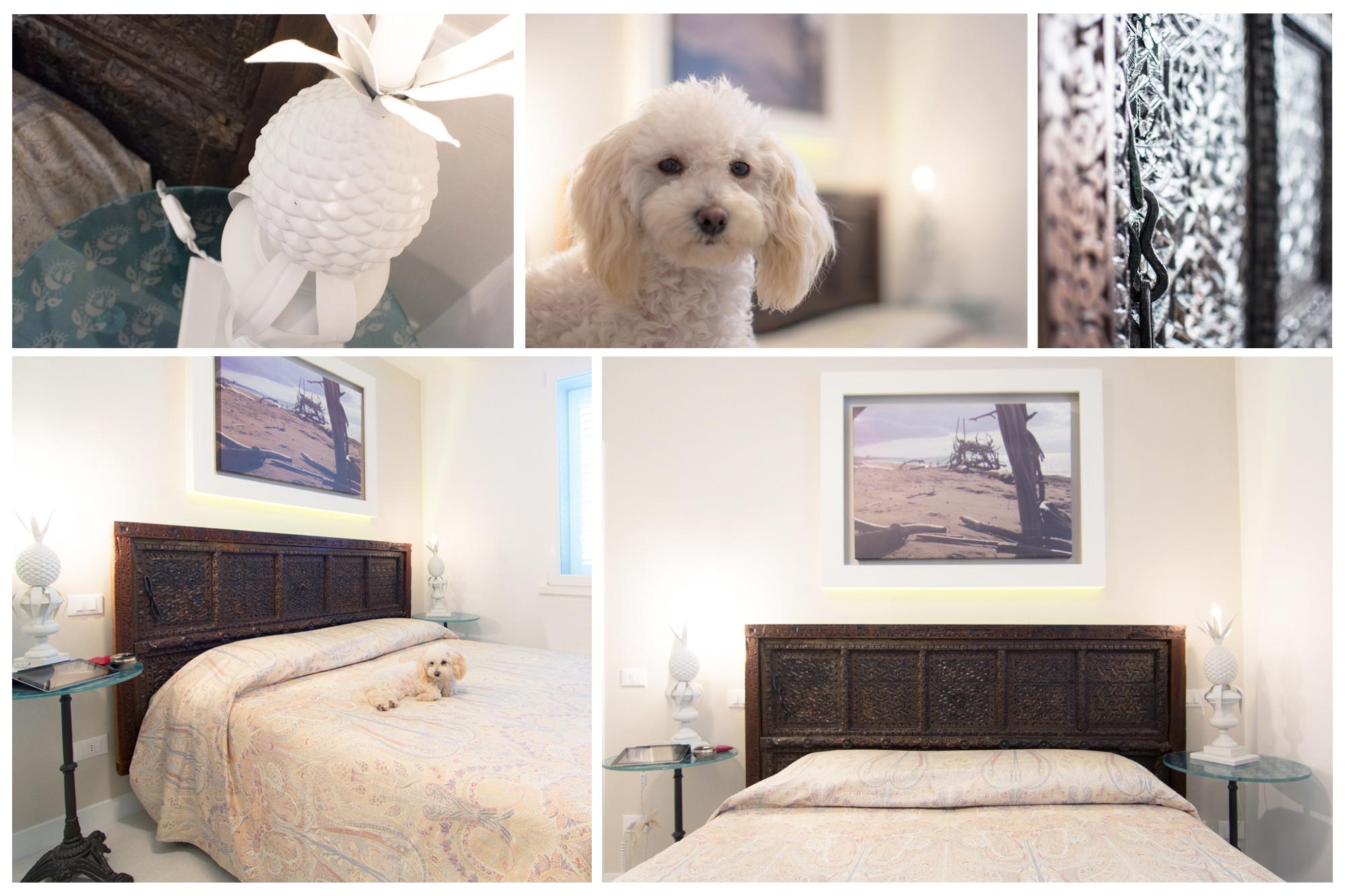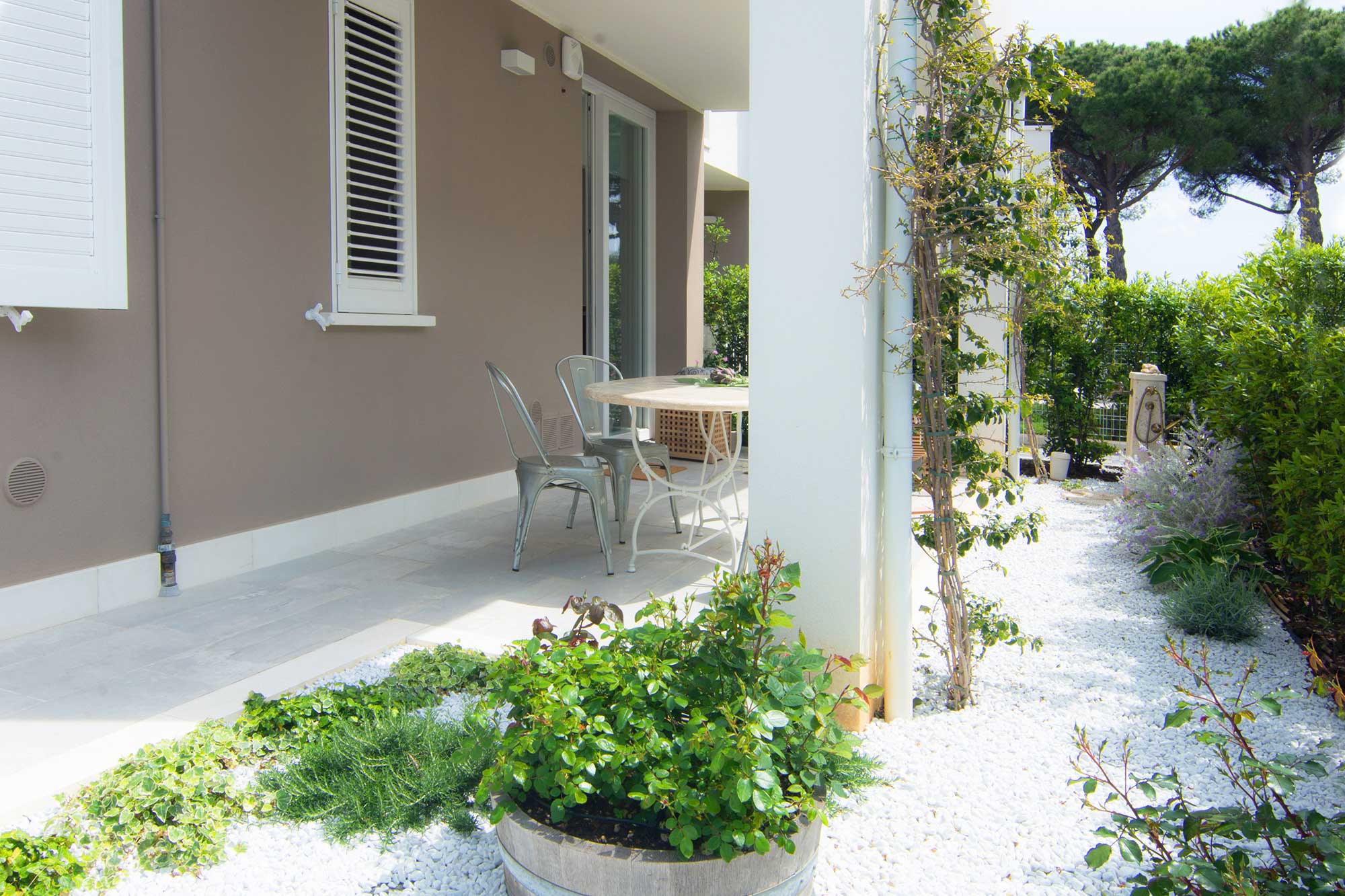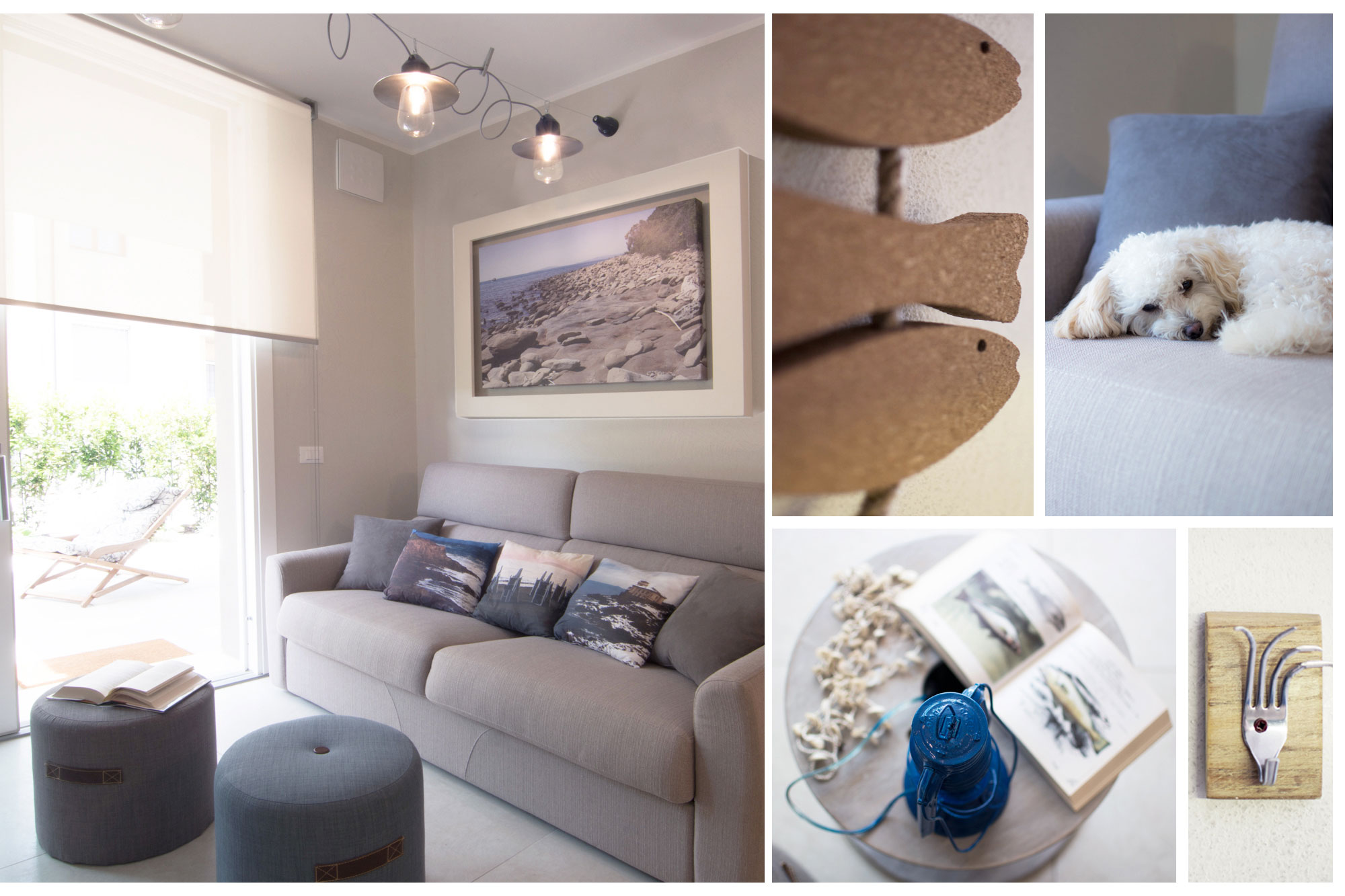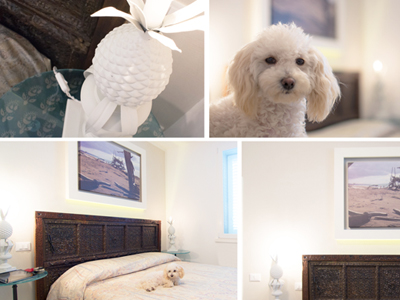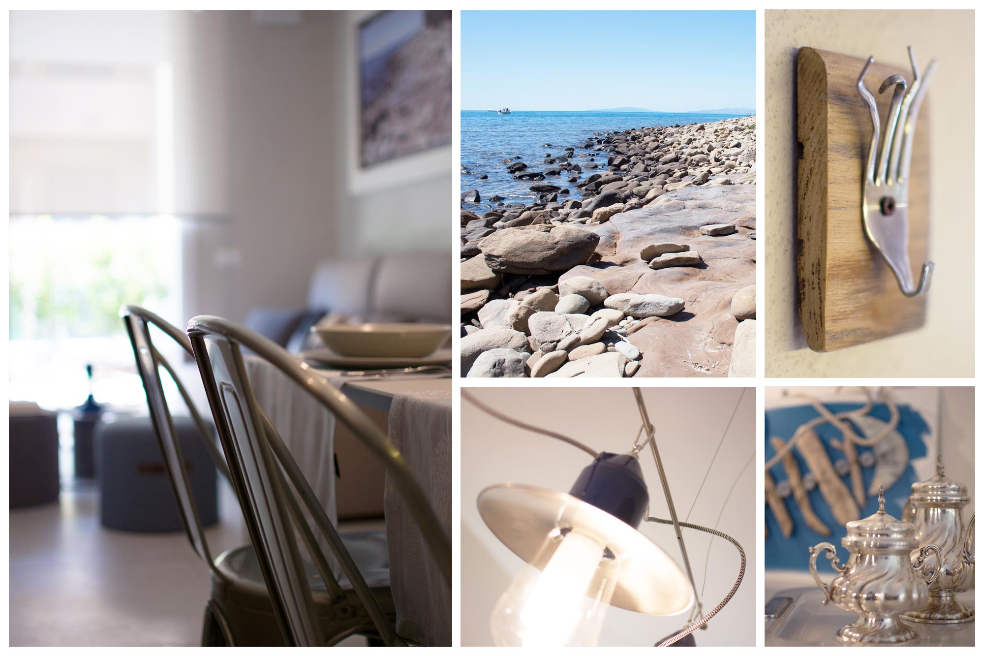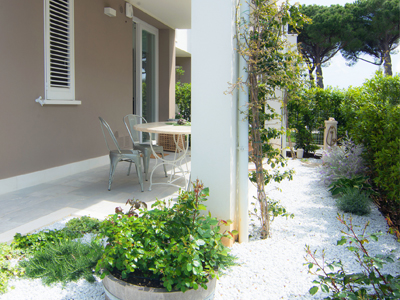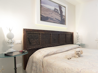 Interior design, lighting design, garden design. Our firm has handled the interiors and gardens of this small apartment on the ground floor of a building recently built in Marina di Cecina near Livorno, on the Tuscan coast. The kitchen cabinets are covered by grès large tiles and the same for the kitchen top. The splash is realized in glass with a large photograph printed on to. Similar pictures are printed and the cushions and on the canvas in the main rooms. Another peculiarity of this little apartment are the two headboards realized with two ancient reclaimed indian doors. They are really special with their decoration in relief!