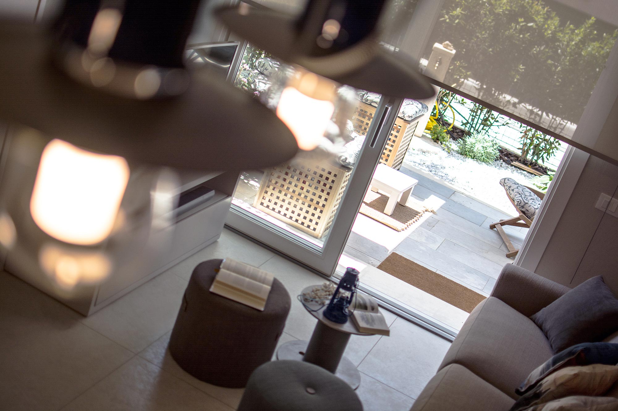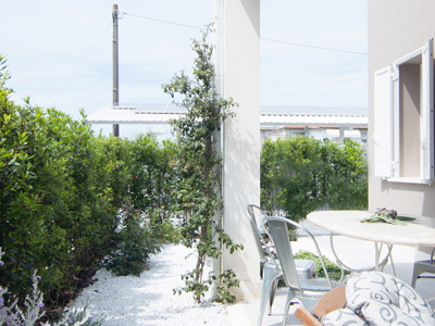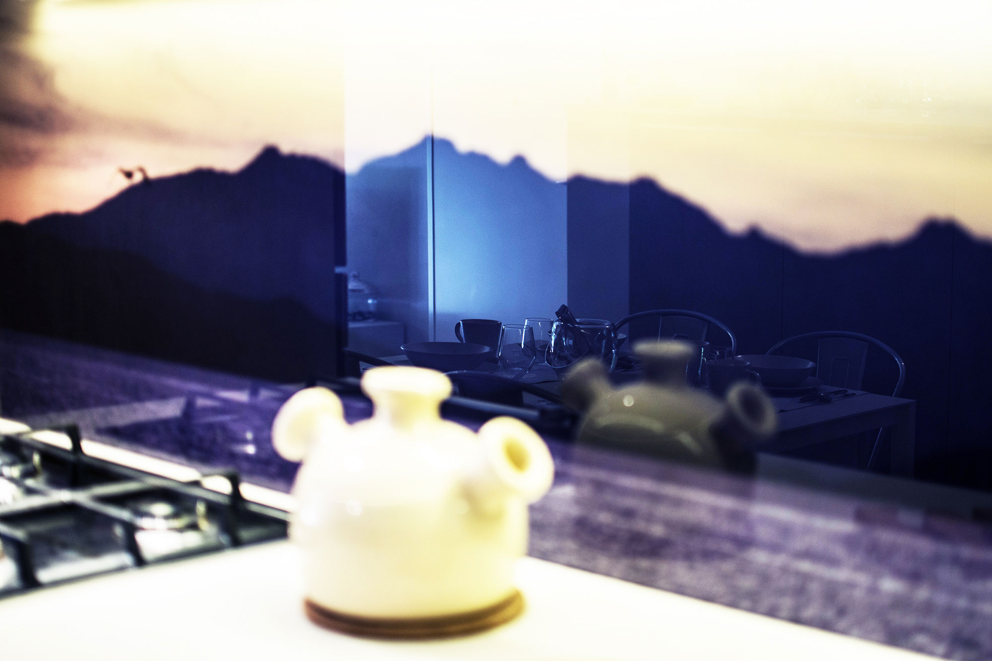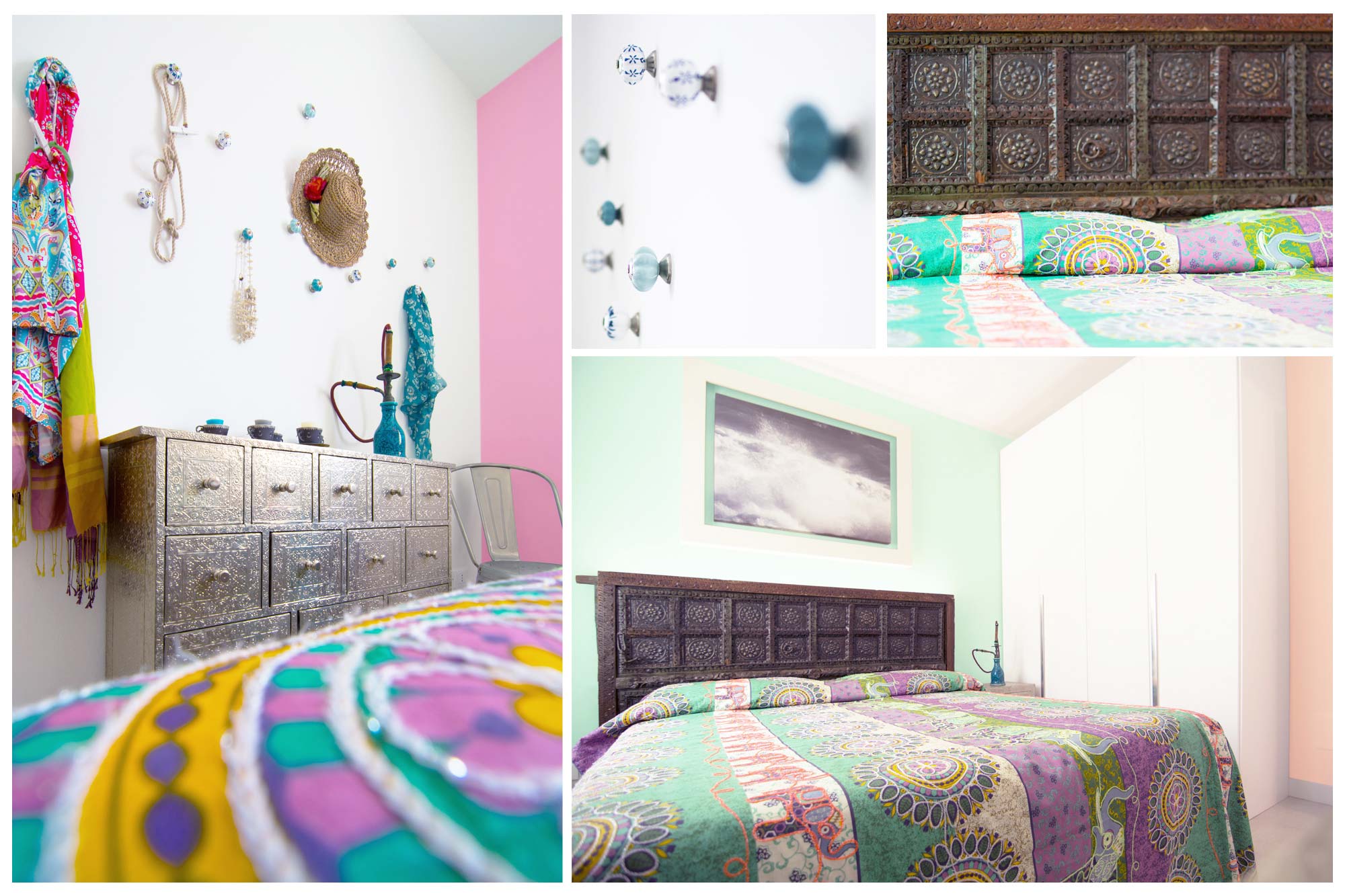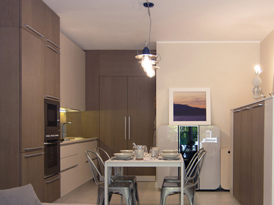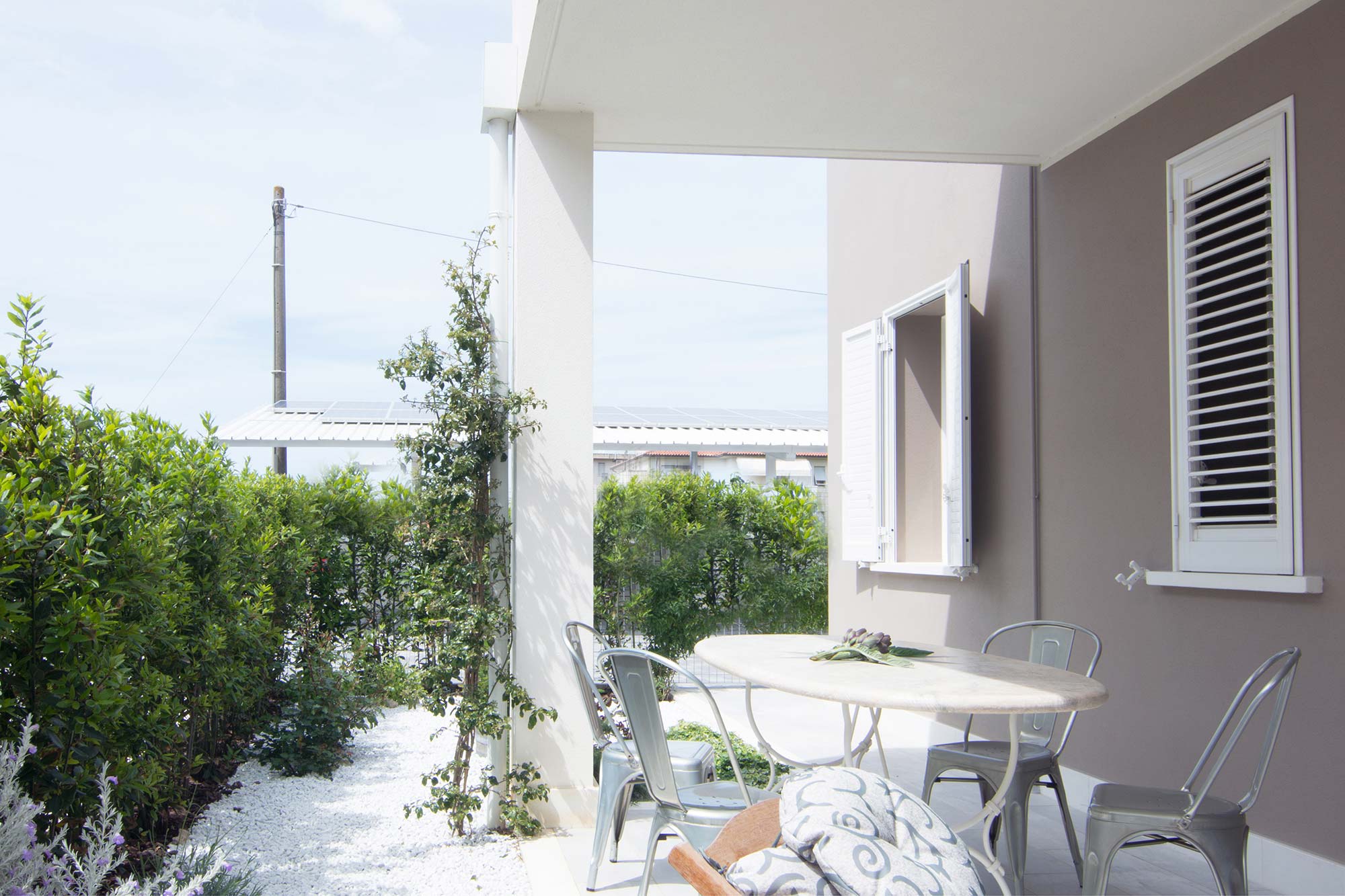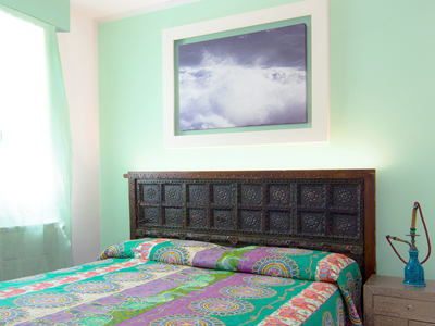 Interior design, lighting design, garden design. Our firm has handled the interiors and gardens of this small apartment on the ground floor of a building recently built in Marina di Cecina near Livorno, on the Tuscan coast. The kitchen cabinets are covered by grès large tiles and the same for the kitchen top. The splash is realized in glass with a large photograph printed on to. Similar pictures are printed and the cushions and on the canvas in the main rooms. Another peculiarity of this little apartment are the two headboards realized with two ancient reclaimed indian doors. They are really special with their decoration in relief!