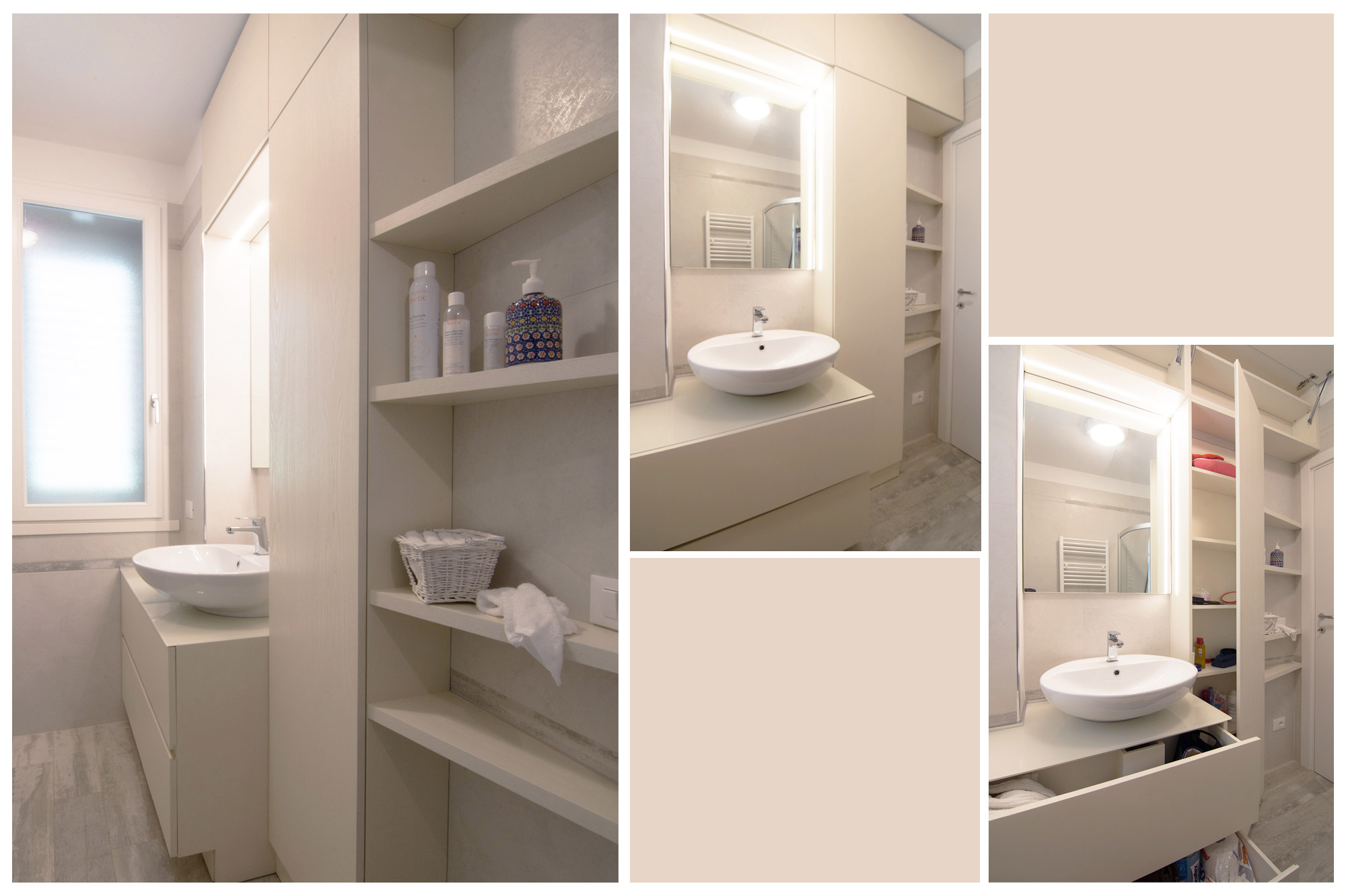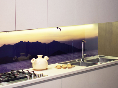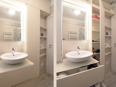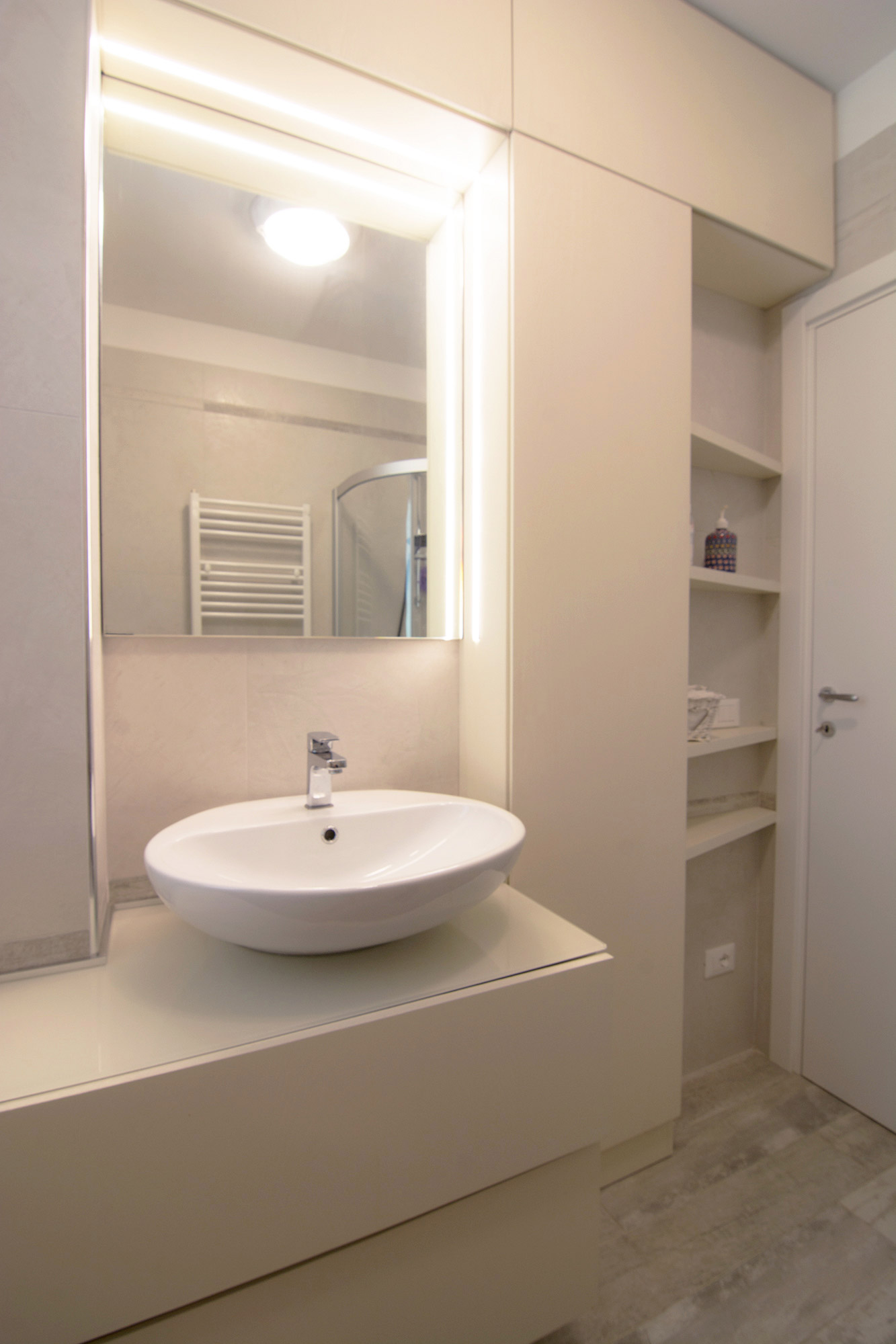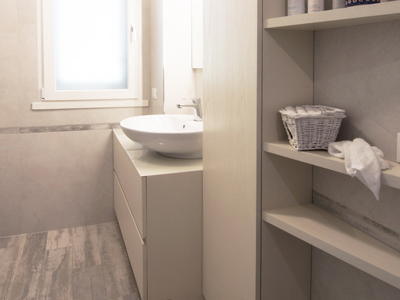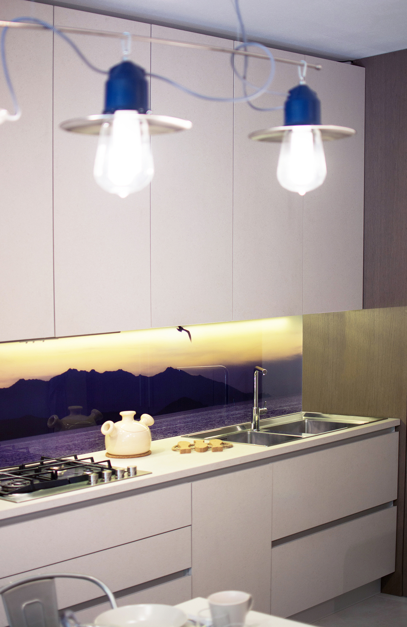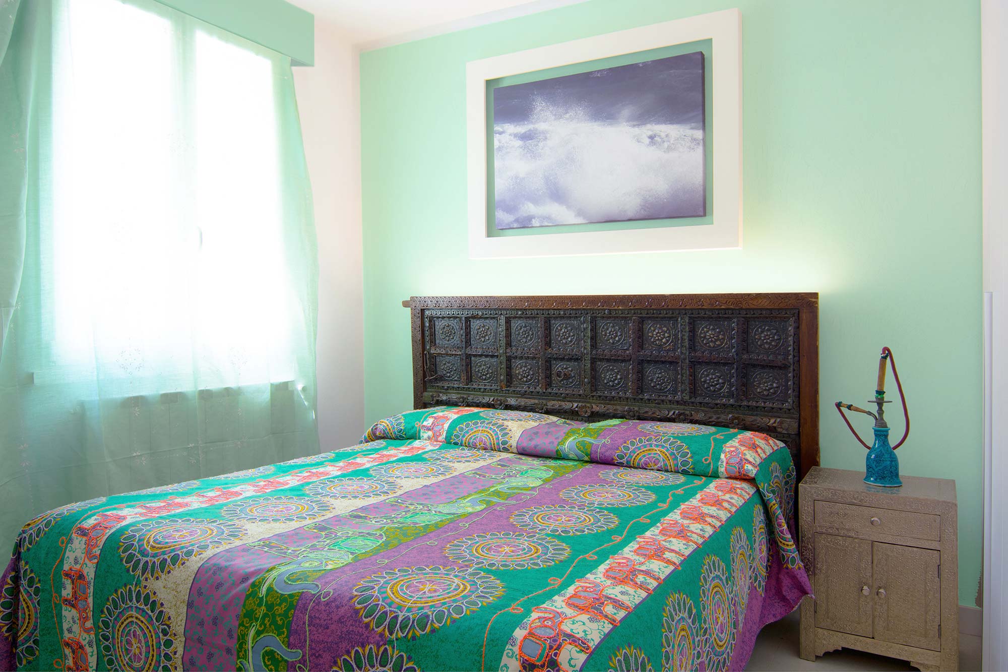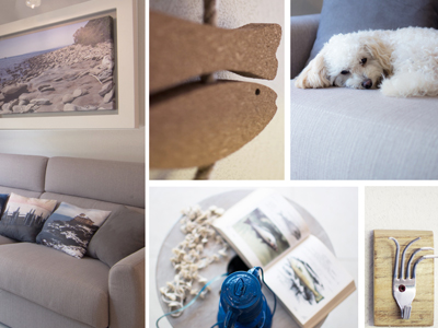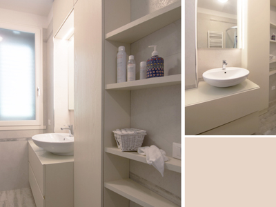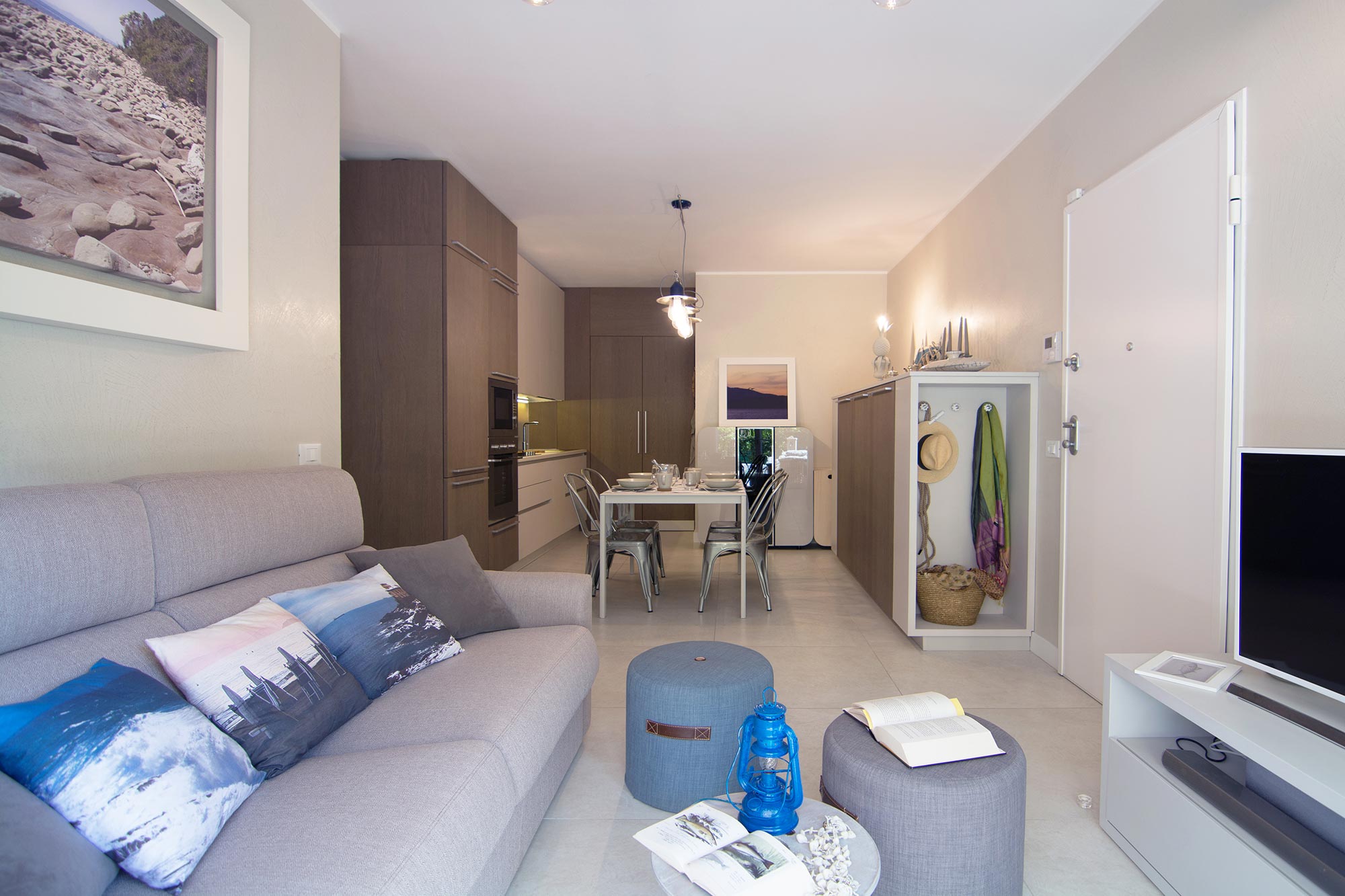 Interior design, lighting design, garden design. Our firm has handled the interiors and gardens of this small apartment on the ground floor of a building recently built in Marina di Cecina near Livorno, on the Tuscan coast. The kitchen cabinets are covered by grès large tiles and the same for the kitchen top. The splash is realized in glass with a large photograph printed on to. Similar pictures are printed and the cushions and on the canvas in the main rooms. Another peculiarity of this little apartment are the two headboards realized with two ancient reclaimed indian doors. They are really special with their decoration in relief!