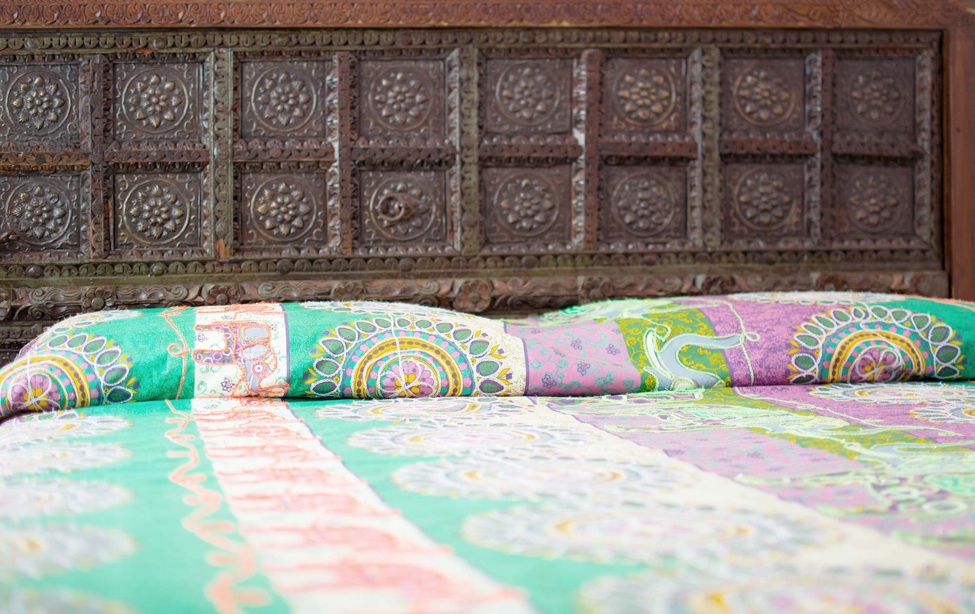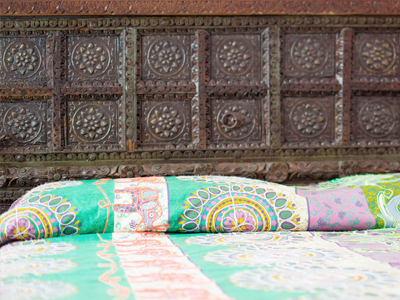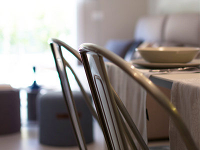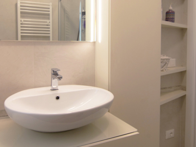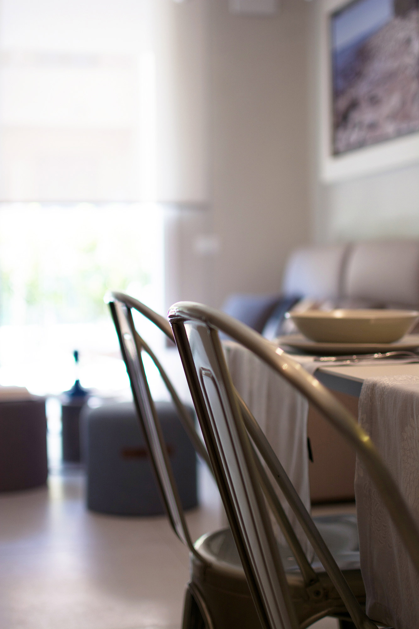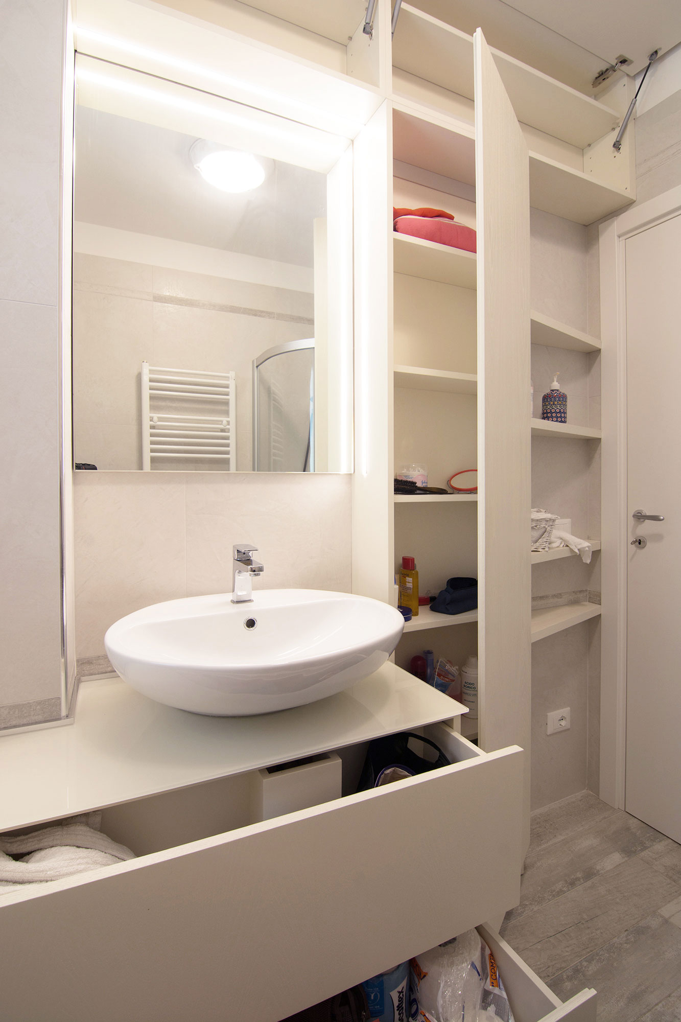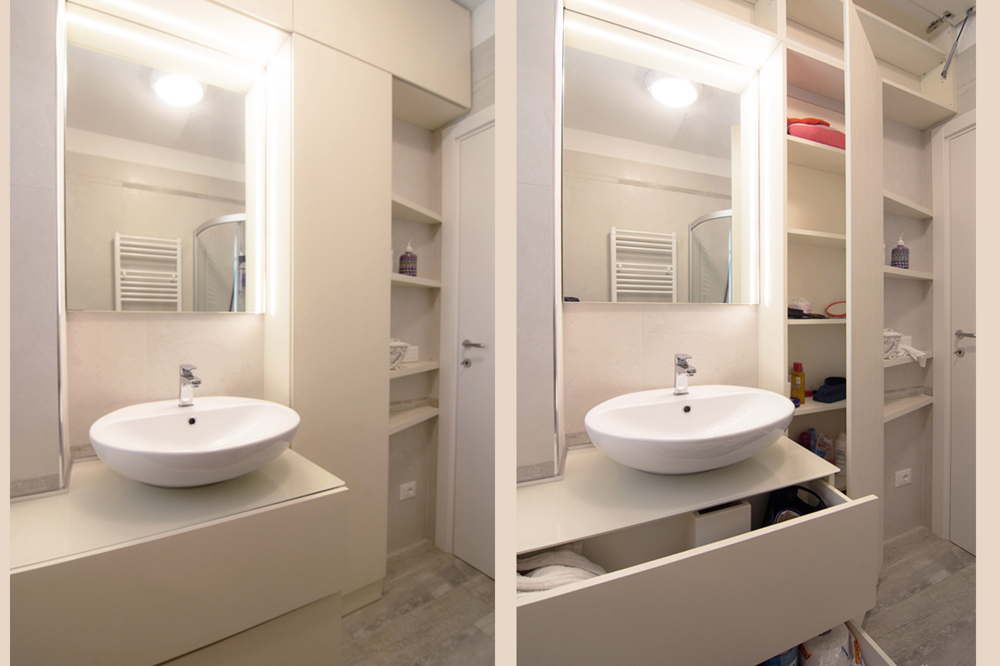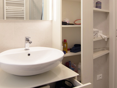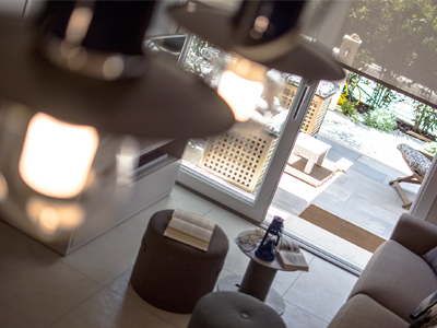 Interior design, lighting design, garden design. Our firm has handled the interiors and gardens of this small apartment on the ground floor of a building recently built in Marina di Cecina near Livorno, on the Tuscan coast. The kitchen cabinets are covered by grès large tiles and the same for the kitchen top. The splash is realized in glass with a large photograph printed on to. Similar pictures are printed and the cushions and on the canvas in the main rooms. Another peculiarity of this little apartment are the two headboards realized with two ancient reclaimed indian doors. They are really special with their decoration in relief!