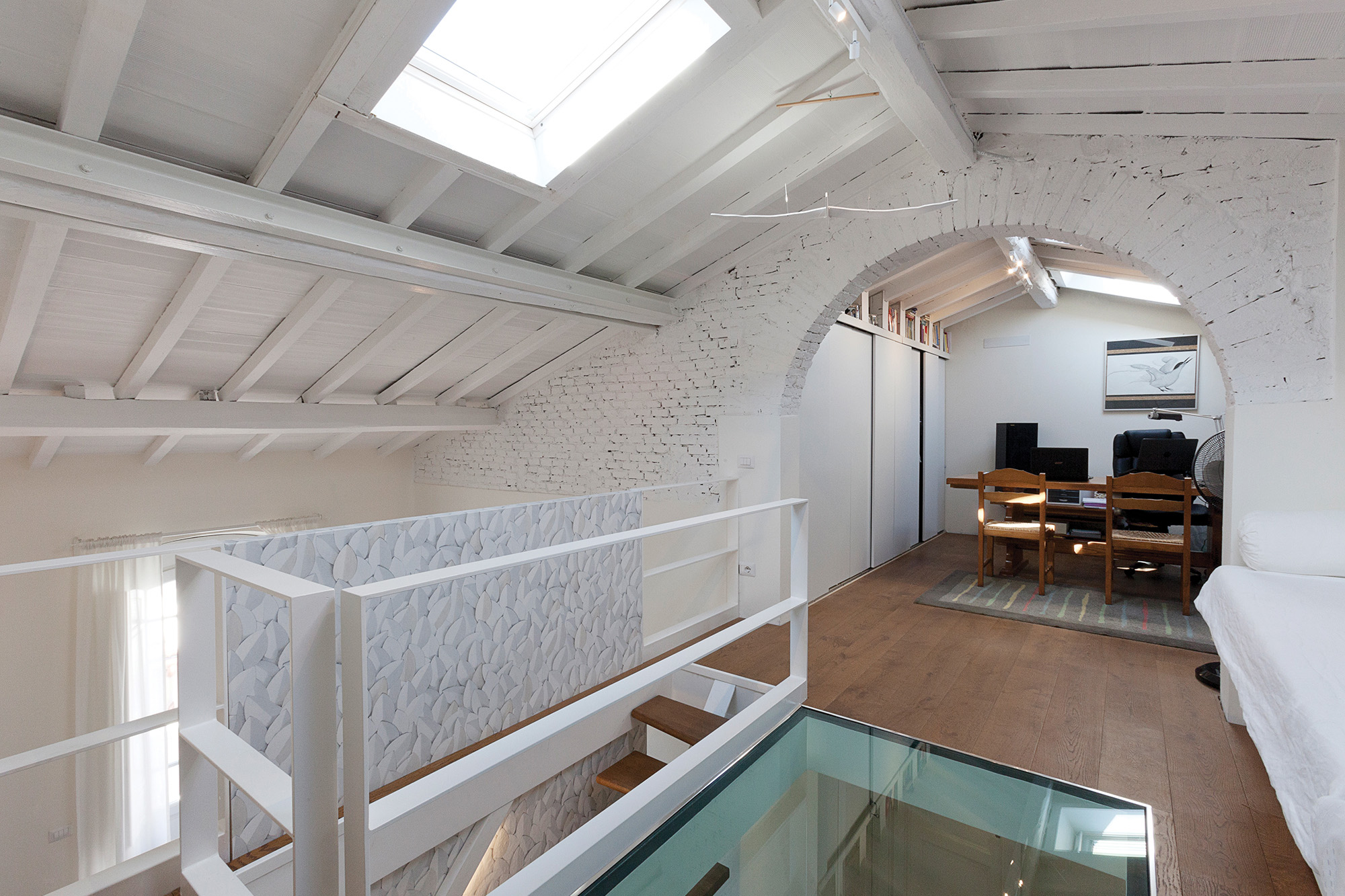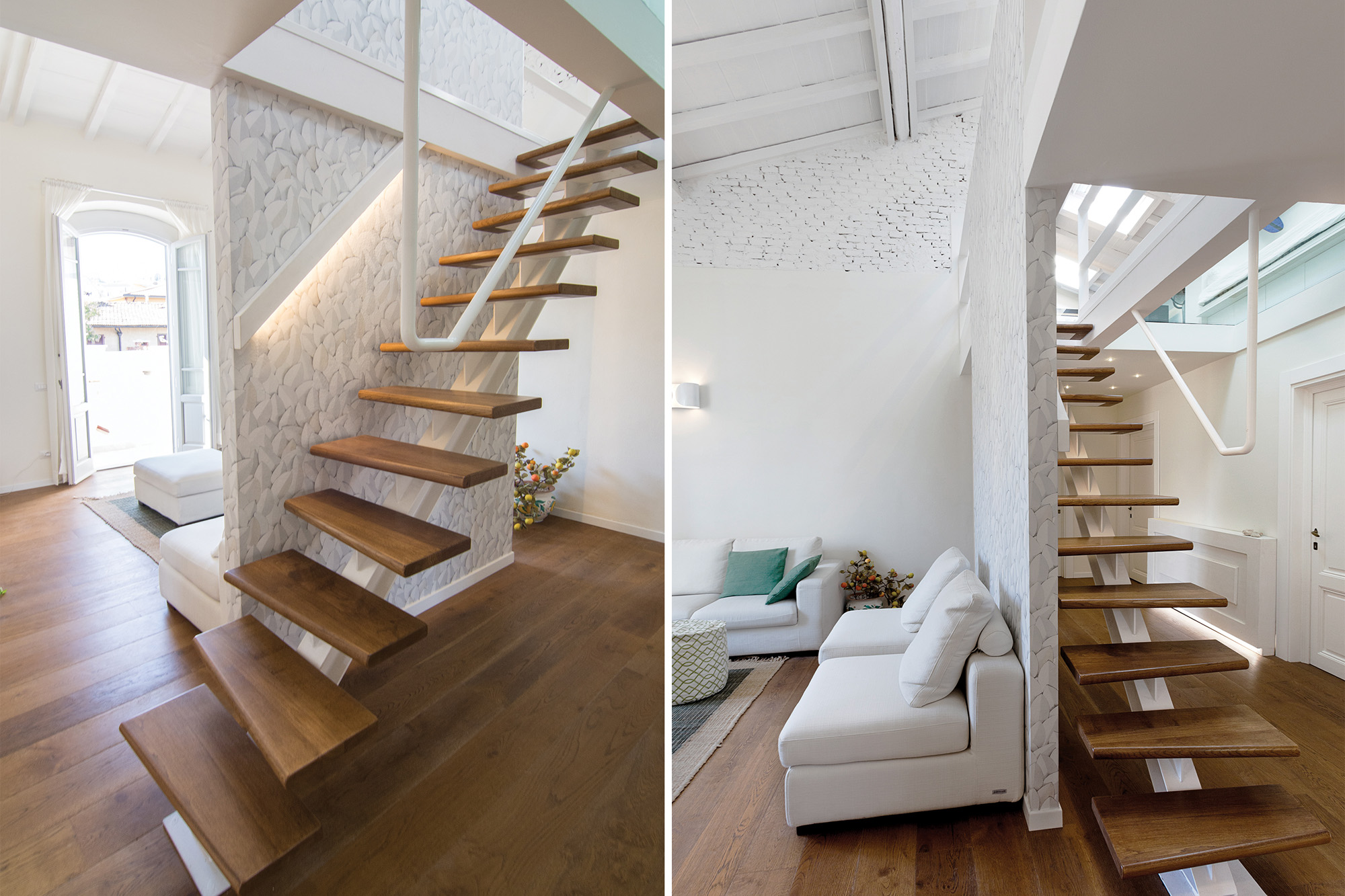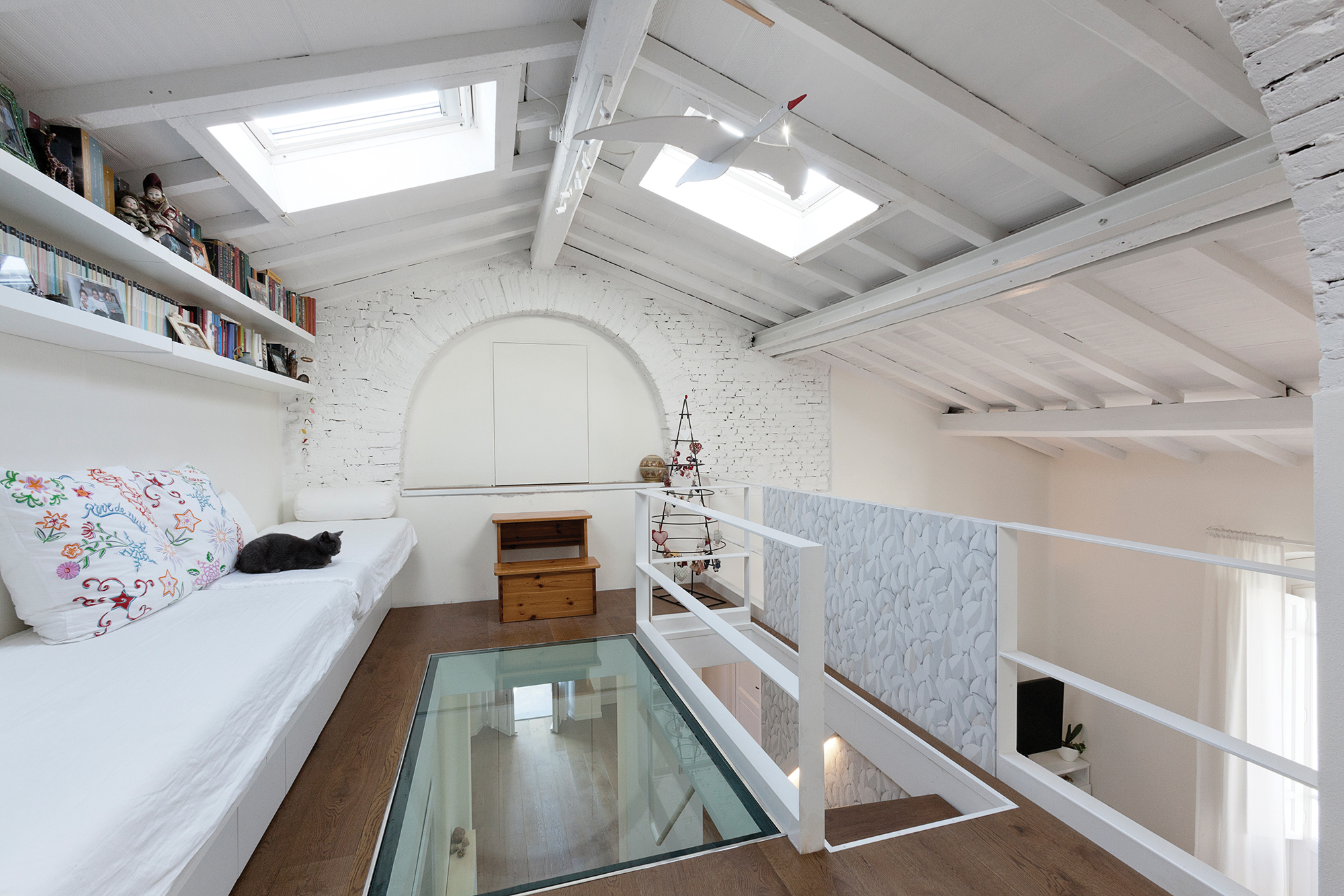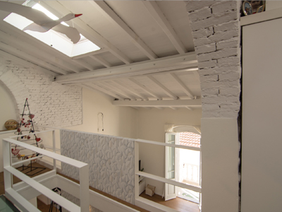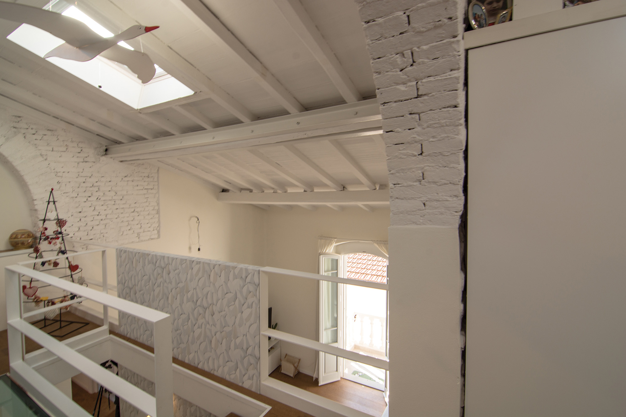 The living area on the first floor has been enlarged thanks to the abatement of the false ceiling and the idea of leaving exposed the beams and the tables as well as the old bricks and white paint was immediately welcomed by the buyers but immediately found a host of opponents who do not hesitate to say their opinion is not required. Given the final result both me and my customers would redo this choice a thousand and a thousand times again!