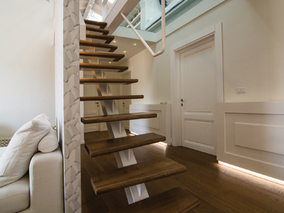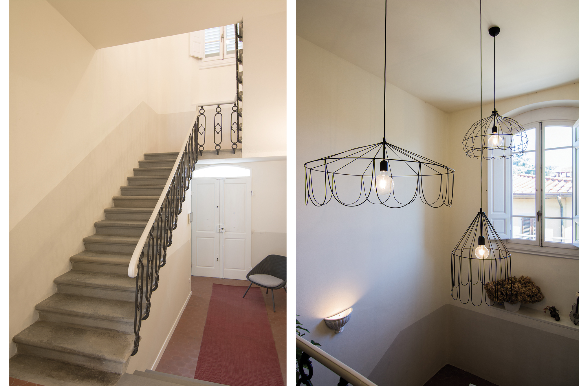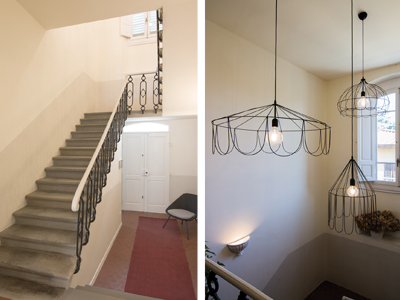 Great attention was paid to lighting and some lamps (such as the wired lamps of the stairwell) were designed by our studio and made specifically for this house, they had to be light and ethereal like the landlady who with her elegance and lightness brought a touch of class throughout the home.