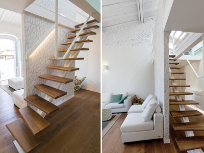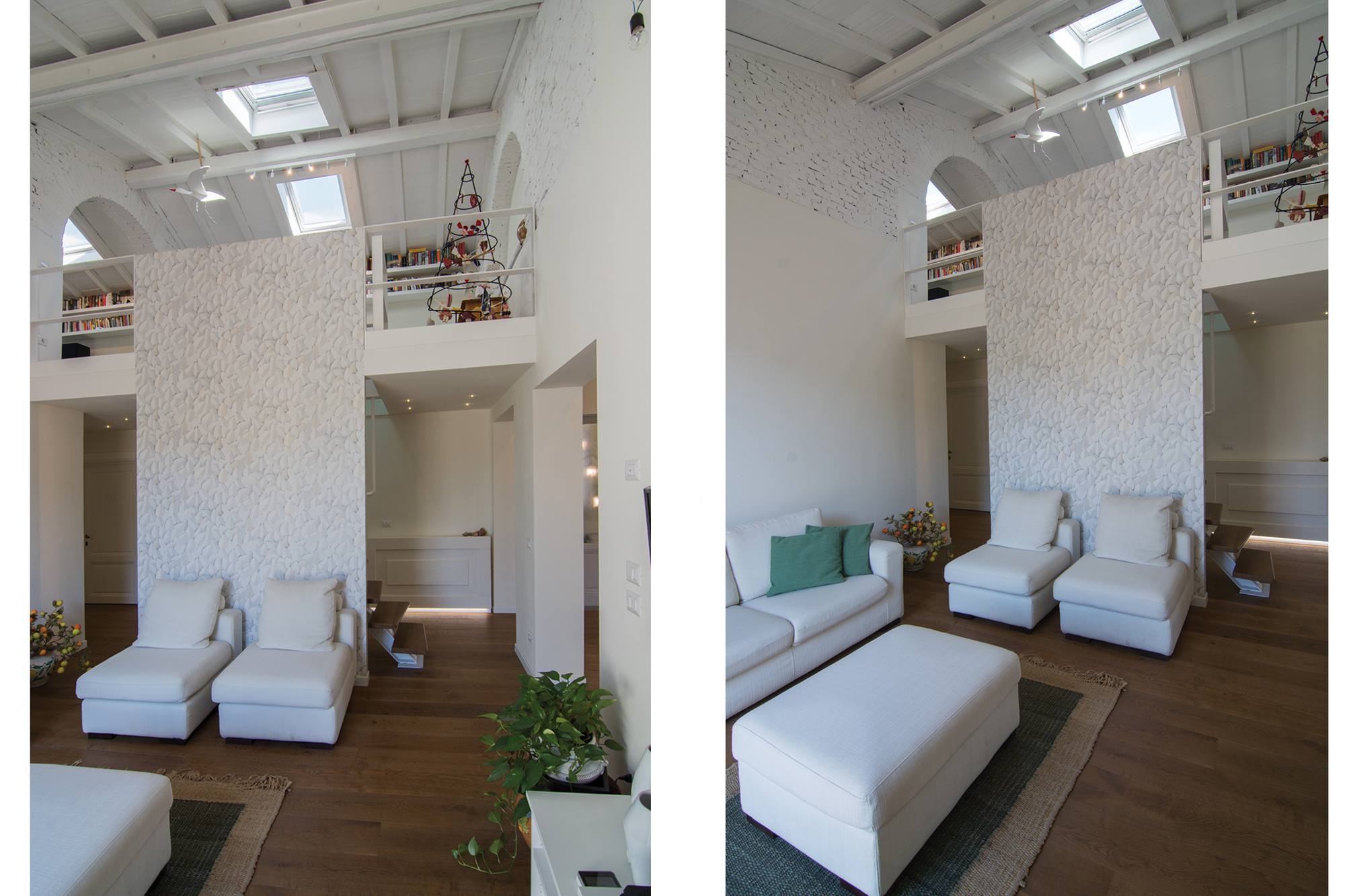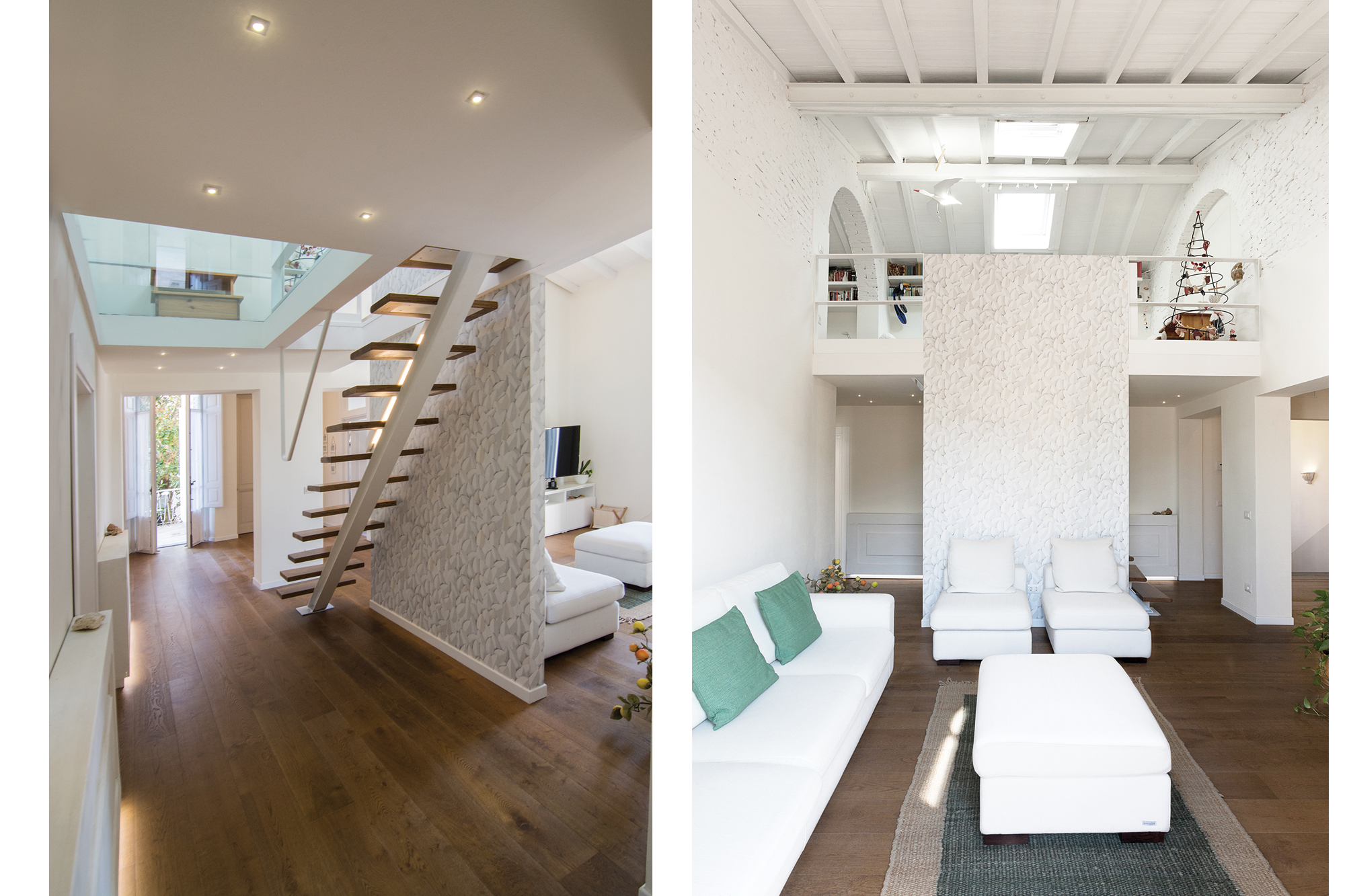 The interiors have been designed respecting the eclectic taste of the customers who did not want a cold and aseptic house so they were used in light but warm colors and finishes with materials that characterize all the interior of the villa. Many of the furnishings were made on a project and the landlord, who has a passion for do-it-yourself, has created the fake masonry kitchen, all the beds in the house and other objects such as the corridor boisierie first floor while the other elements such as the iron and wood staircase that connects the mezzanine and the first floor were made by our trusted craftsmen.