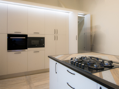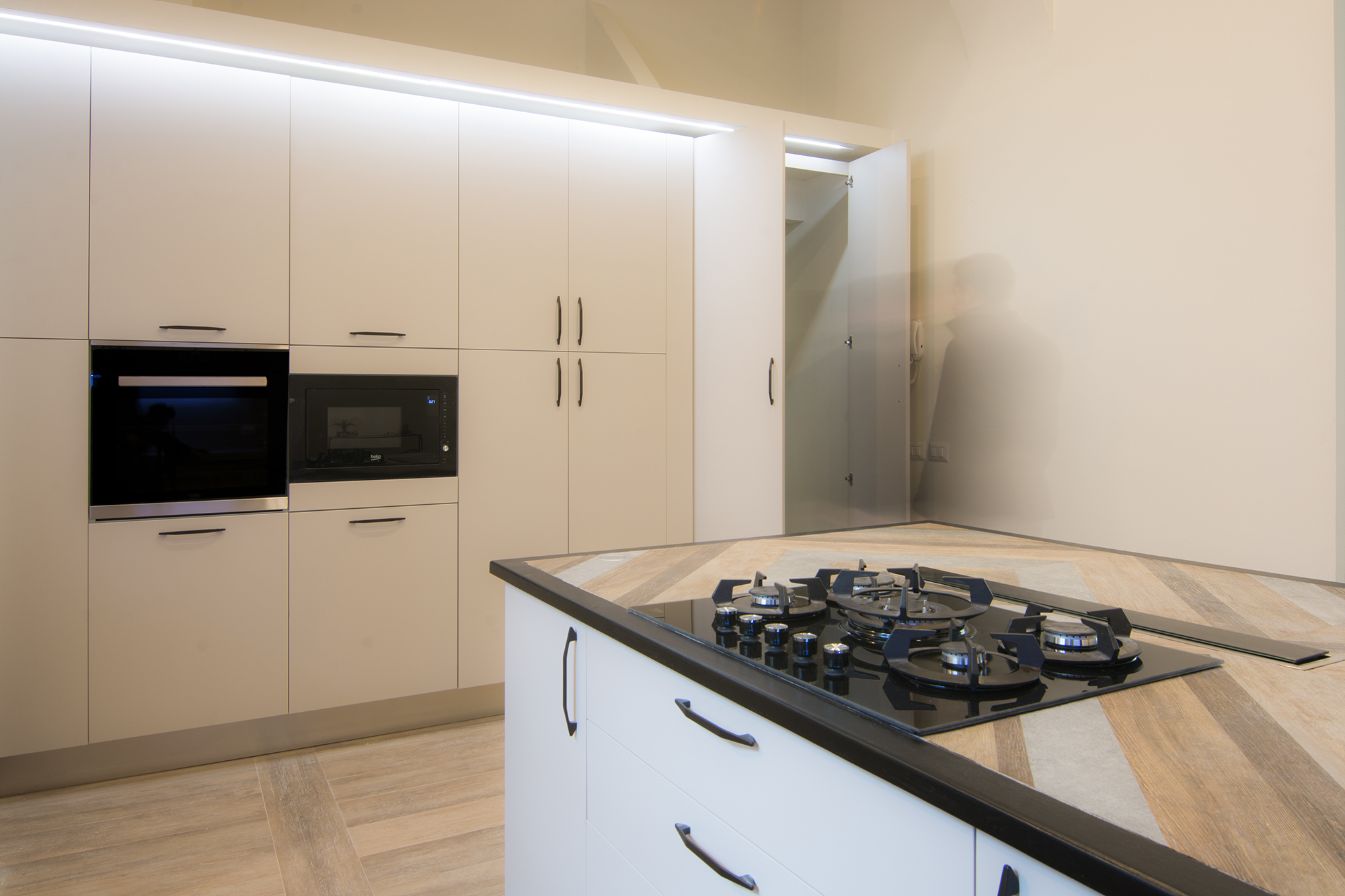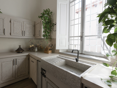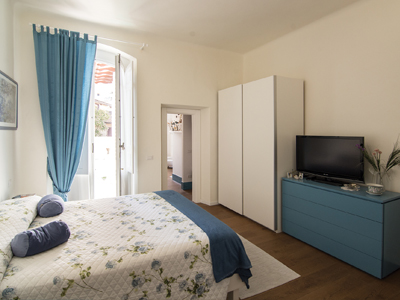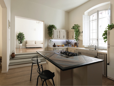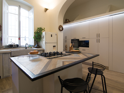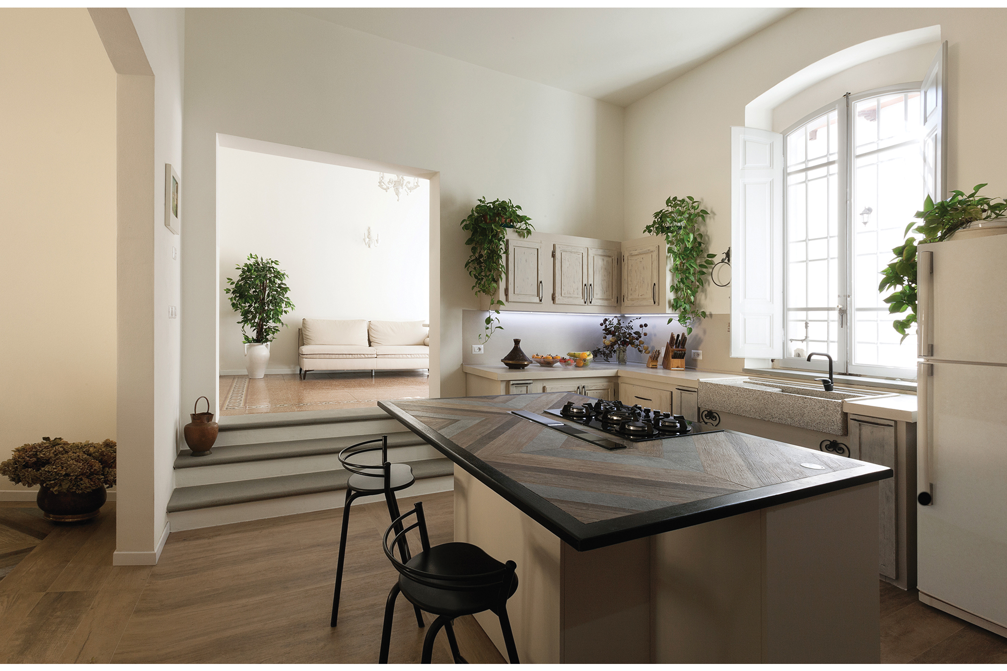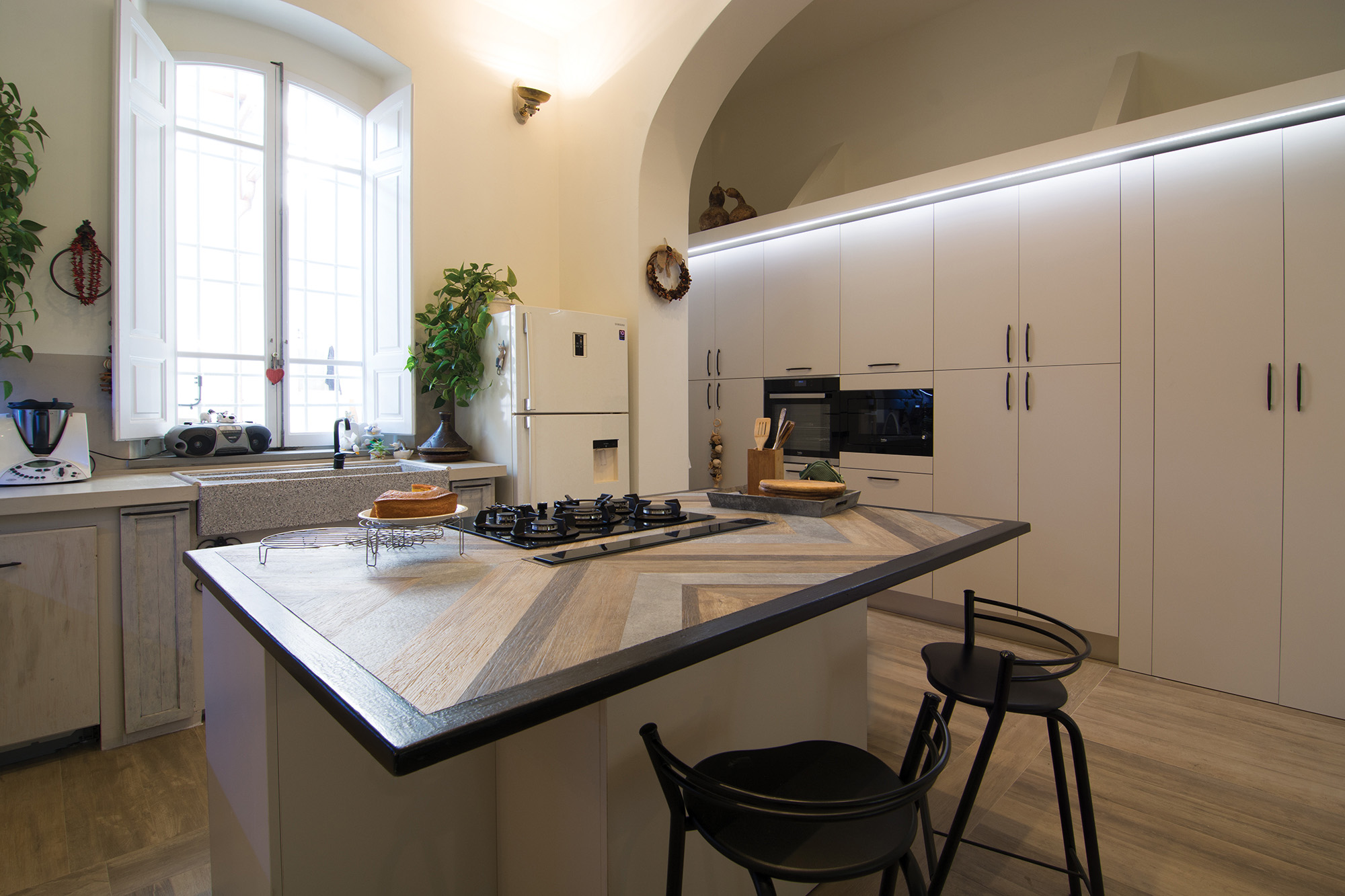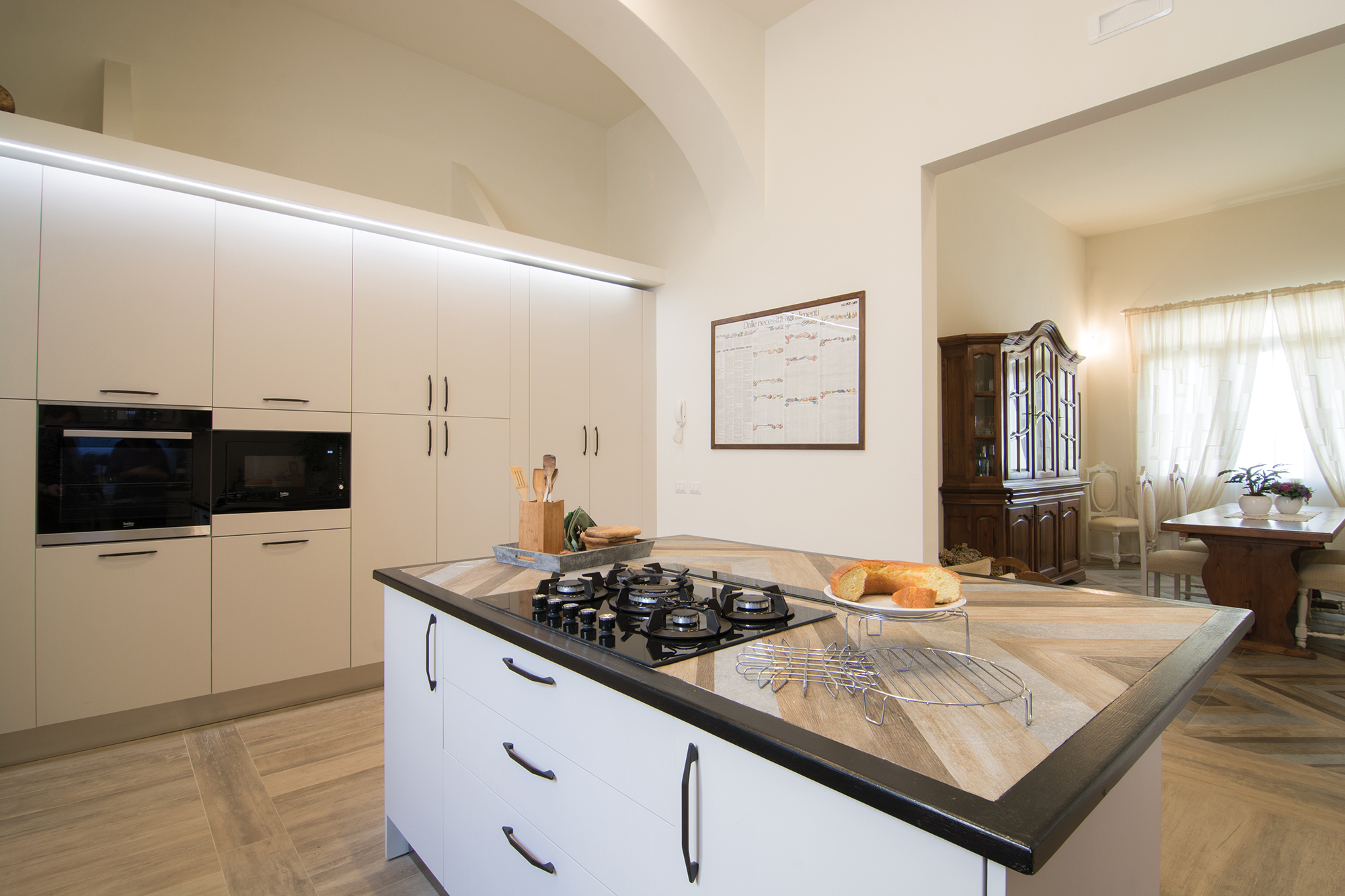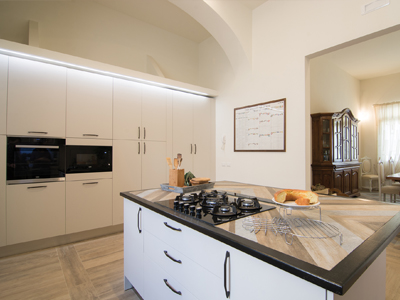 The large kitchen on the ground floor is "L" under the window and has a large island in the middle of the room that houses the fuichi and the retractable hood. The floor of the island is covered with the same ceramic tiles of Ceramiche Caesar that have been mounted on the floor throughout the ground floor, which unfortunately due to problems of rising damp that we could not completely solve was chosen instead of traditional parquet. The wall of the kitchen furnished with ovens and pantry columns also hides a door that separates it from the ground floor hallway leading to a large guest bedroom, a closet and the largest bathroom in the house.