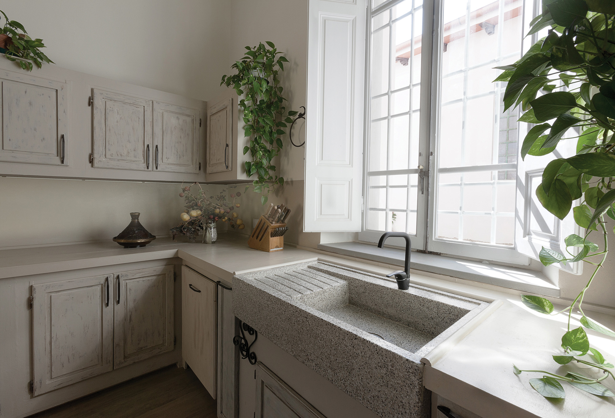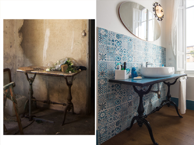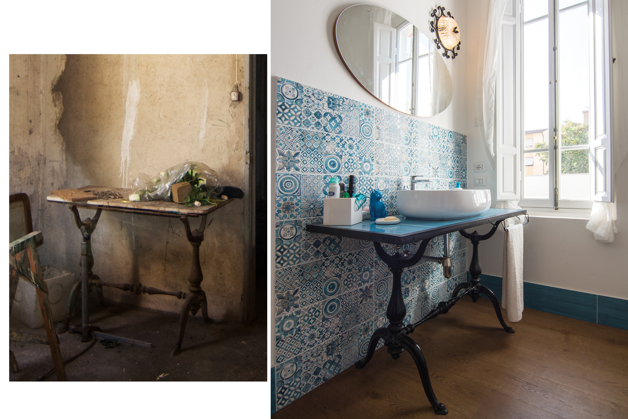 The recovery was the dominant theme of this restructuring: even the side table of the bathroom bowl of the master bedroom was made from an object recovered in the villa. The same applies to the pictures in the dining room and in the kitchen as a testimony to the past from the doctor's office in the country of the land of the house.