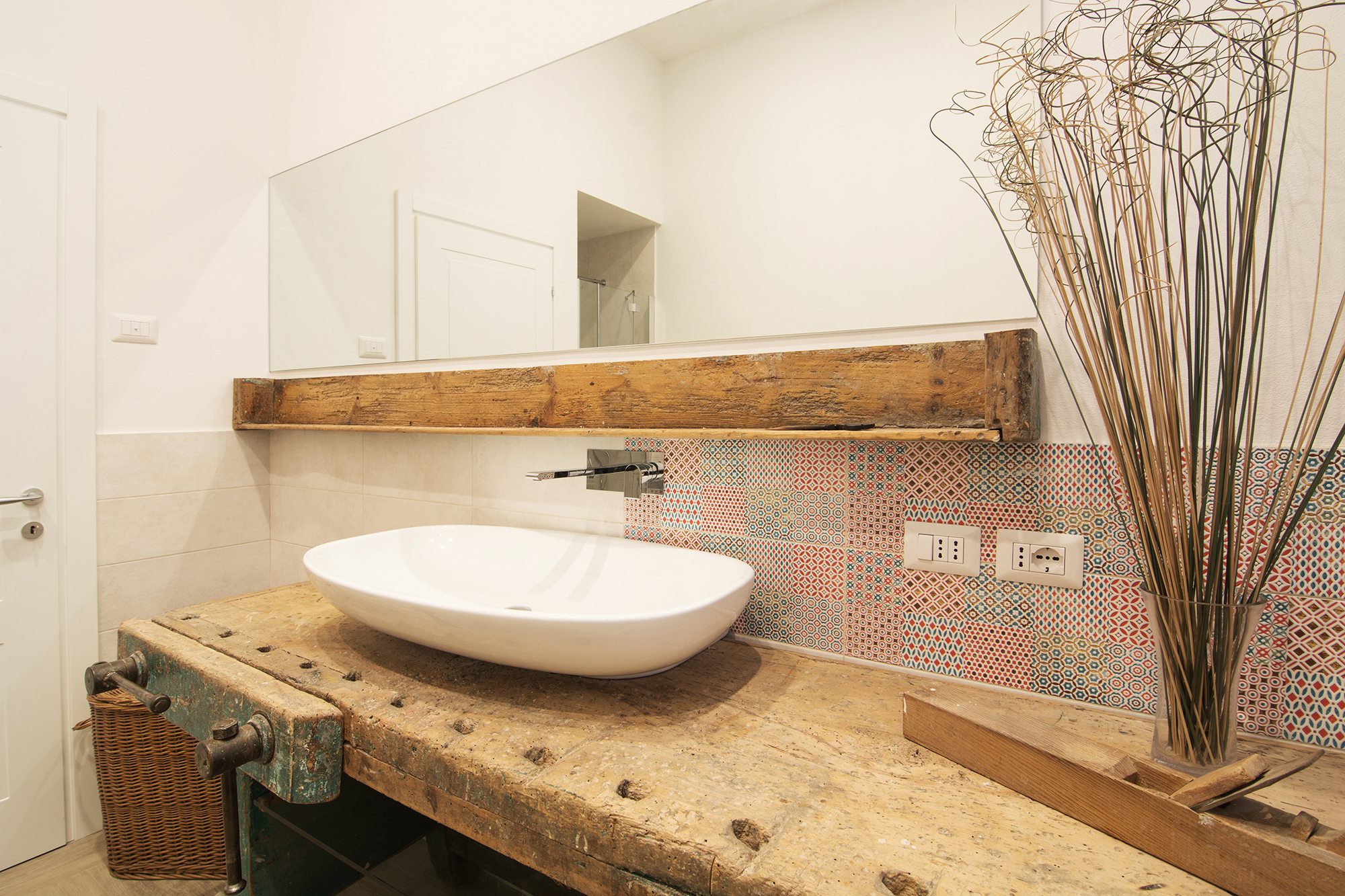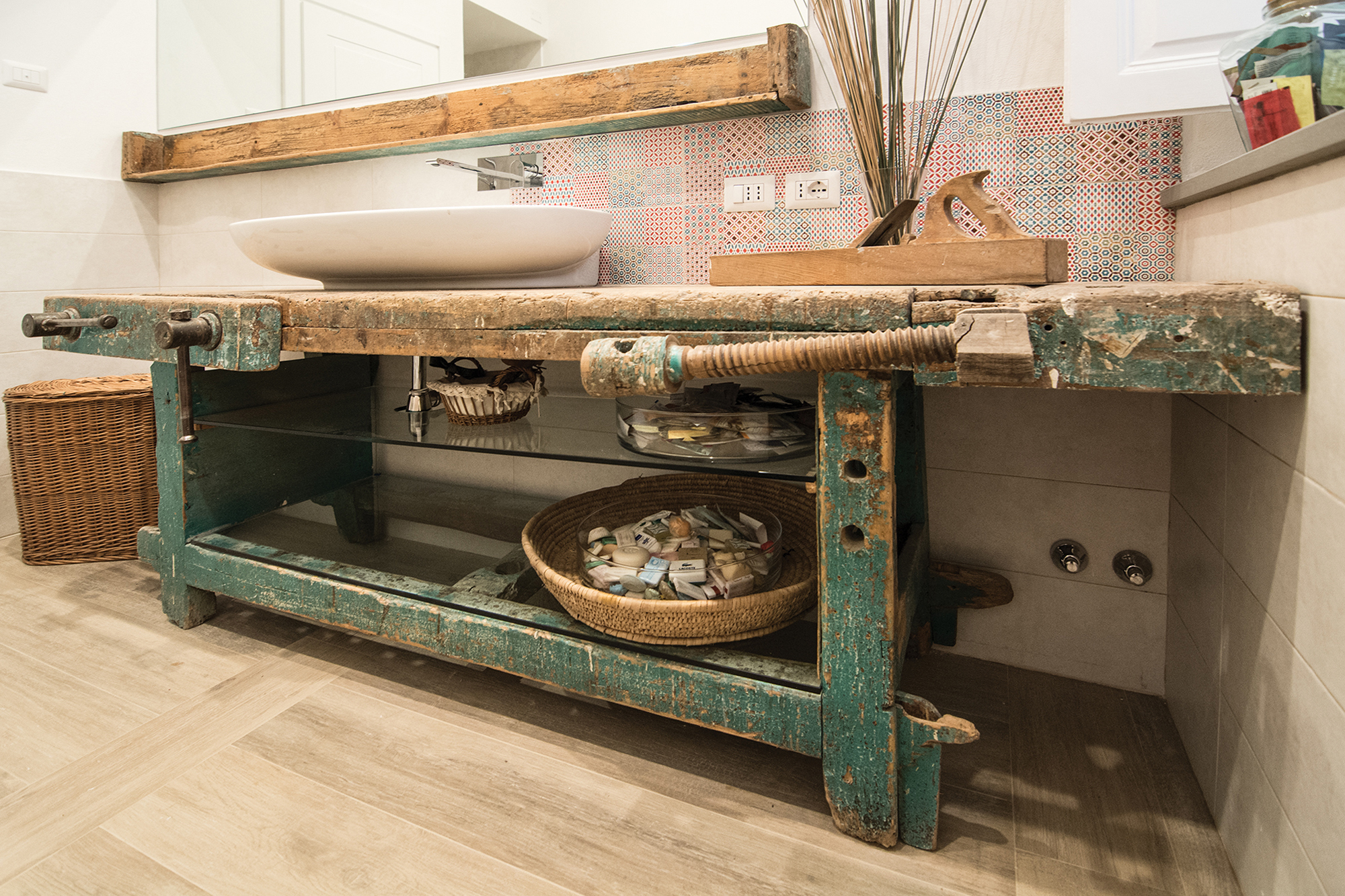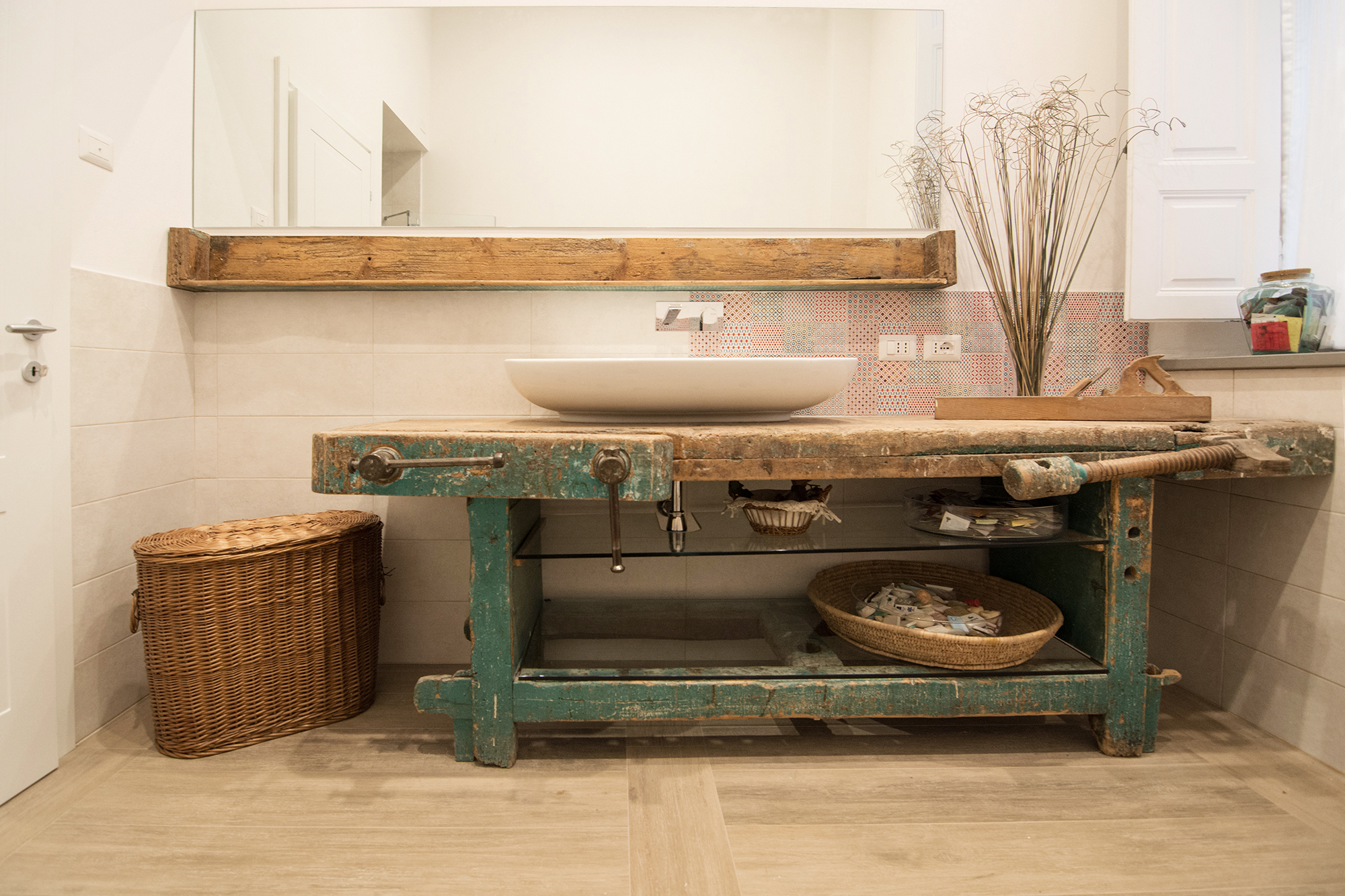 Just this bathroom houses an old carpenter's table, heirloom of the hostess's family, which we have cleaned up (but not too much!) And used as a huge countertop for the grandiose Nuda Flaminia washbasin with its 95 cm of length seems to disappear in such a table. The shelf that runs the full length of the mirror was made by removing the cash-box at the table that otherwise would not have entered the huge bathroom.
