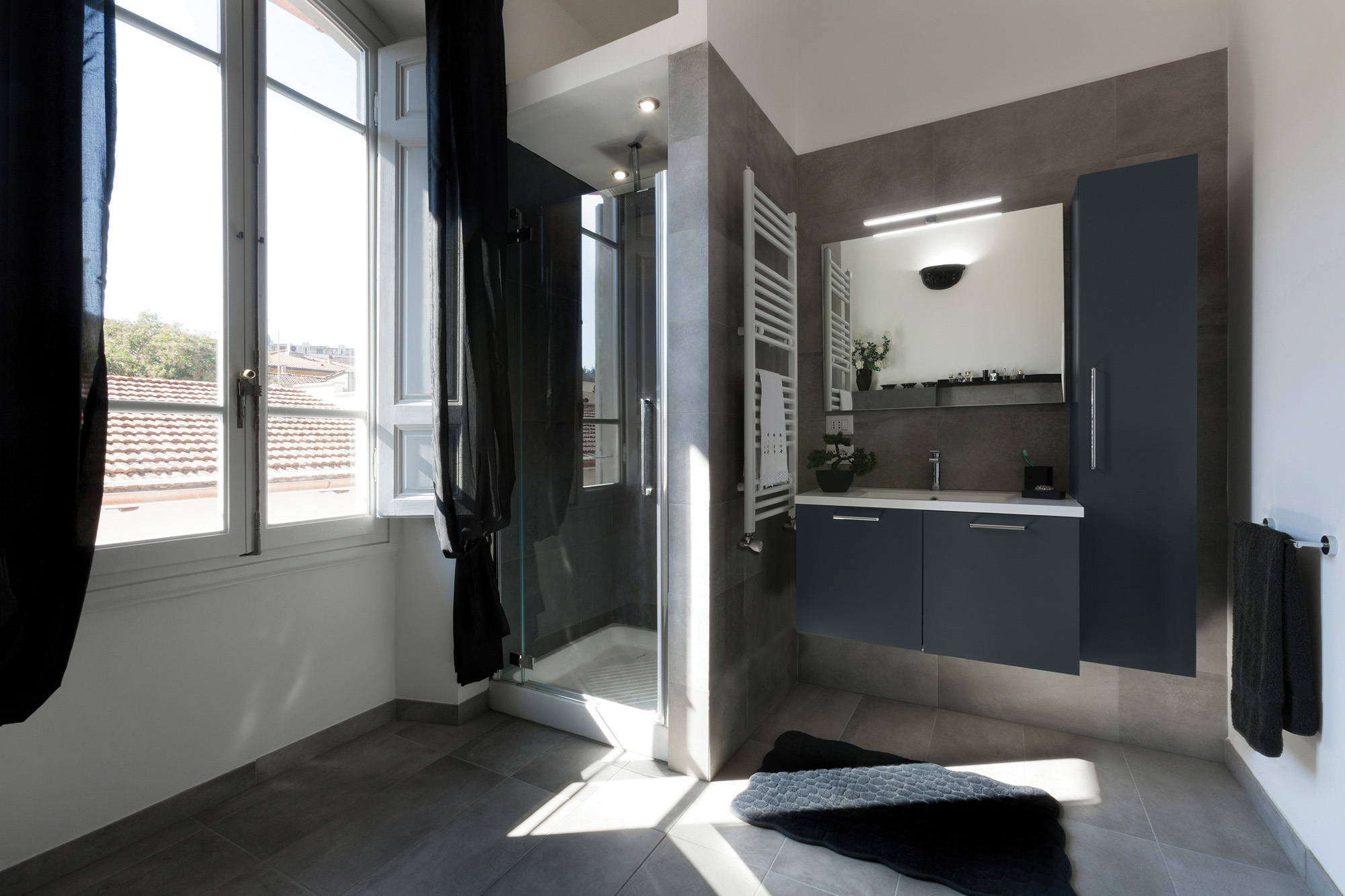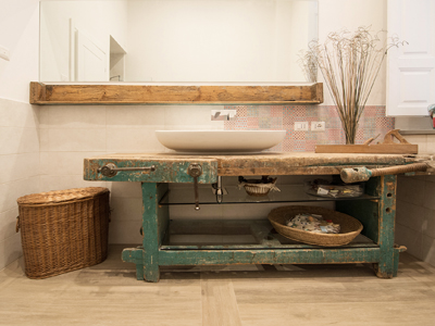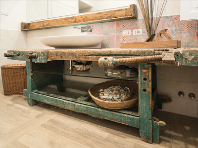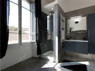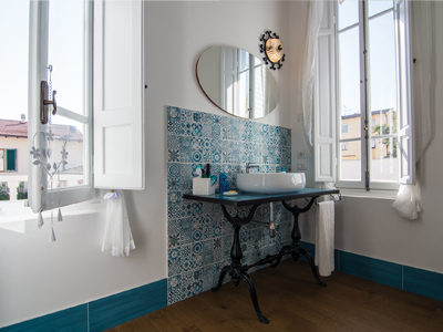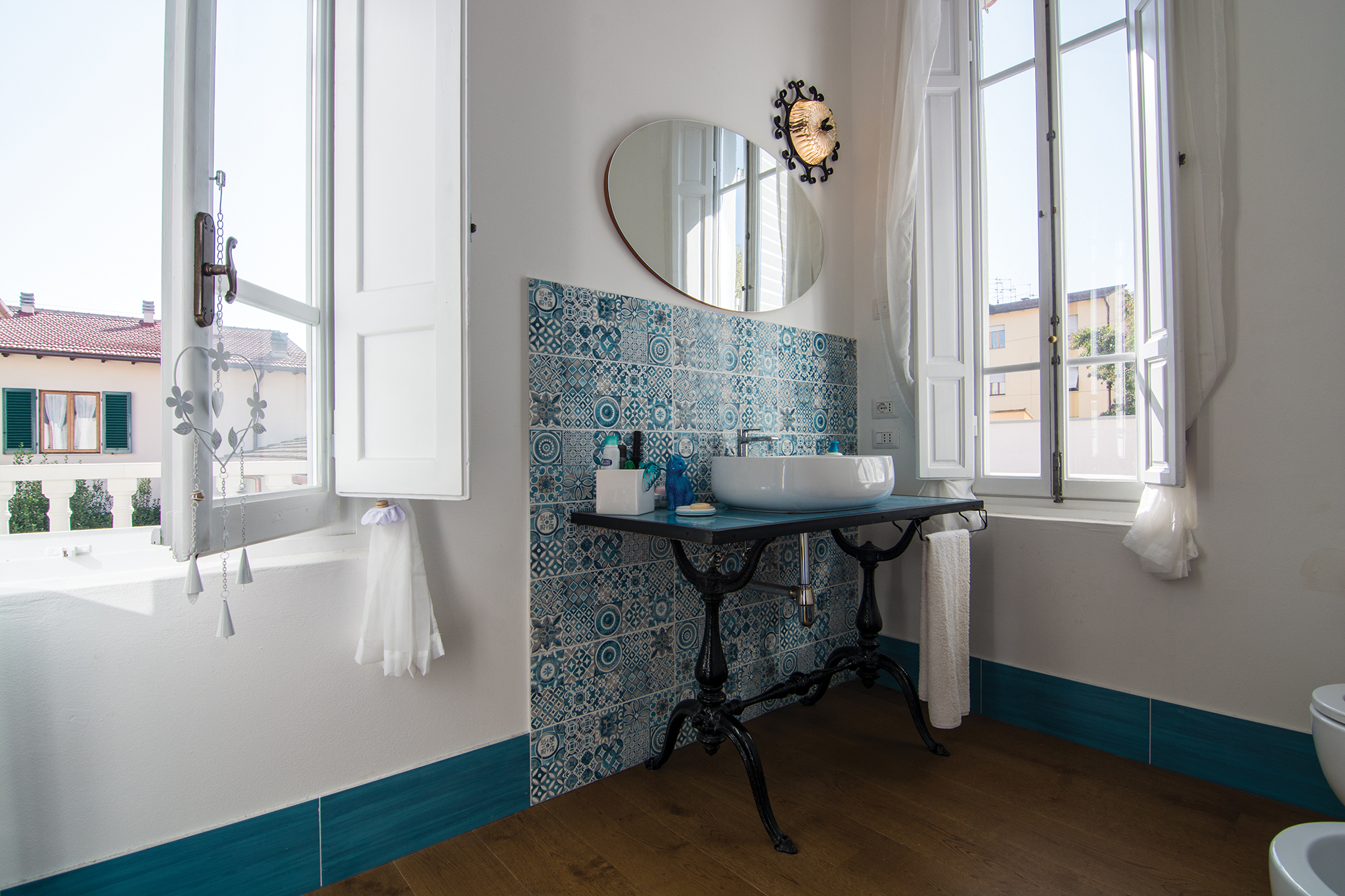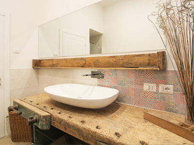 Just this bathroom houses an old carpenter's table, heirloom of the hostess's family, which we have cleaned up (but not too much!) And used as a huge countertop for the grandiose Nuda Flaminia washbasin with its 95 cm of length seems to disappear in such a table. The shelf that runs the full length of the mirror was made by removing the cash-box at the table that otherwise would not have entered the huge bathroom.
