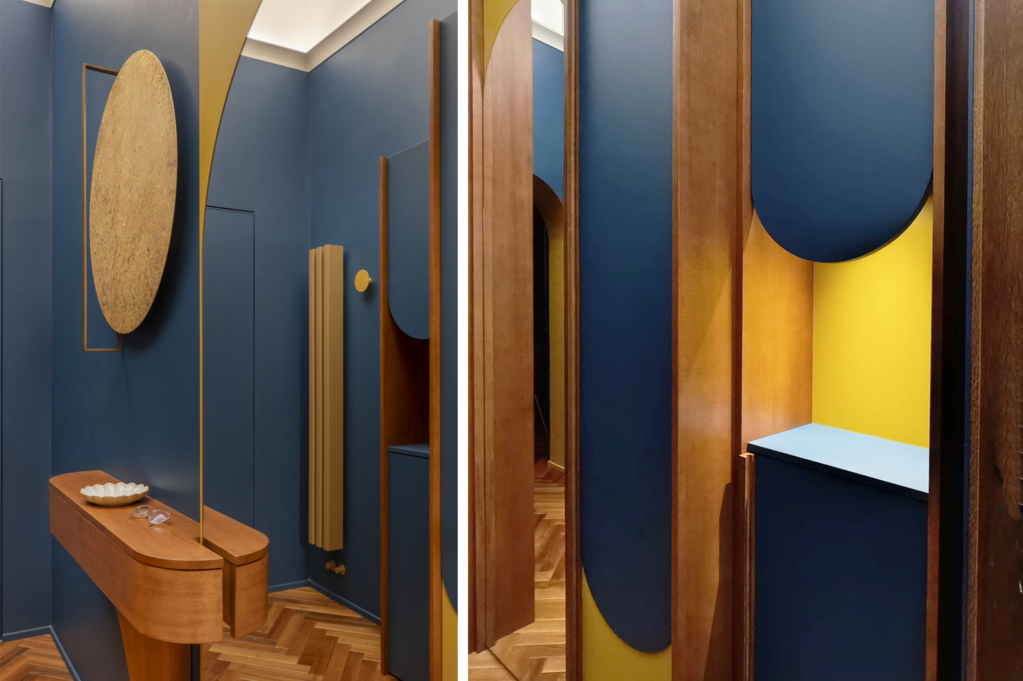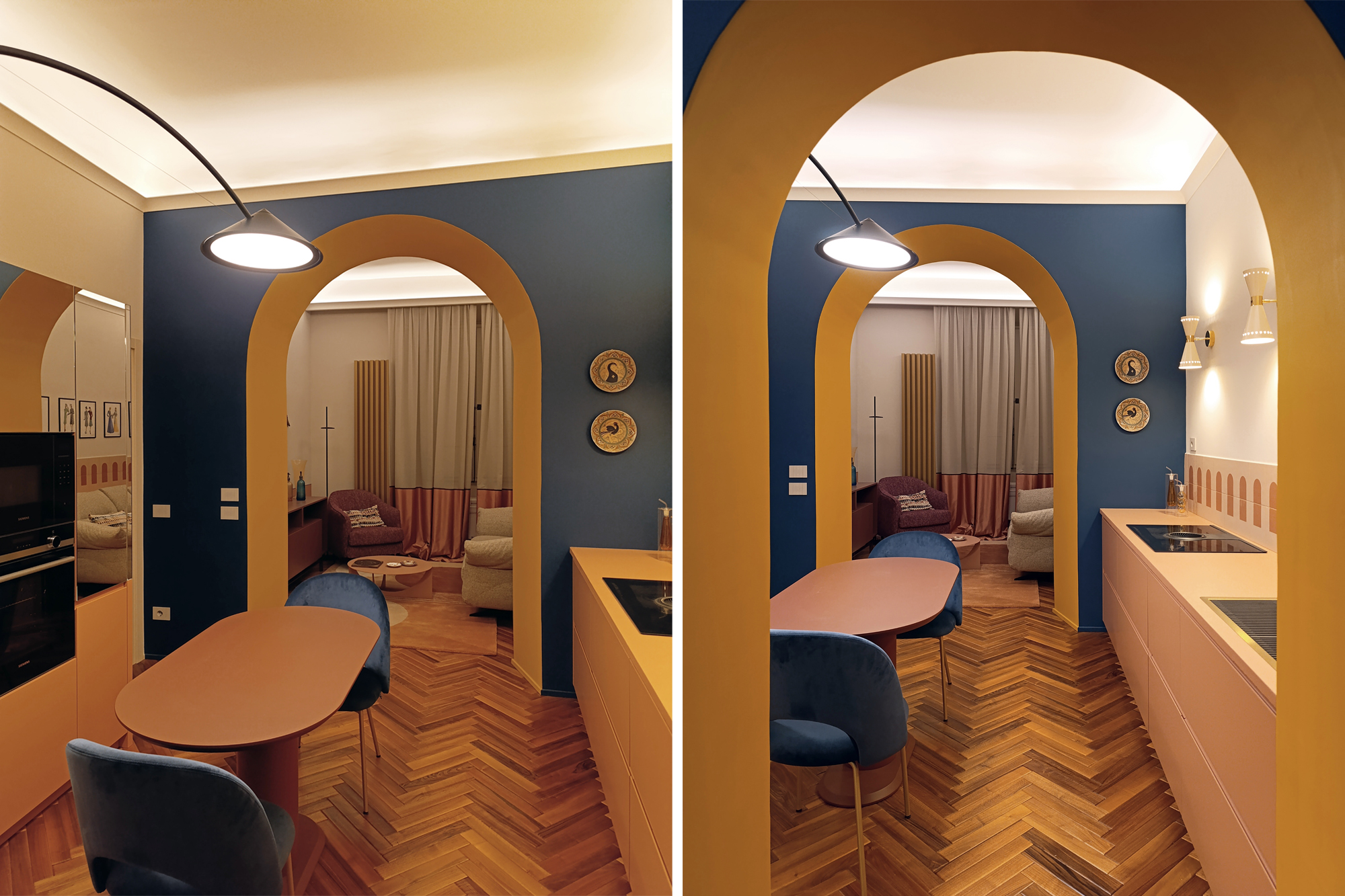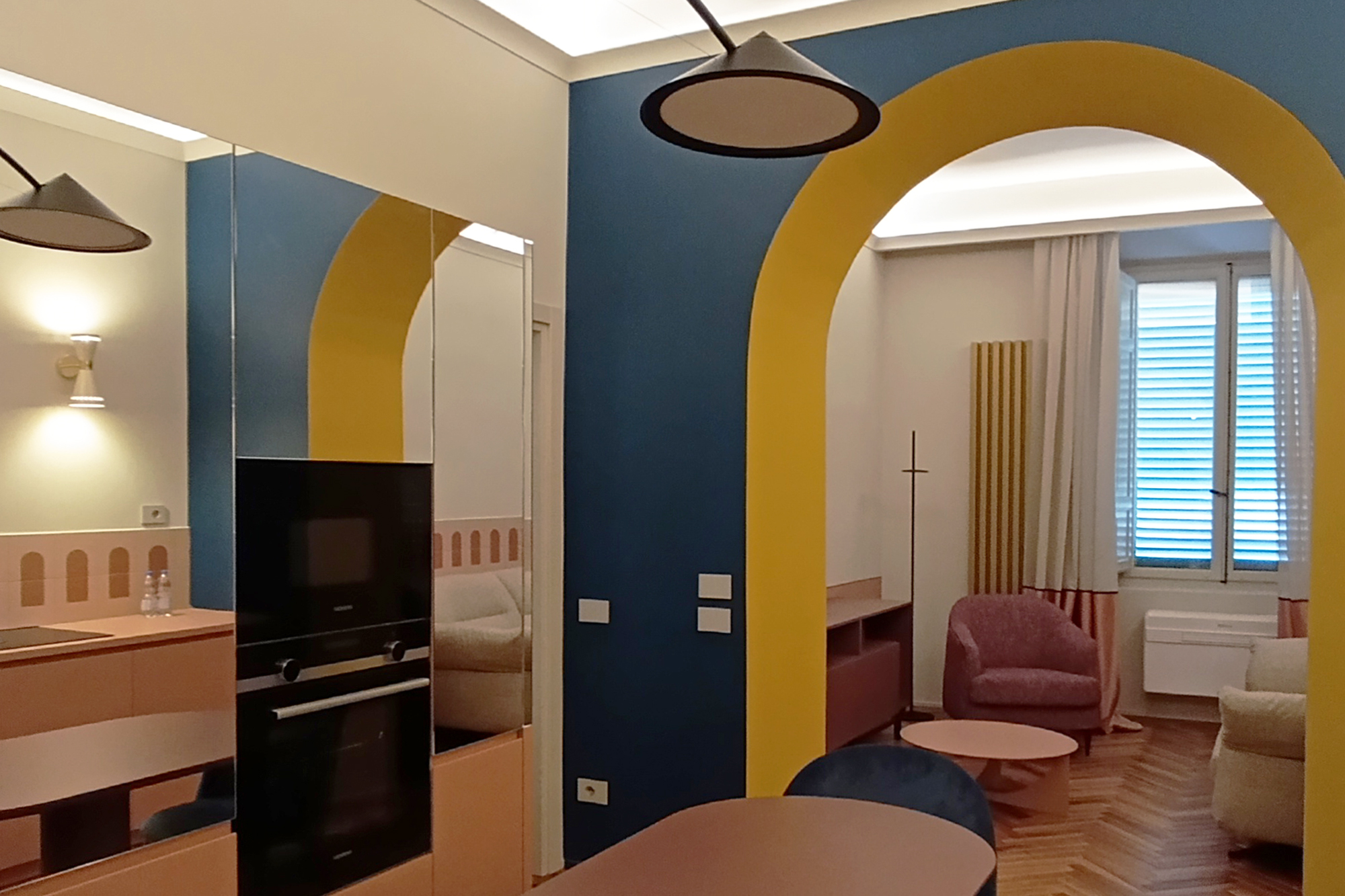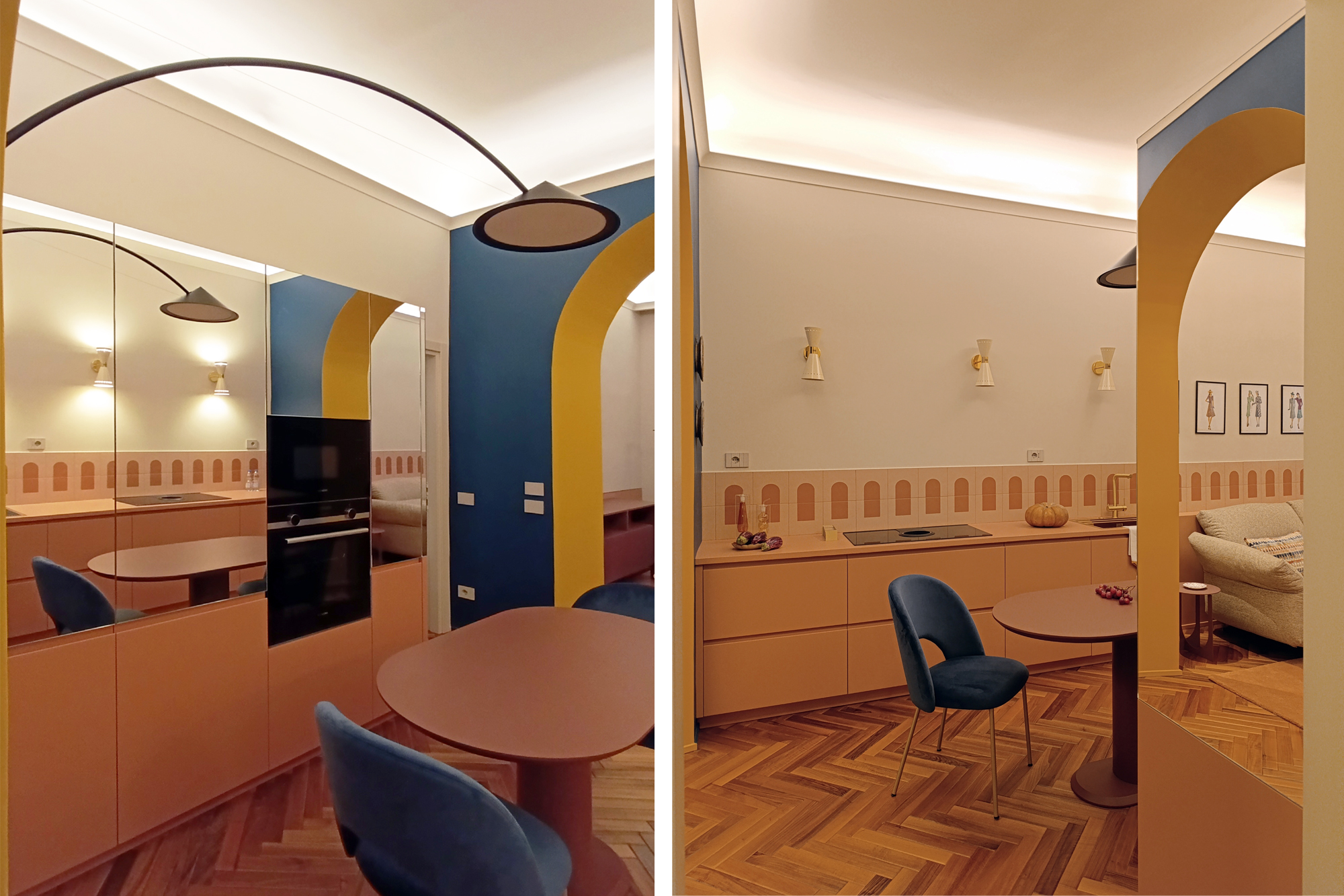 I veri protagonisti di questo appartamento oltre ai colori sono gli arredi su misura: tutti su disegno della progettista ad eccezione di letto, divani e armadio della camera. Gli arredi sono realizzati da due diverse falegnamerie ed utilizzano parti laccate alternate a parti in noce che dialogano col parquet. Gli archi e gli archetti ne scandiscono il passo in un mix equilibrato di funzionalità ed estetica. Nota sul colore: come potete vedere in questo appartamento l’uso del colore è fondamentale perché definisce le forme e contribuisce a scandire lo spazio, a riequilibrare e creare qualcosa di veramente UNICO. La prima proposta fatta ai Committenti ha avuto fin da subito un riscontro estremamente positivo.