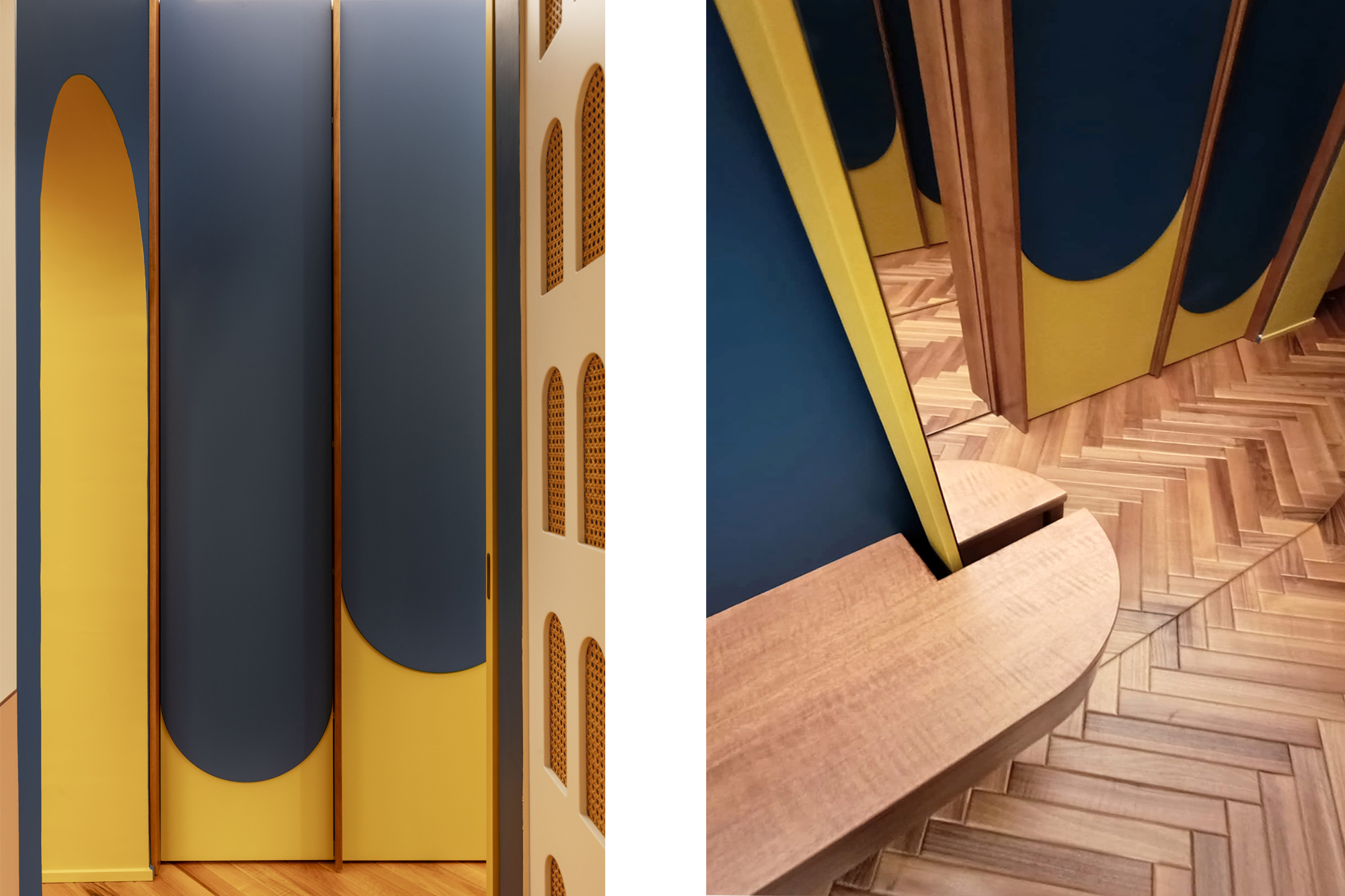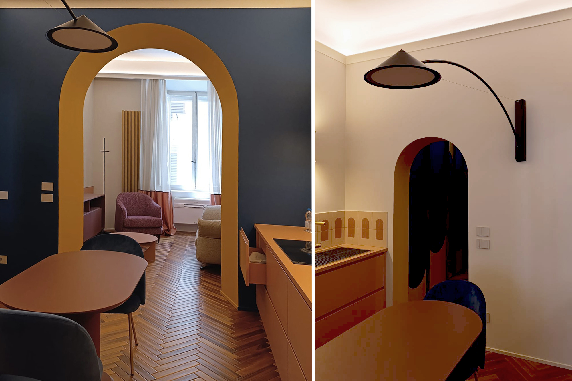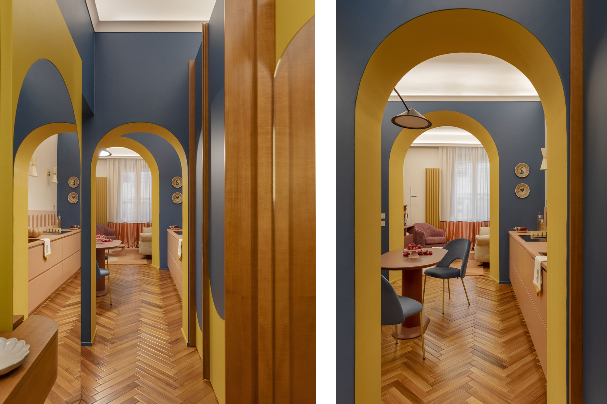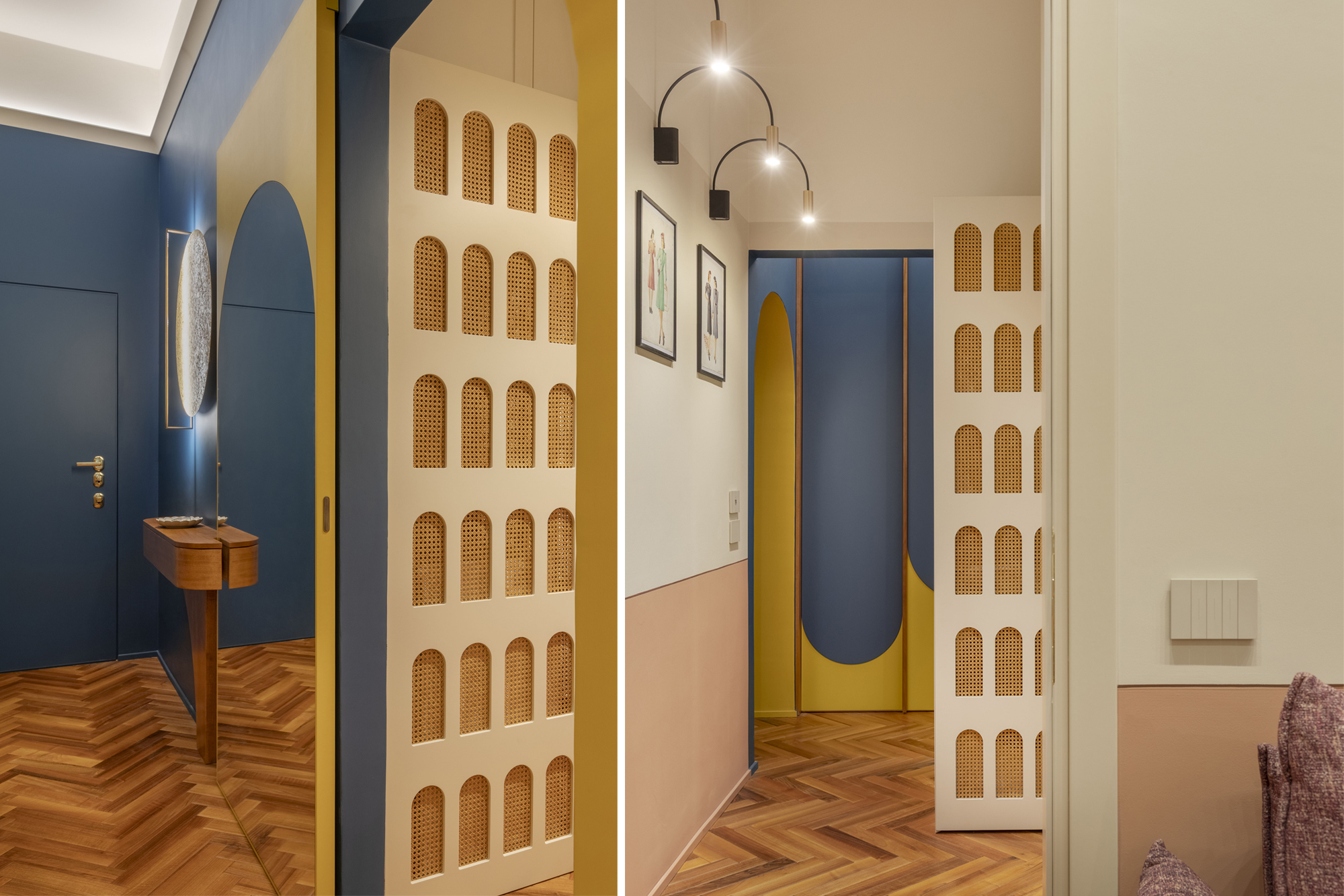 I veri protagonisti di questo appartamento oltre ai colori sono gli arredi su misura: tutti su disegno della progettista ad eccezione di letto, divani e armadio della camera. Gli arredi sono realizzati da due diverse falegnamerie ed utilizzano parti laccate alternate a parti in noce che dialogano col parquet. Gli archi e gli archetti ne scandiscono il passo in un mix equilibrato di funzionalità ed estetica. Nota sul colore: come potete vedere in questo appartamento l’uso del colore è fondamentale perché definisce le forme e contribuisce a scandire lo spazio, a riequilibrare e creare qualcosa di veramente UNICO. La prima proposta fatta ai Committenti ha avuto fin da subito un riscontro estremamente positivo.