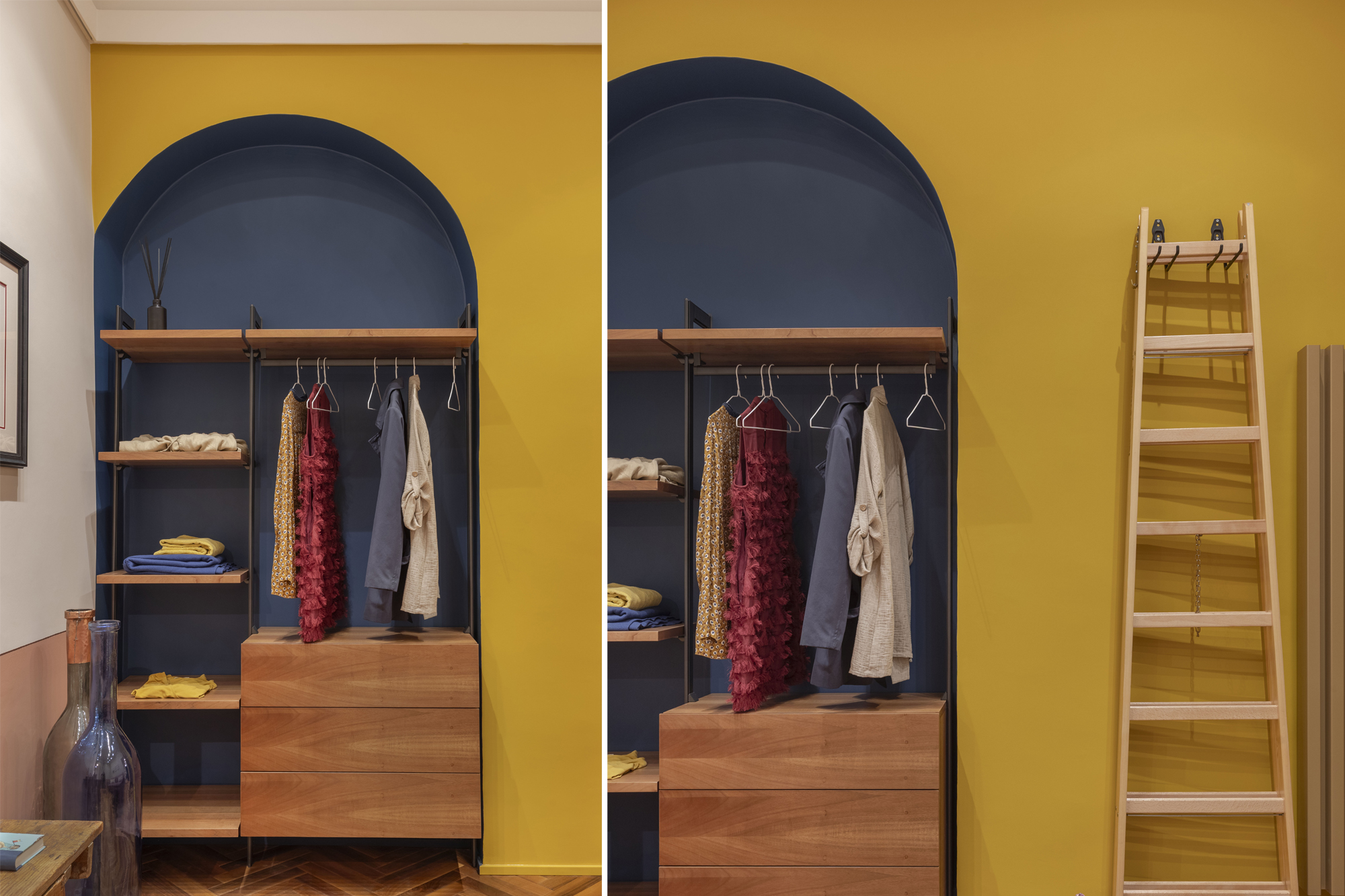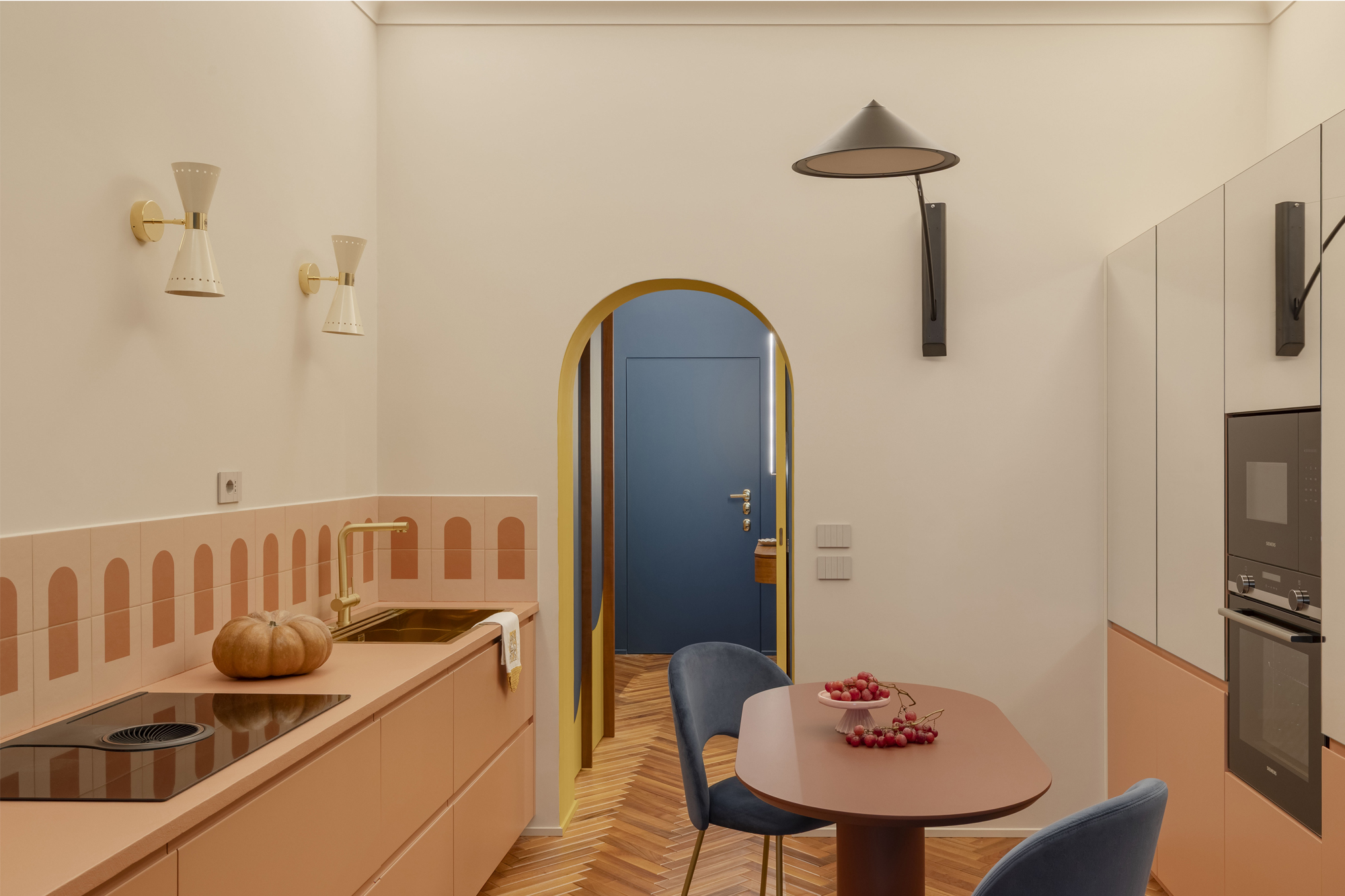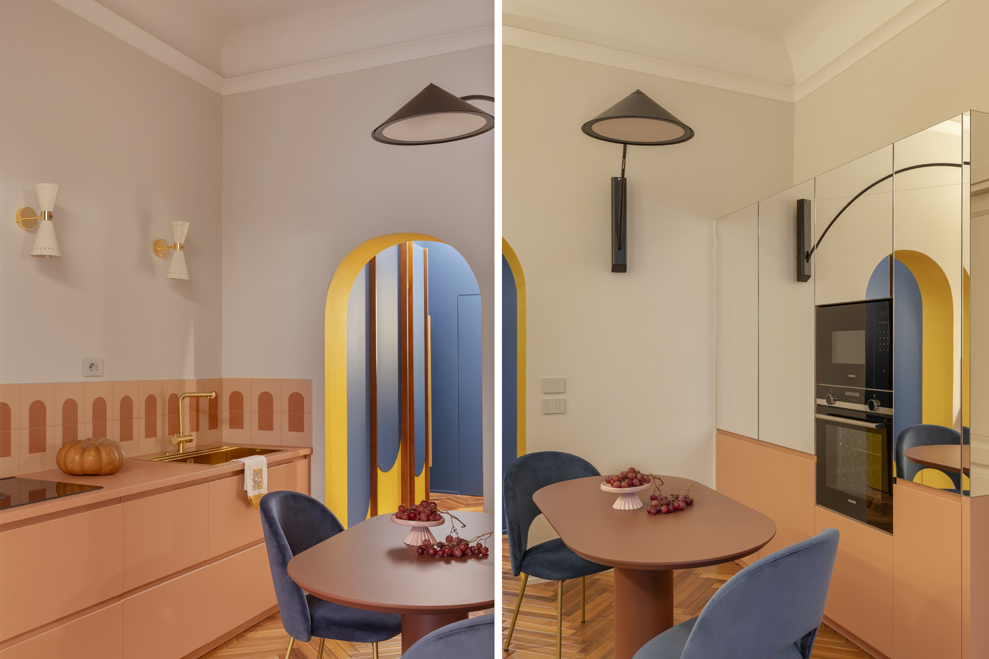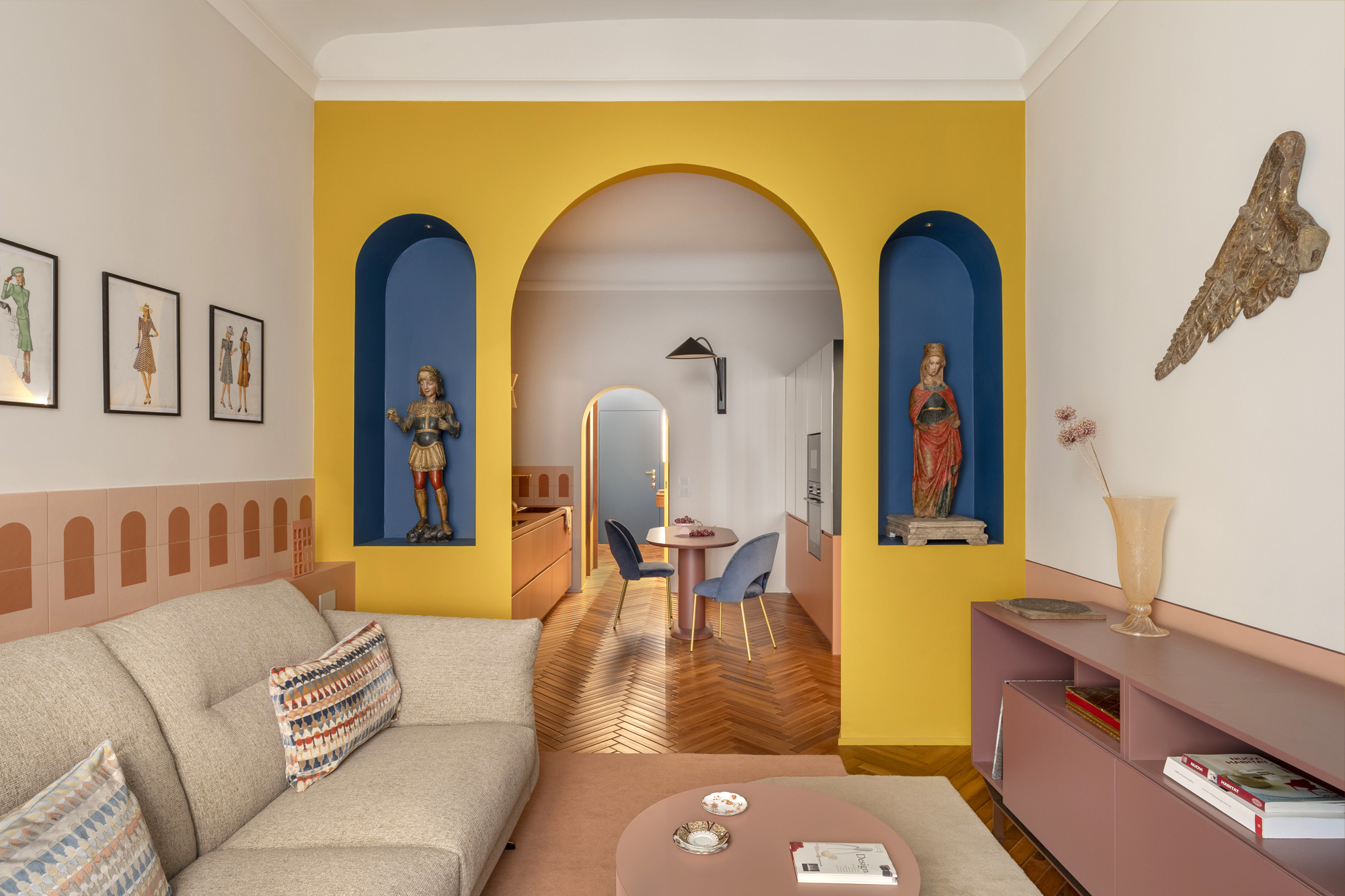 I veri protagonisti di questo appartamento oltre ai colori sono gli arredi su misura: tutti su disegno della progettista ad eccezione di letto, divani e armadio della camera. Gli arredi sono realizzati da due diverse falegnamerie ed utilizzano parti laccate alternate a parti in noce che dialogano col parquet. Gli archi e gli archetti ne scandiscono il passo in un mix equilibrato di funzionalità ed estetica. Nota sul colore: come potete vedere in questo appartamento l’uso del colore è fondamentale perché definisce le forme e contribuisce a scandire lo spazio, a riequilibrare e creare qualcosa di veramente UNICO. La prima proposta fatta ai Committenti ha avuto fin da subito un riscontro estremamente positivo.