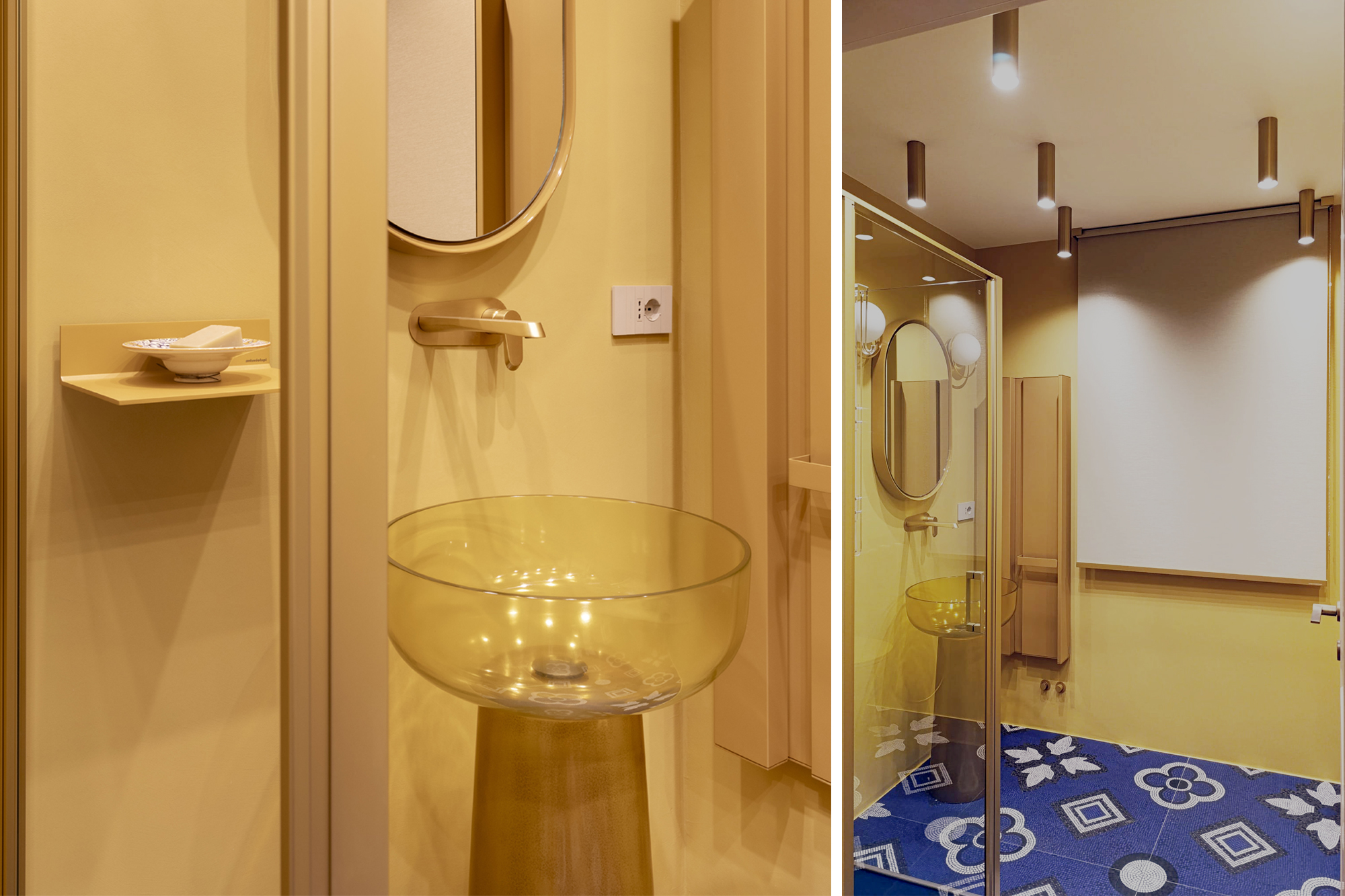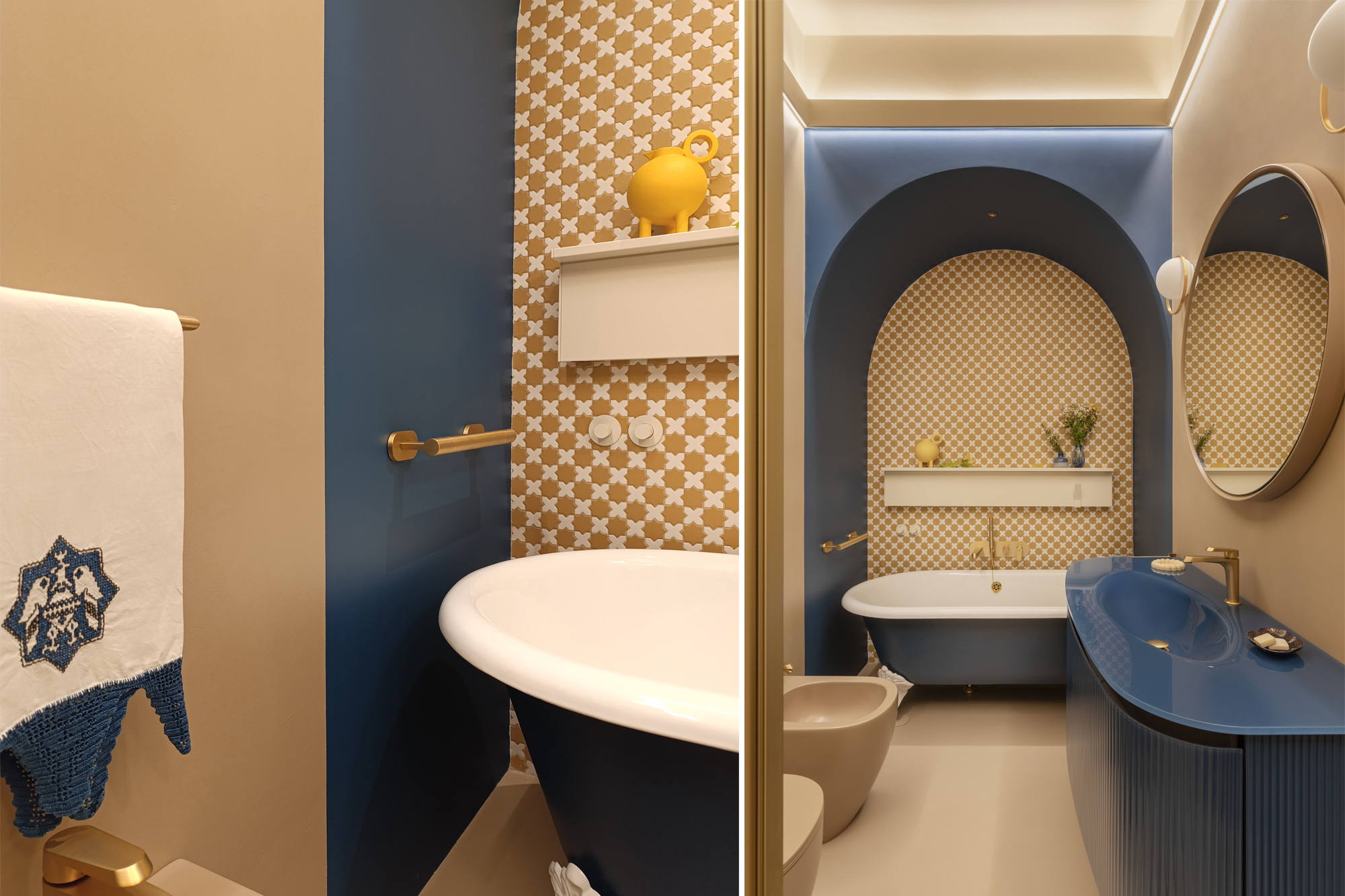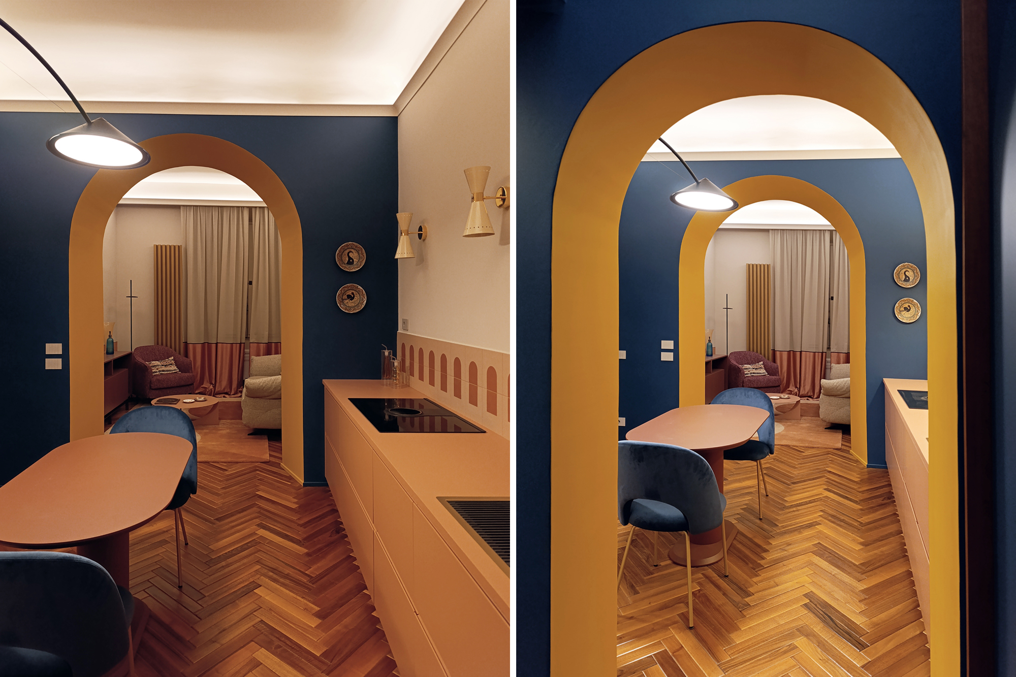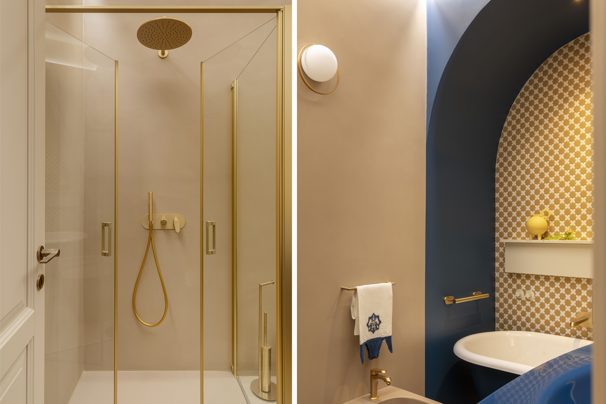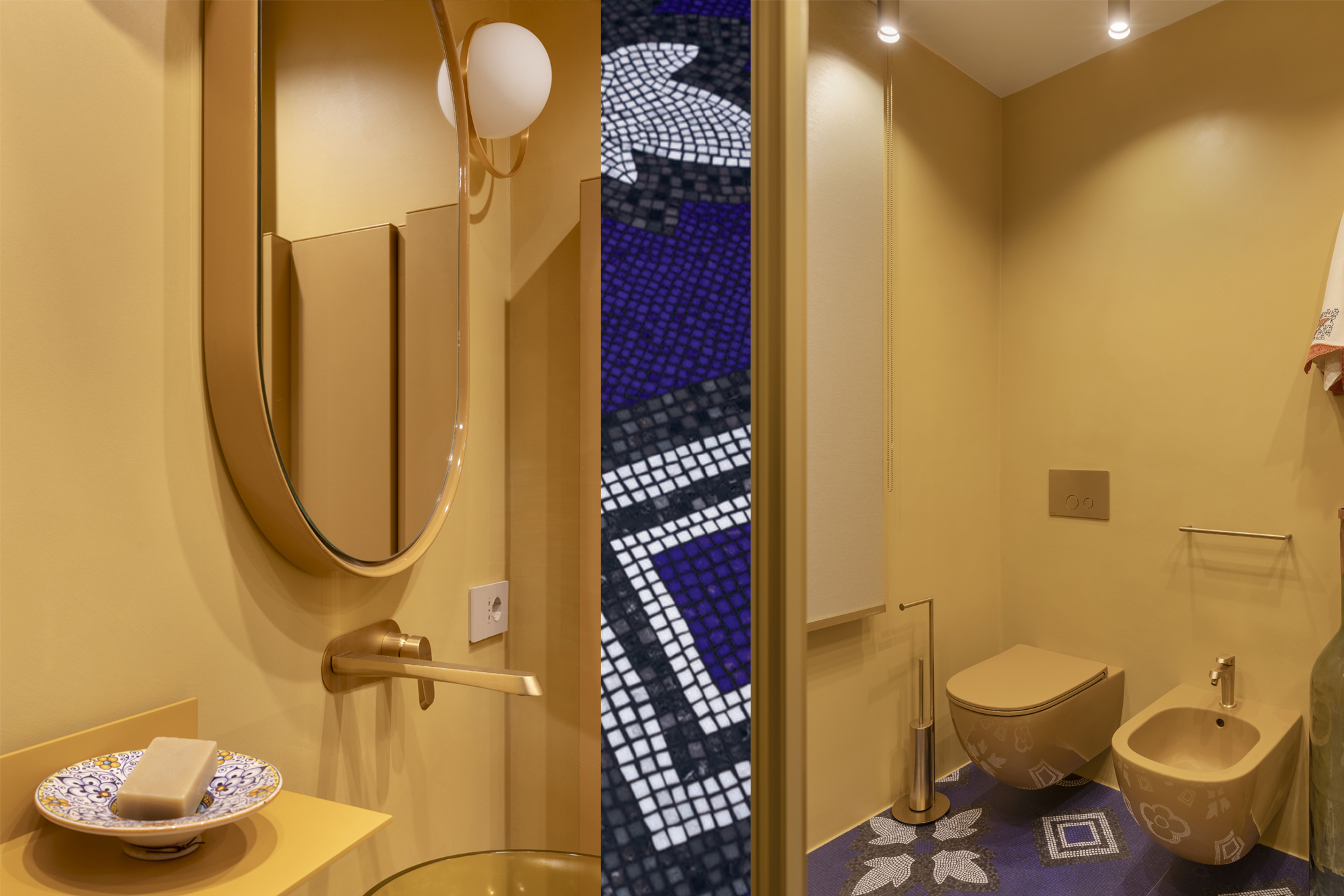 Stile del progetto: Stile eclettico, quasi maximalista, in cui passato e presente si fondono insieme Colori utilizzati: blu petrolio, oro, terracotta, noce canaletto, sabbia, giallo ocra Materiali utilizzati a pavimento: parquet in noce nazionale a spina italiana bisellato a mano e verniciato Decorazioni/rivestimenti parietali: resina nei bagni e come rivestimento del top cucina, rivestimento parietale in cucina e in soggiorno in grès, nei bagni grès porcellanato a pavimento (maxi lastra con effetto mosaico) e a parete dentro la nicchia della vasca mosaico in grès con disegno a stelle e croci medioevale