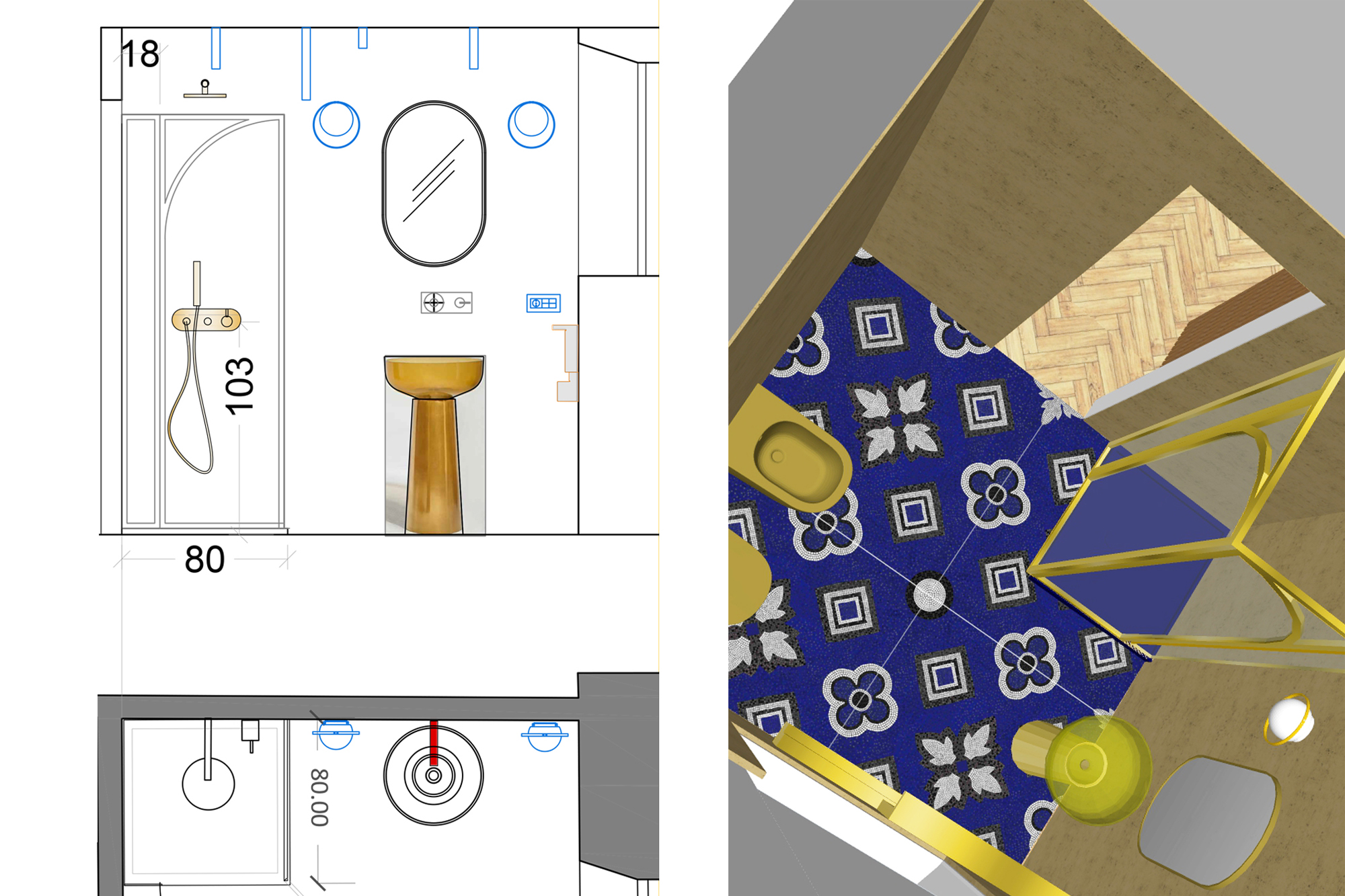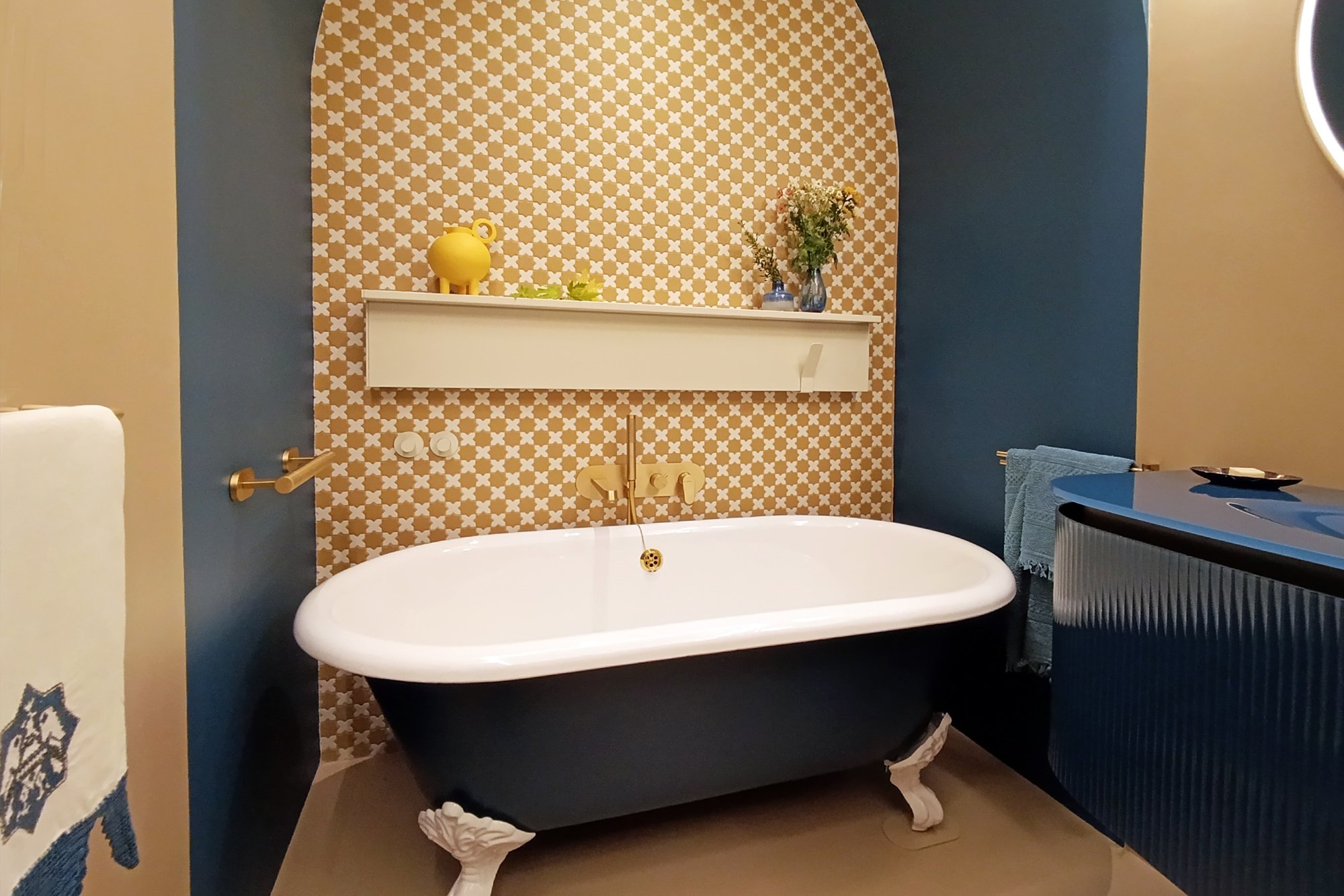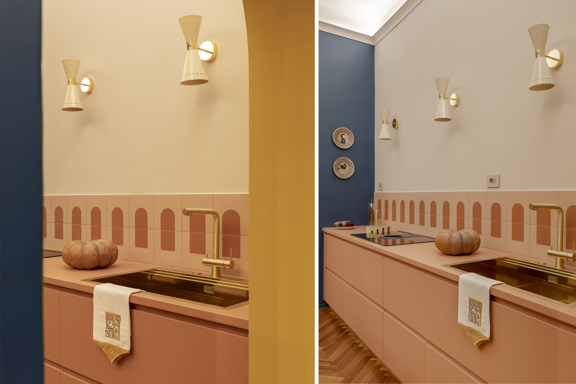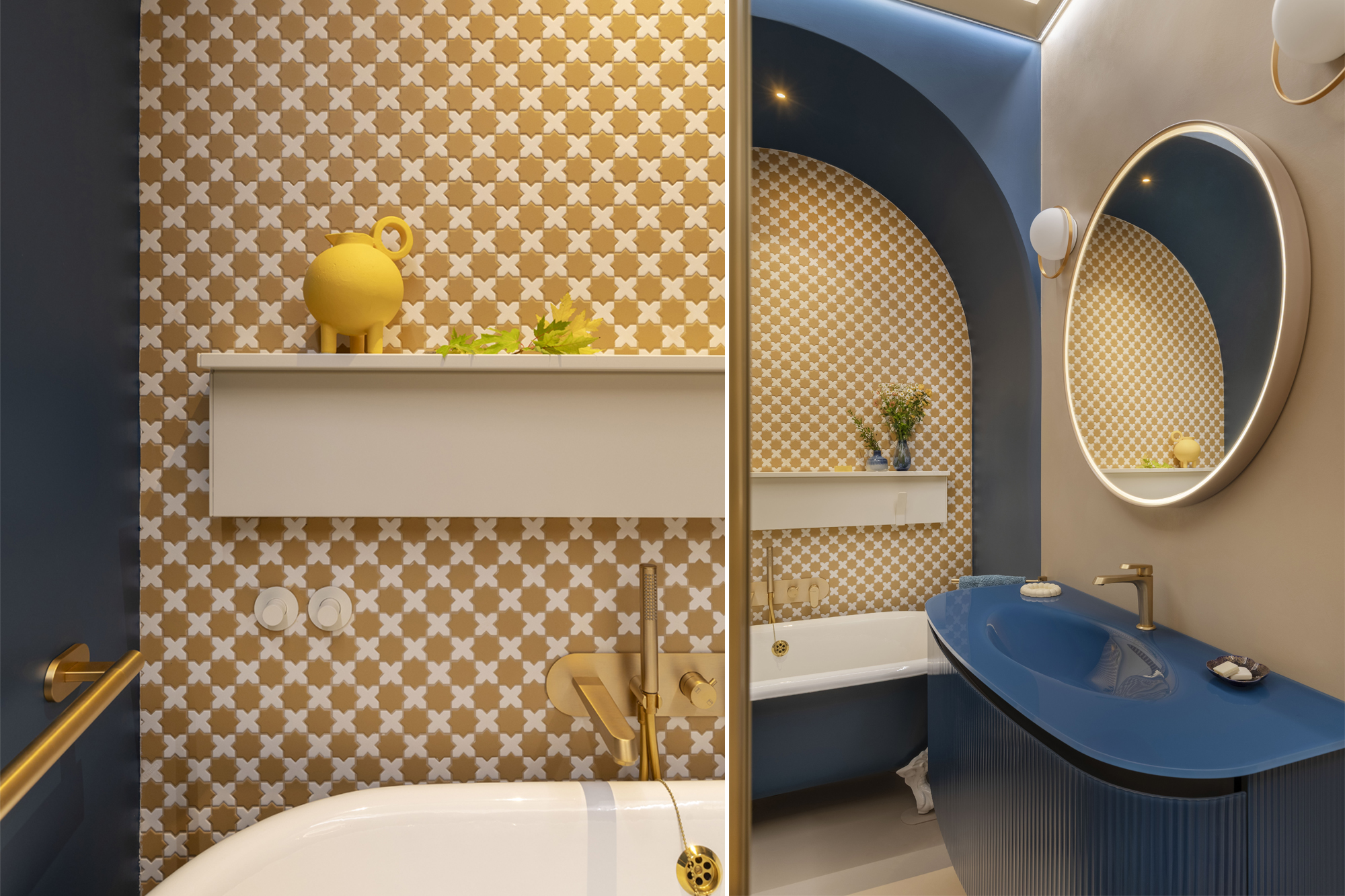 Stile del progetto: Stile eclettico, quasi maximalista, in cui passato e presente si fondono insieme Colori utilizzati: blu petrolio, oro, terracotta, noce canaletto, sabbia, giallo ocra Materiali utilizzati a pavimento: parquet in noce nazionale a spina italiana bisellato a mano e verniciato Decorazioni/rivestimenti parietali: resina nei bagni e come rivestimento del top cucina, rivestimento parietale in cucina e in soggiorno in grès, nei bagni grès porcellanato a pavimento (maxi lastra con effetto mosaico) e a parete dentro la nicchia della vasca mosaico in grès con disegno a stelle e croci medioevale