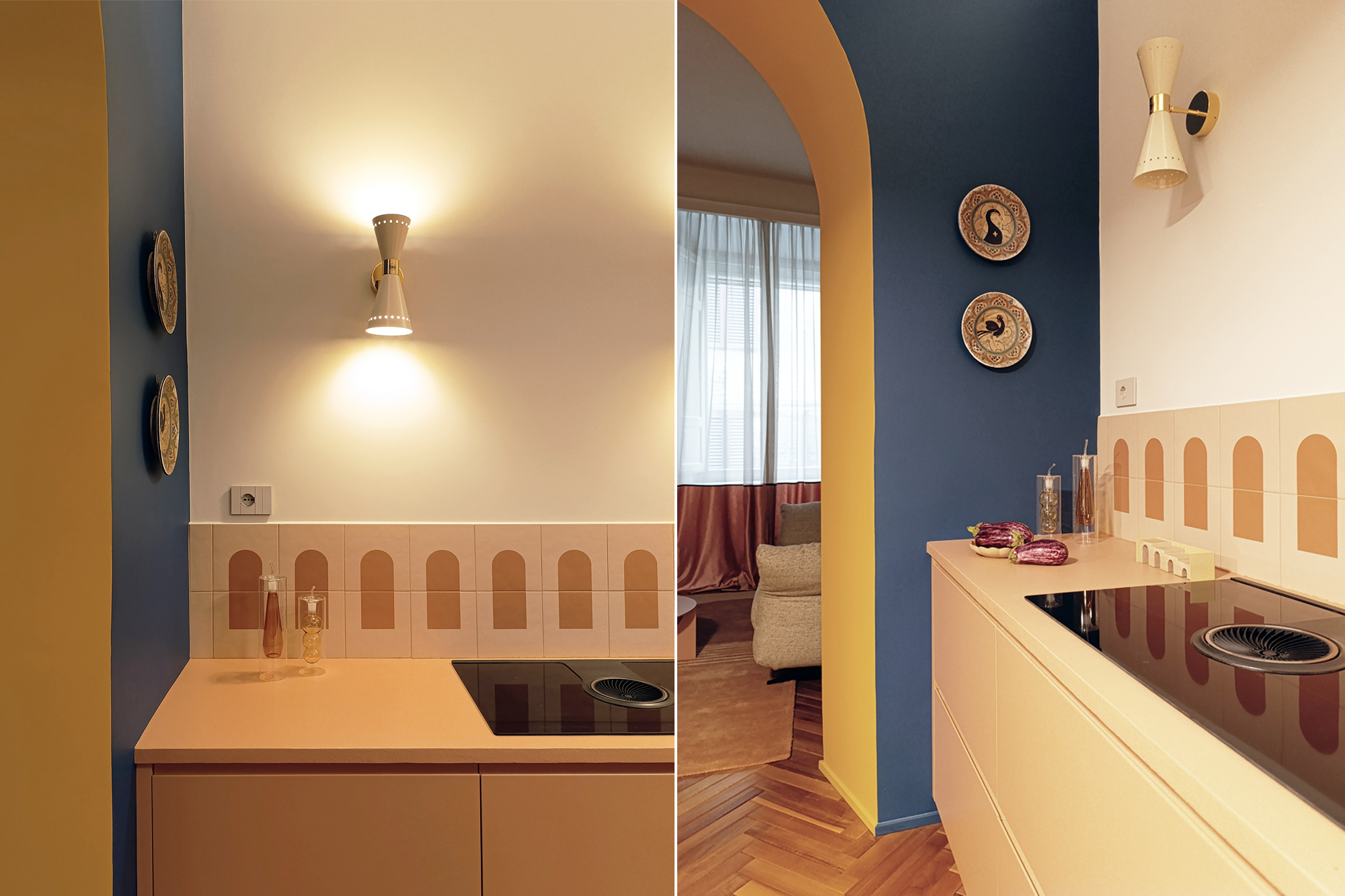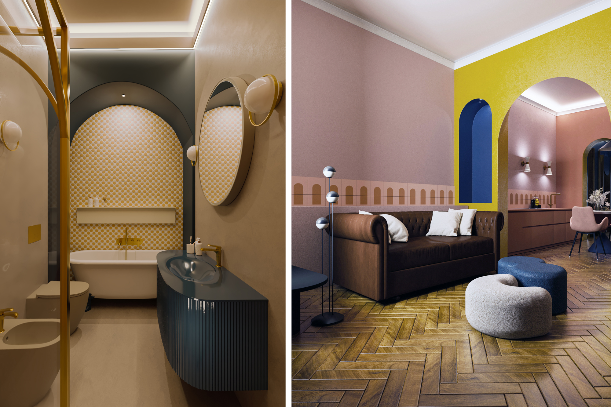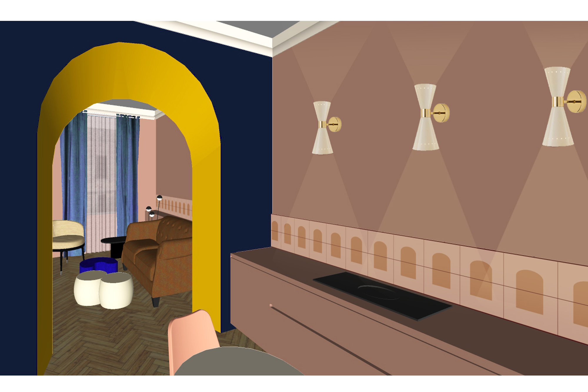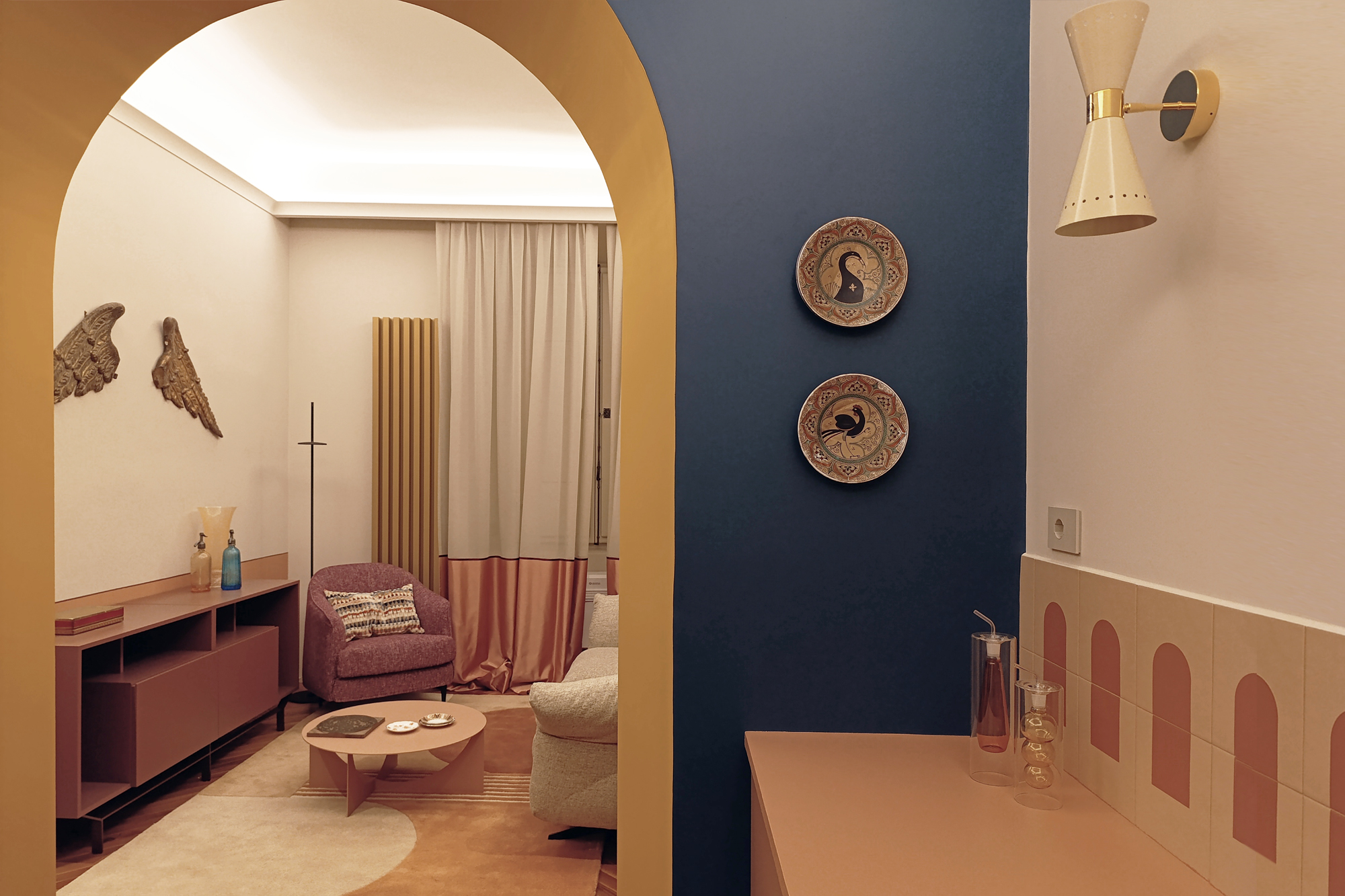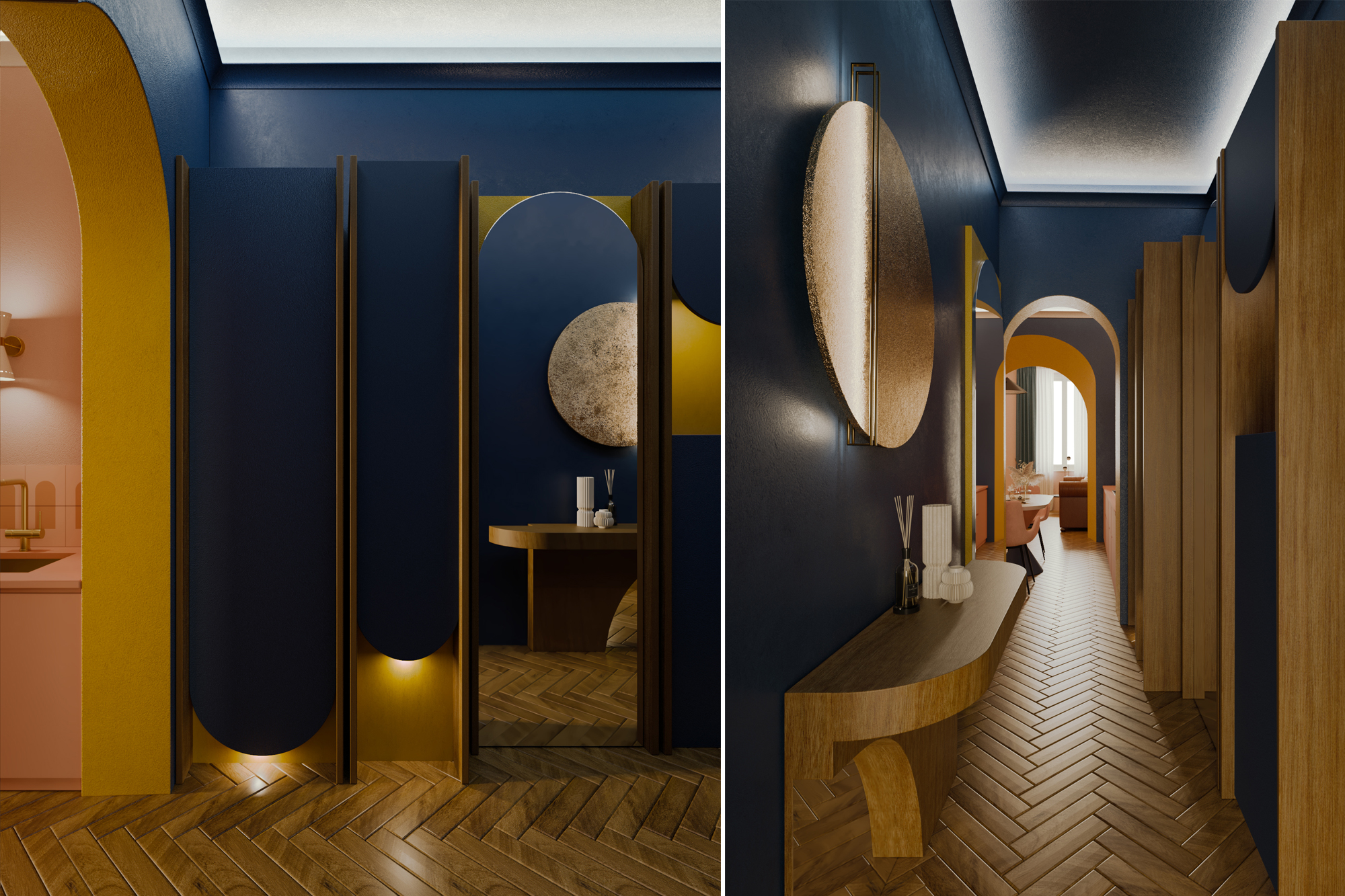 Stile del progetto: Stile eclettico, quasi maximalista, in cui passato e presente si fondono insieme Colori utilizzati: blu petrolio, oro, terracotta, noce canaletto, sabbia, giallo ocra Materiali utilizzati a pavimento: parquet in noce nazionale a spina italiana bisellato a mano e verniciato Decorazioni/rivestimenti parietali: resina nei bagni e come rivestimento del top cucina, rivestimento parietale in cucina e in soggiorno in grès, nei bagni grès porcellanato a pavimento (maxi lastra con effetto mosaico) e a parete dentro la nicchia della vasca mosaico in grès con disegno a stelle e croci medioevale