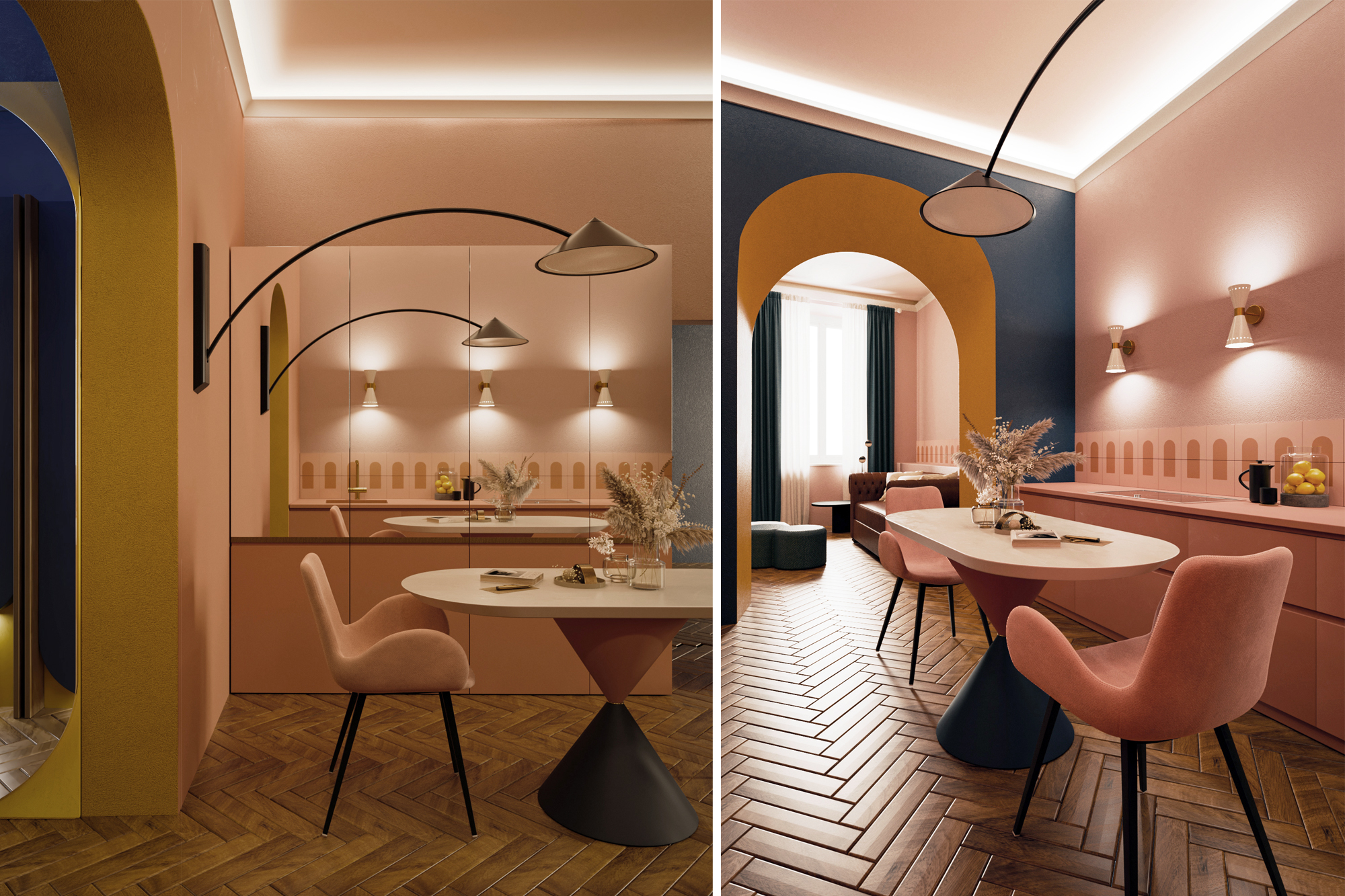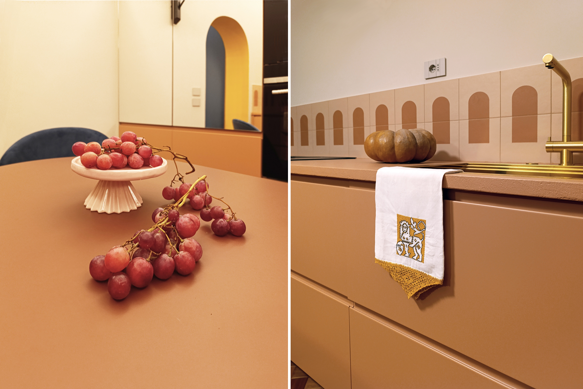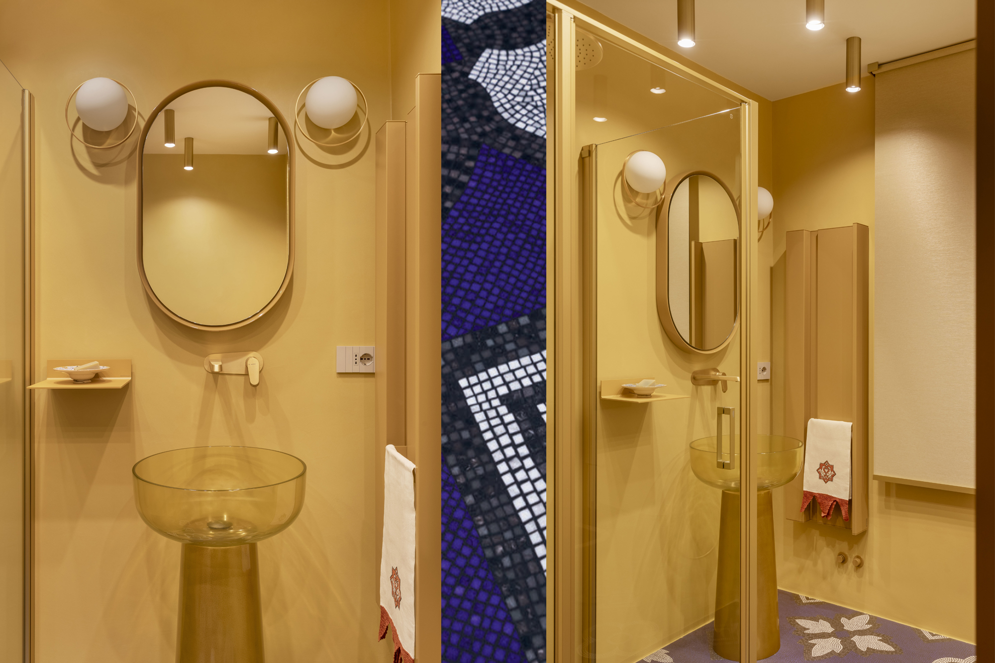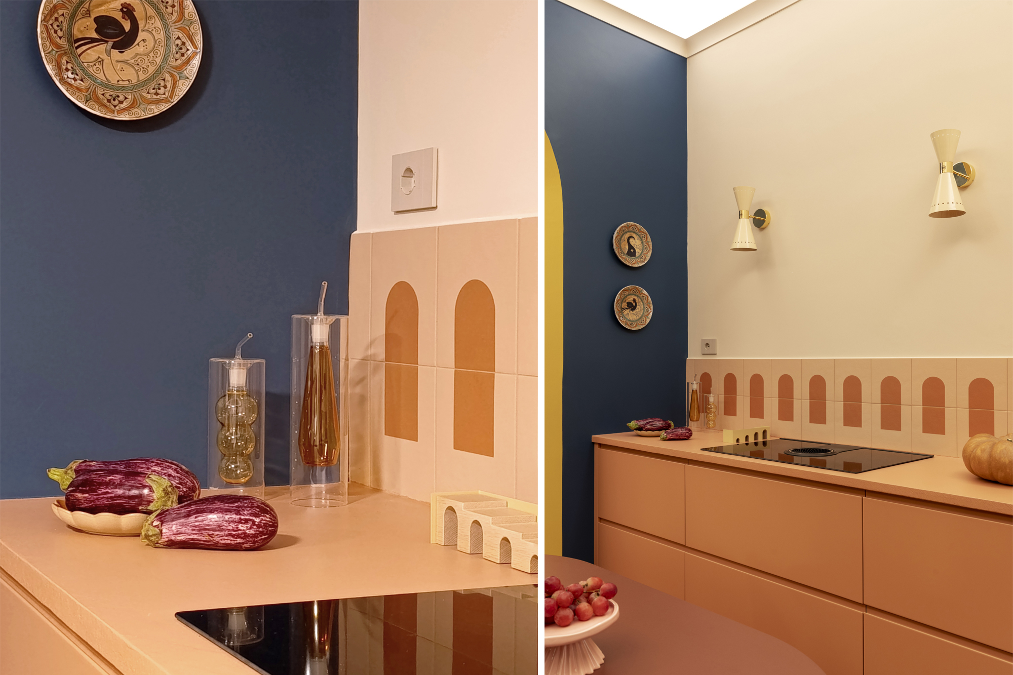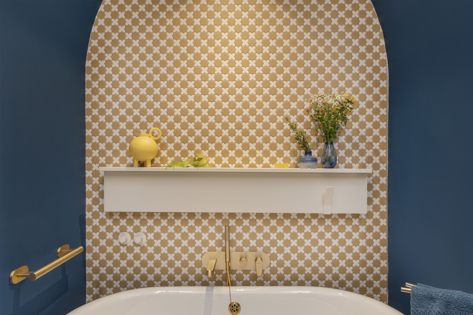 Stile del progetto: Stile eclettico, quasi maximalista, in cui passato e presente si fondono insieme Colori utilizzati: blu petrolio, oro, terracotta, noce canaletto, sabbia, giallo ocra Materiali utilizzati a pavimento: parquet in noce nazionale a spina italiana bisellato a mano e verniciato Decorazioni/rivestimenti parietali: resina nei bagni e come rivestimento del top cucina, rivestimento parietale in cucina e in soggiorno in grès, nei bagni grès porcellanato a pavimento (maxi lastra con effetto mosaico) e a parete dentro la nicchia della vasca mosaico in grès con disegno a stelle e croci medioevale