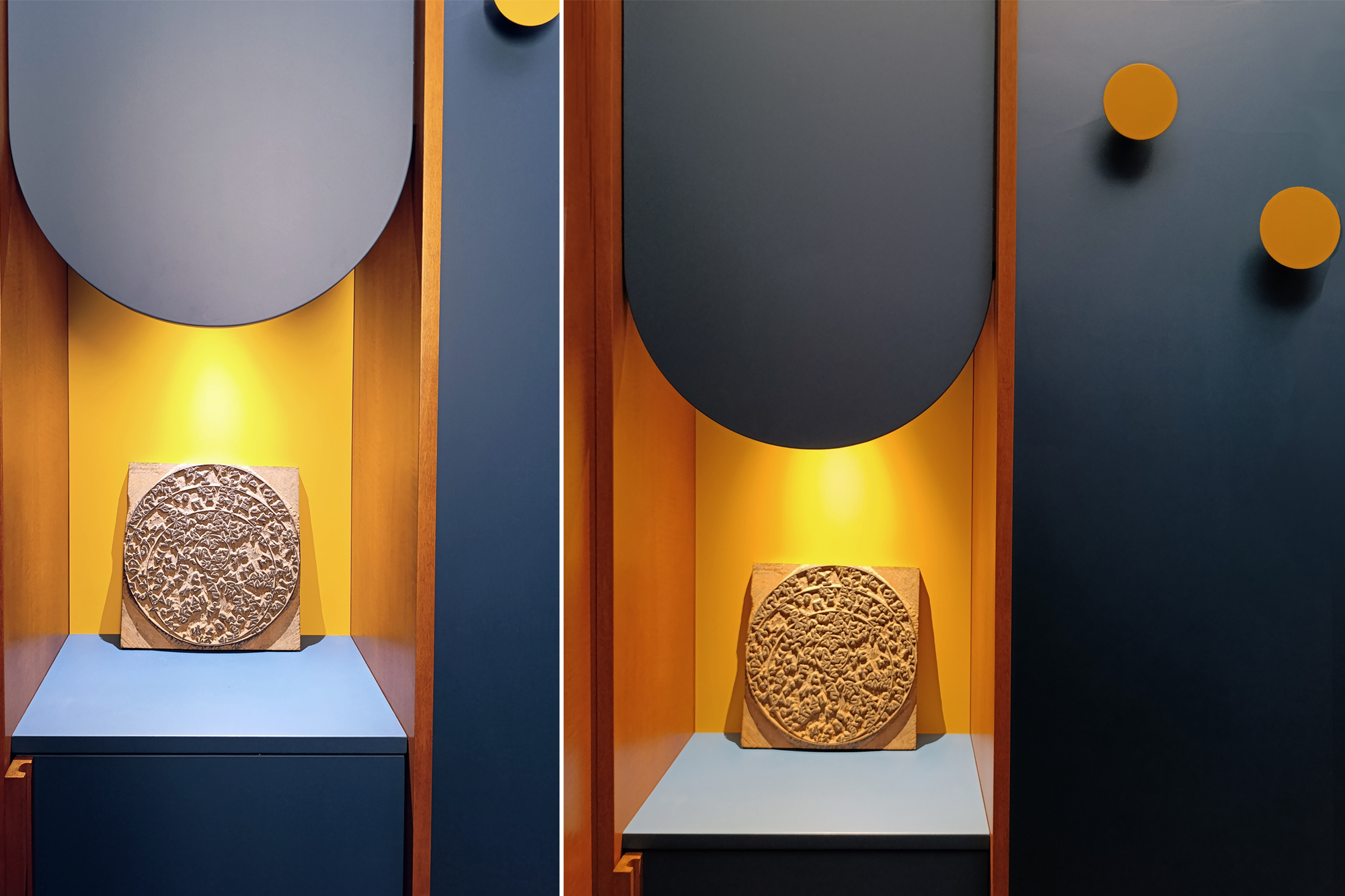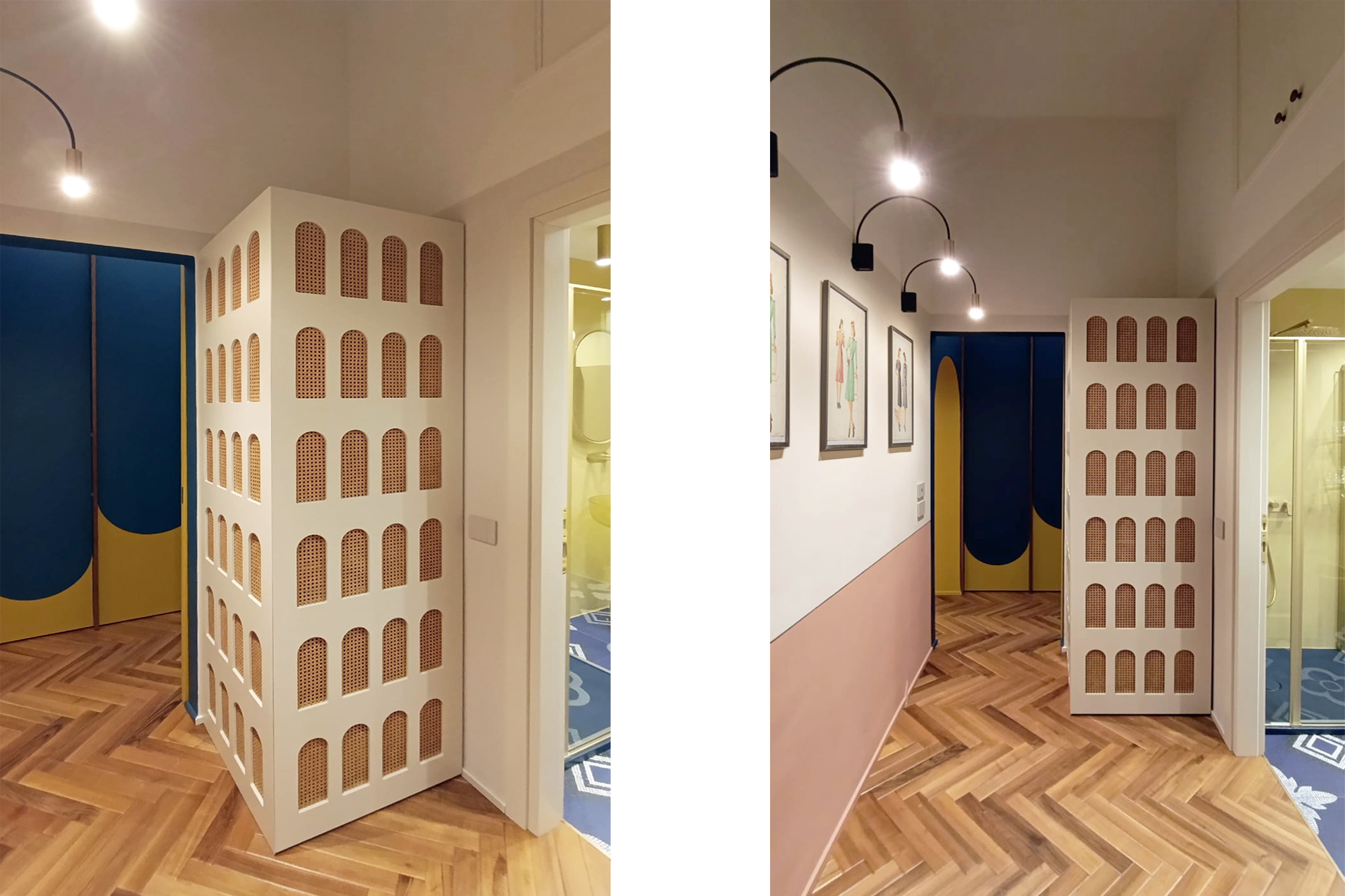 2-Il pannello scorrevole disegnato dallo studio che nasconde l’accesso al disimpegno e sembra un’opera