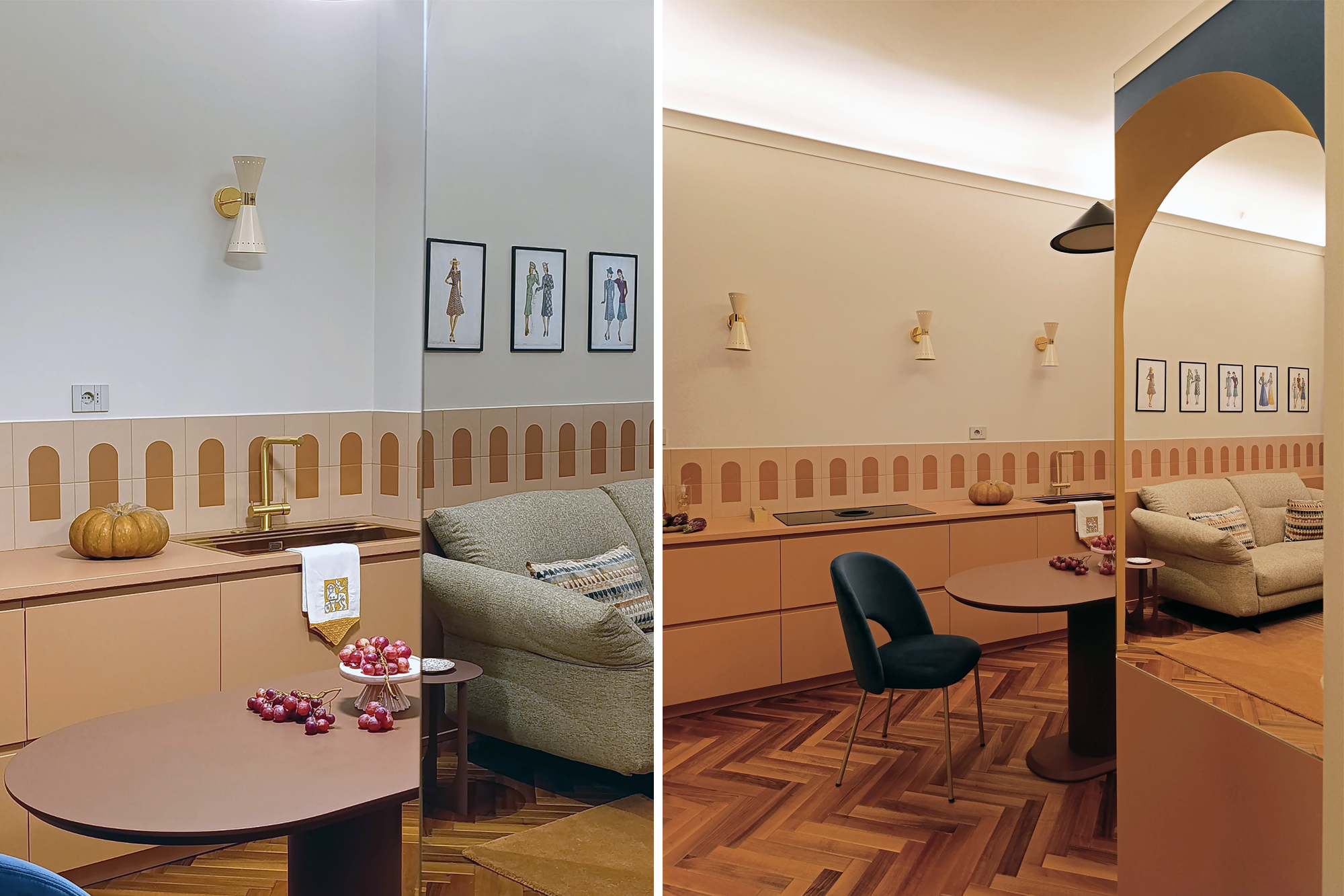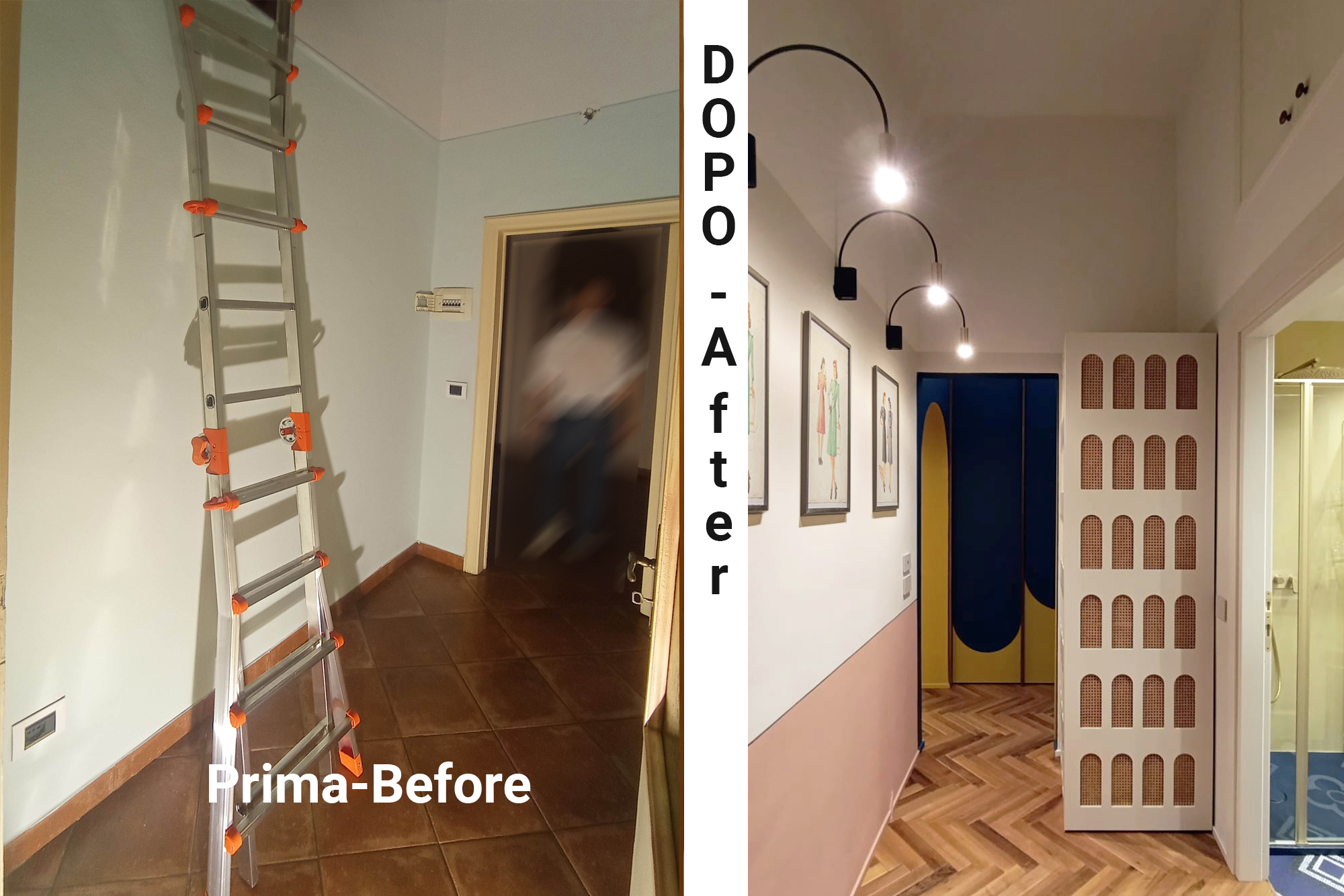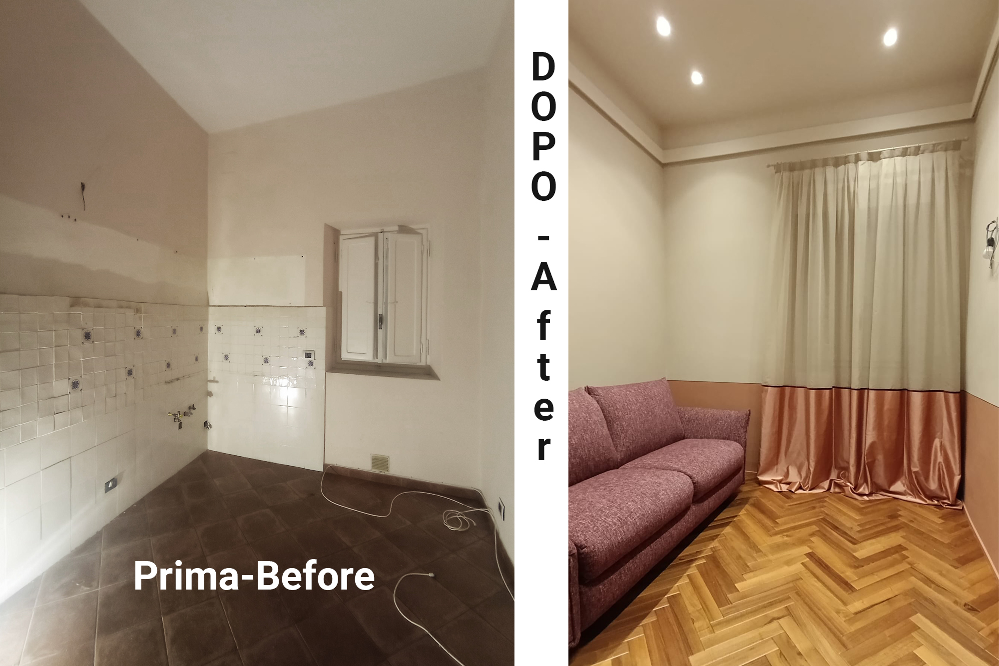 L'appartamento era diviso in modo per niente coerente e con dei rivestimenti da incubo. inoltre la cucina era piccola, in un angolo della casa e nell'appartamento non era presente neanche un soggiorno. Attaccata alla porta d'ingresso si trovava la porta di uno dei due bagni dell'abitazione. Prima la cucina era angusta e si trovava in quello che poi è diventato lo studio, adesso è in posizione centrale ed è caratterizzata da una parte operativa rigorosamente senza pensili e da delle colonne che si fondono con le pareti sfruttando le ante per metà rivestite in specchio.
