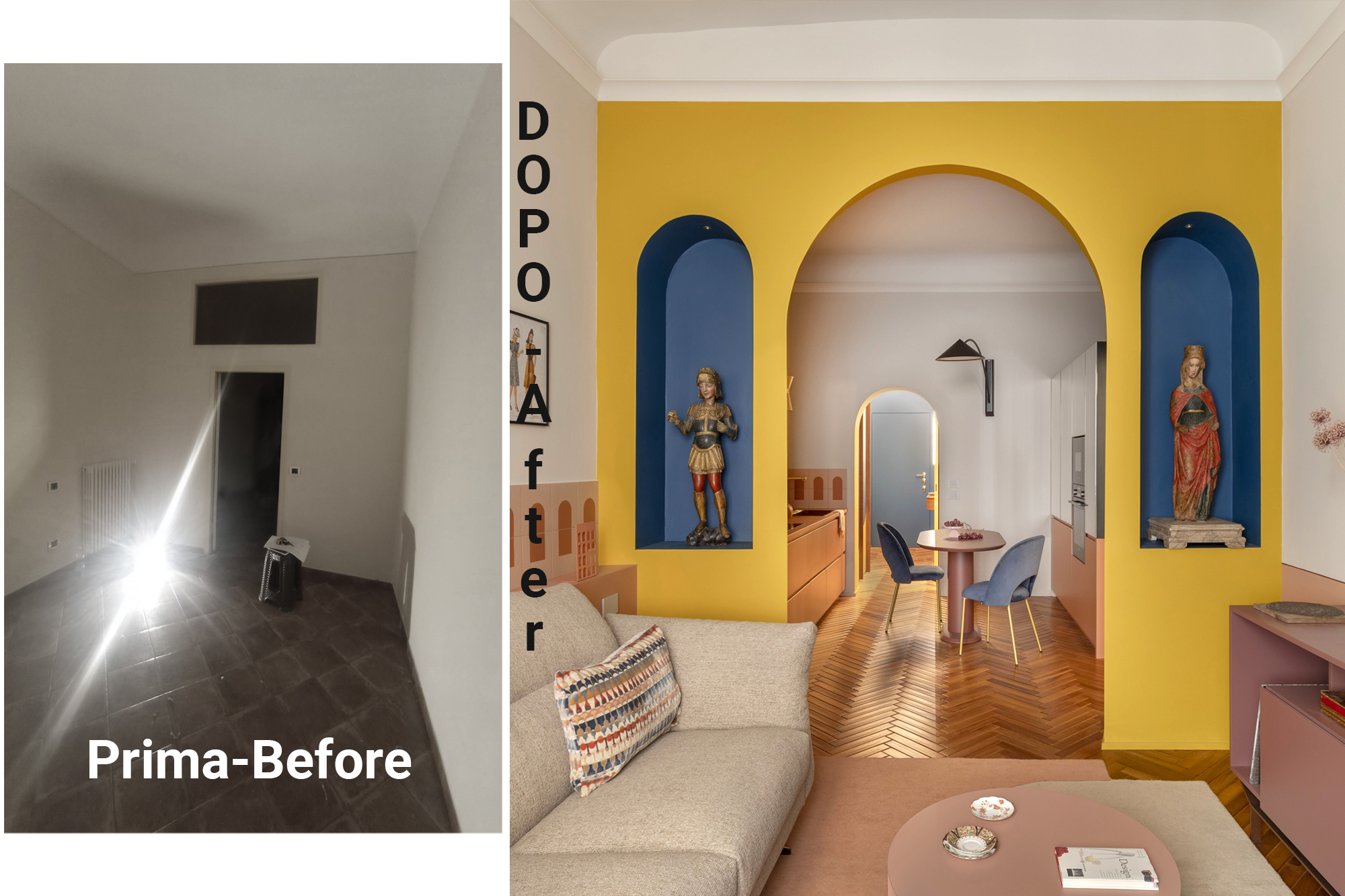 Un progetto sartoriale che fin da subito è stato incentrato non solo sulle richieste/aspettative della committenza ma anche nel cogliere lo “spirito” del luogo. Realizzato per una coppia in cui lui è un artista poliedrico: letterato, regista, amante dell'arte e della storia medioevale. Troviamo un susseguirsi di scenografie costellate di archi, la casa ne conta più di 100 tra quelli inseriti nell'architettura e nei dettagli di arredo, illuminazione e decòr. In questa casa un parquet in noce nazionale tagliato a spina italiana in cui ogni listra è bisellata a mano, celebra tutta l'italianità e artigianalità del progetto, strettamente ancorato alla storia della città e ai colori della contrada di appartenenza, il Leocorno. L'illuminazione, diretta, indiretta, con bianco dinamico e dimmerabile in tutte le stanze è stata studiata appositamente dalla Progettista con attenzione particolare, come espressamente richiesto dalla Committenza; per questo motivo in ogni stanza si stratificano vari layer di illuminazione: diretta, indiretta, puntuale, funzionale e d’effetto. In quasi tutte le stanze ci sono strip led dimmerabili e con bianco dinamico per un progetto davvero elaborato e dal forte impatto.