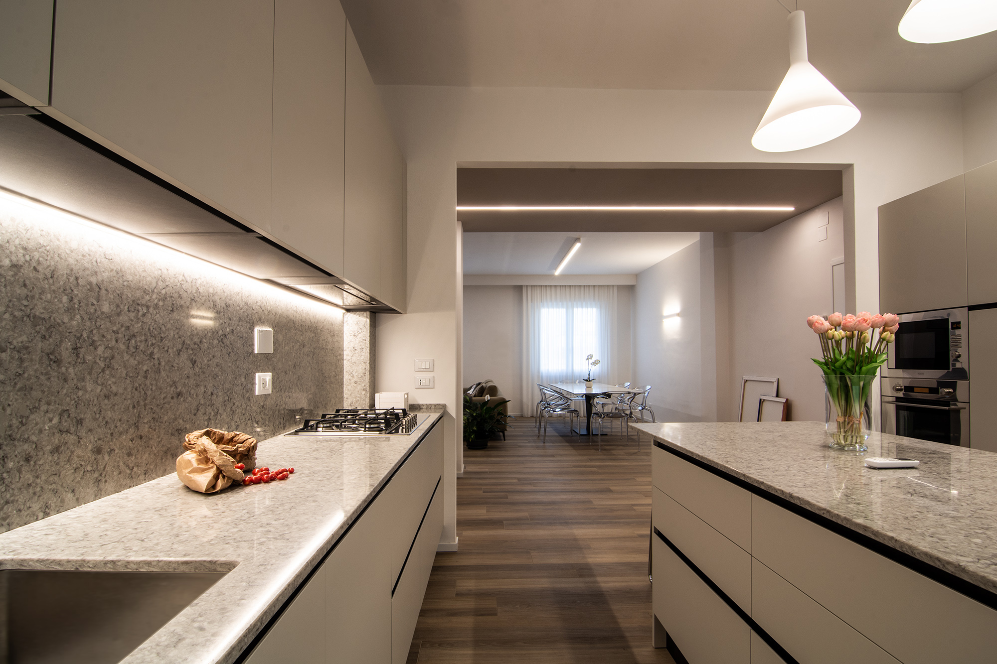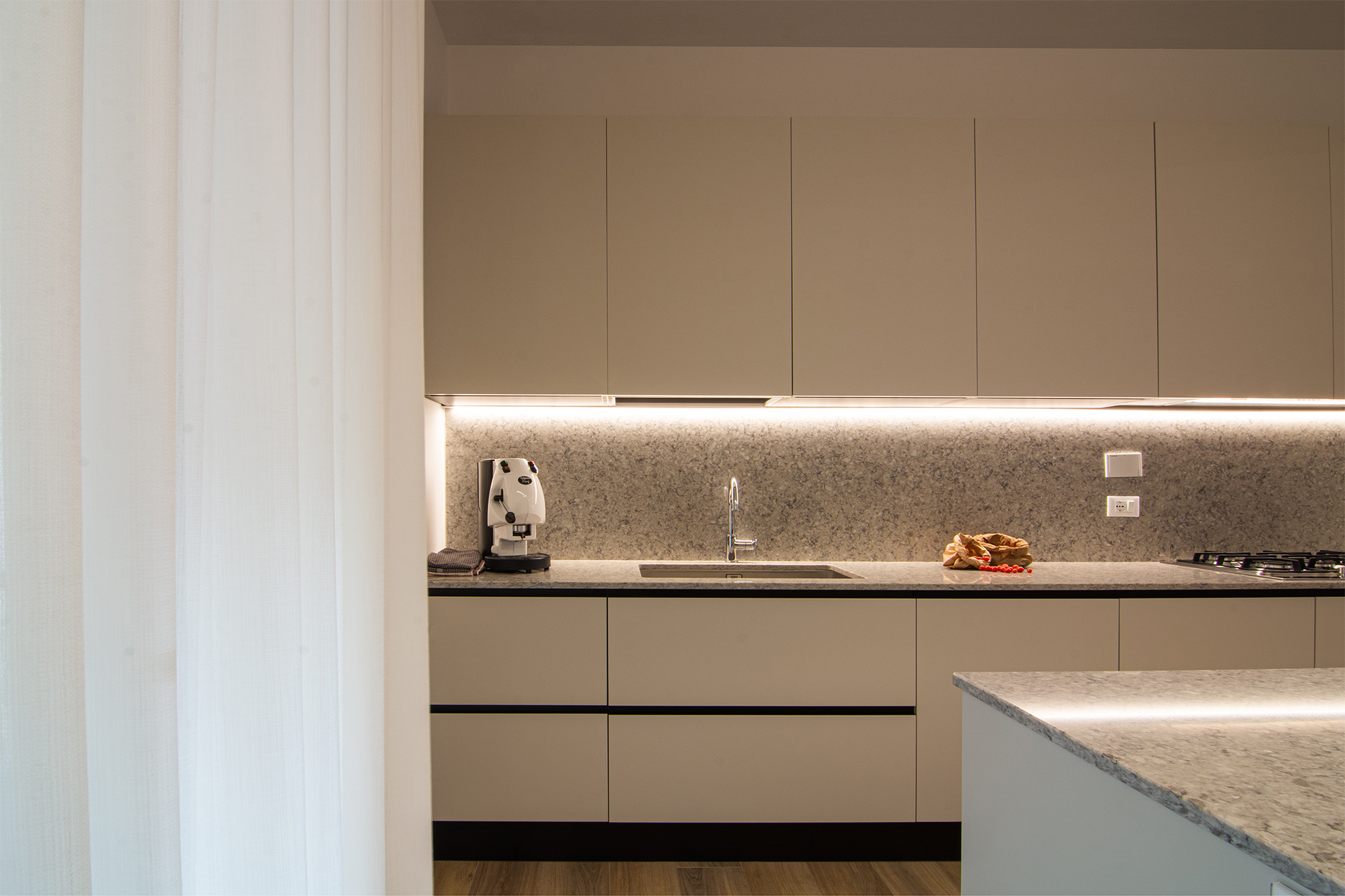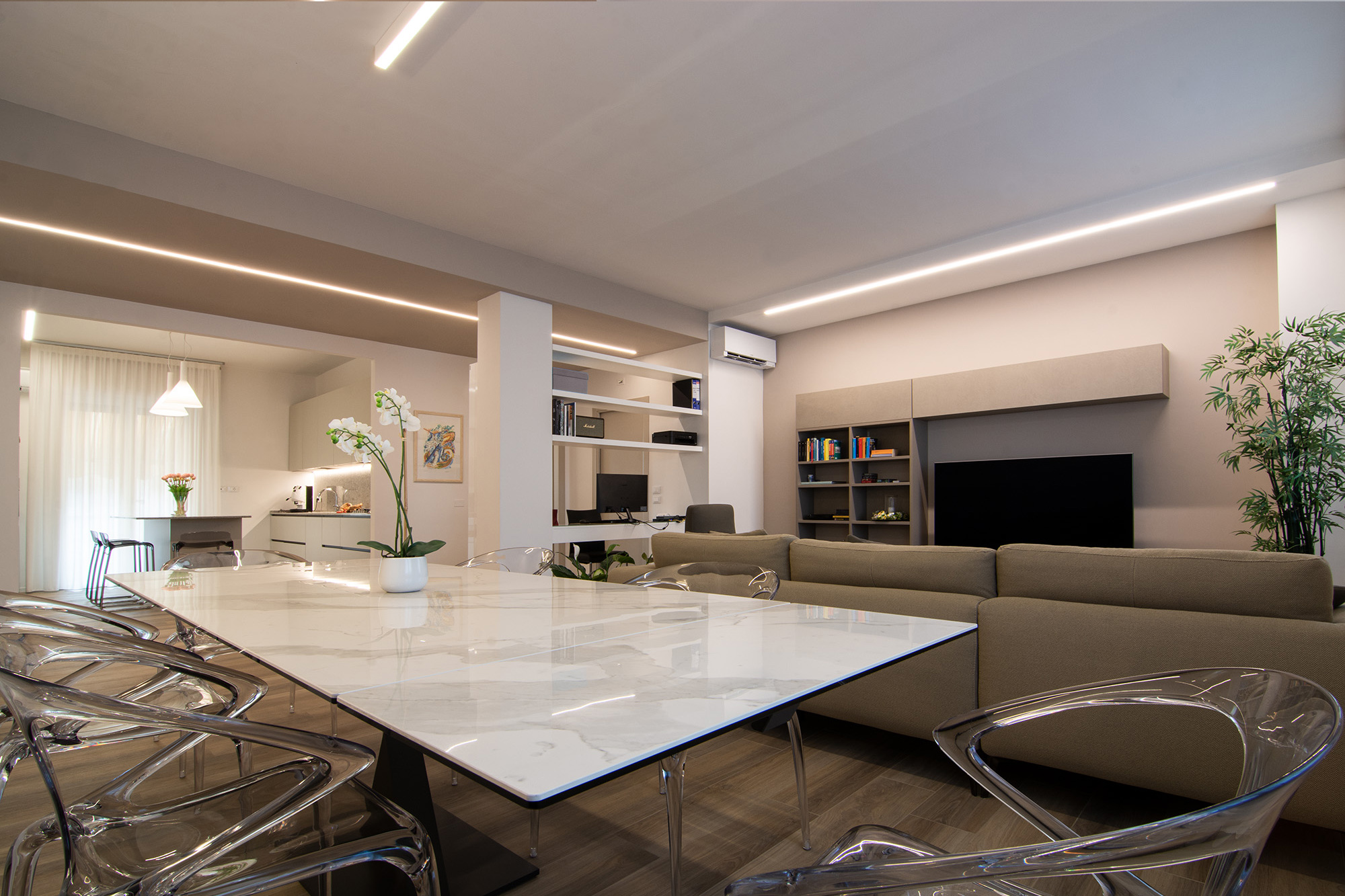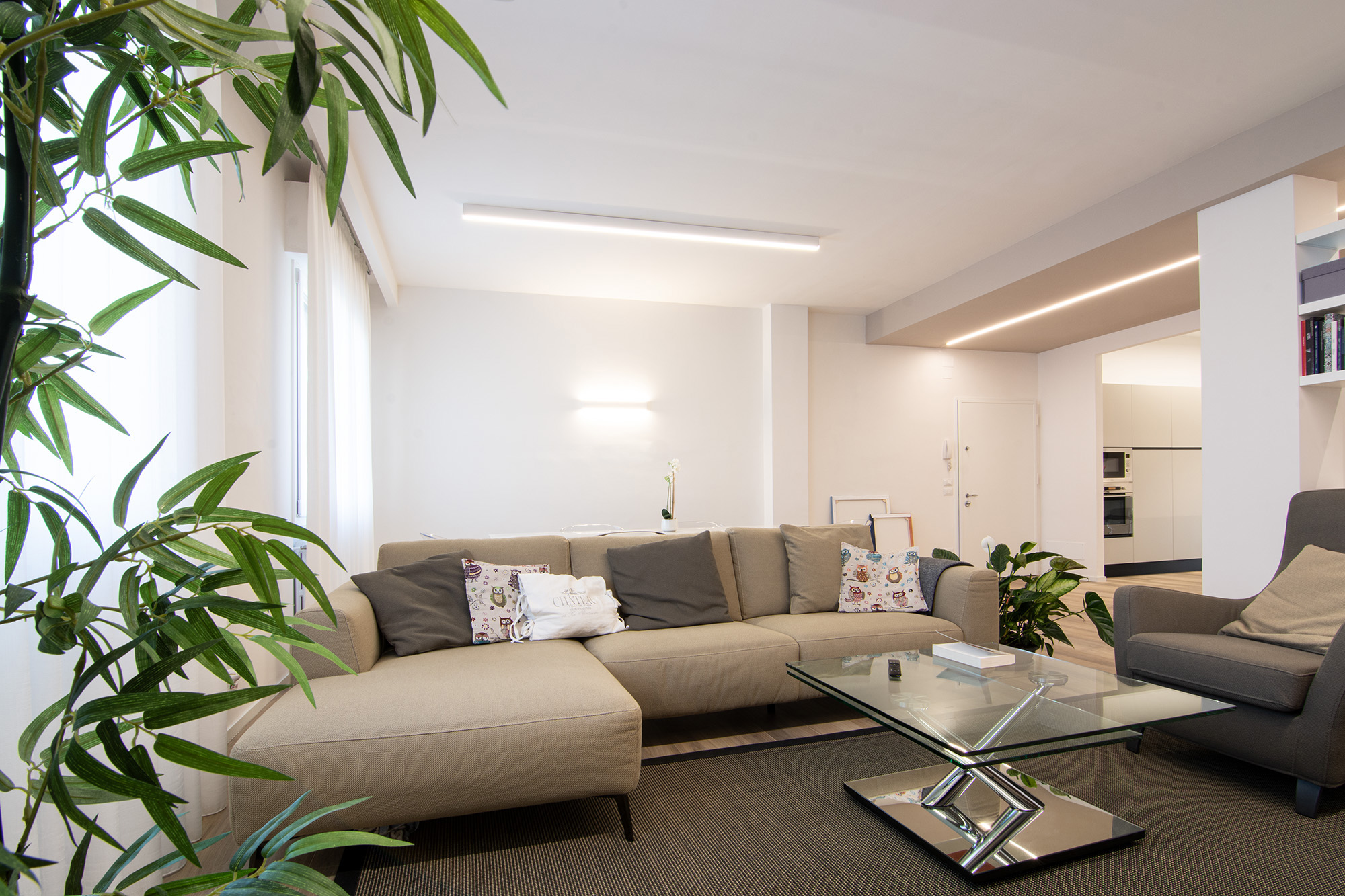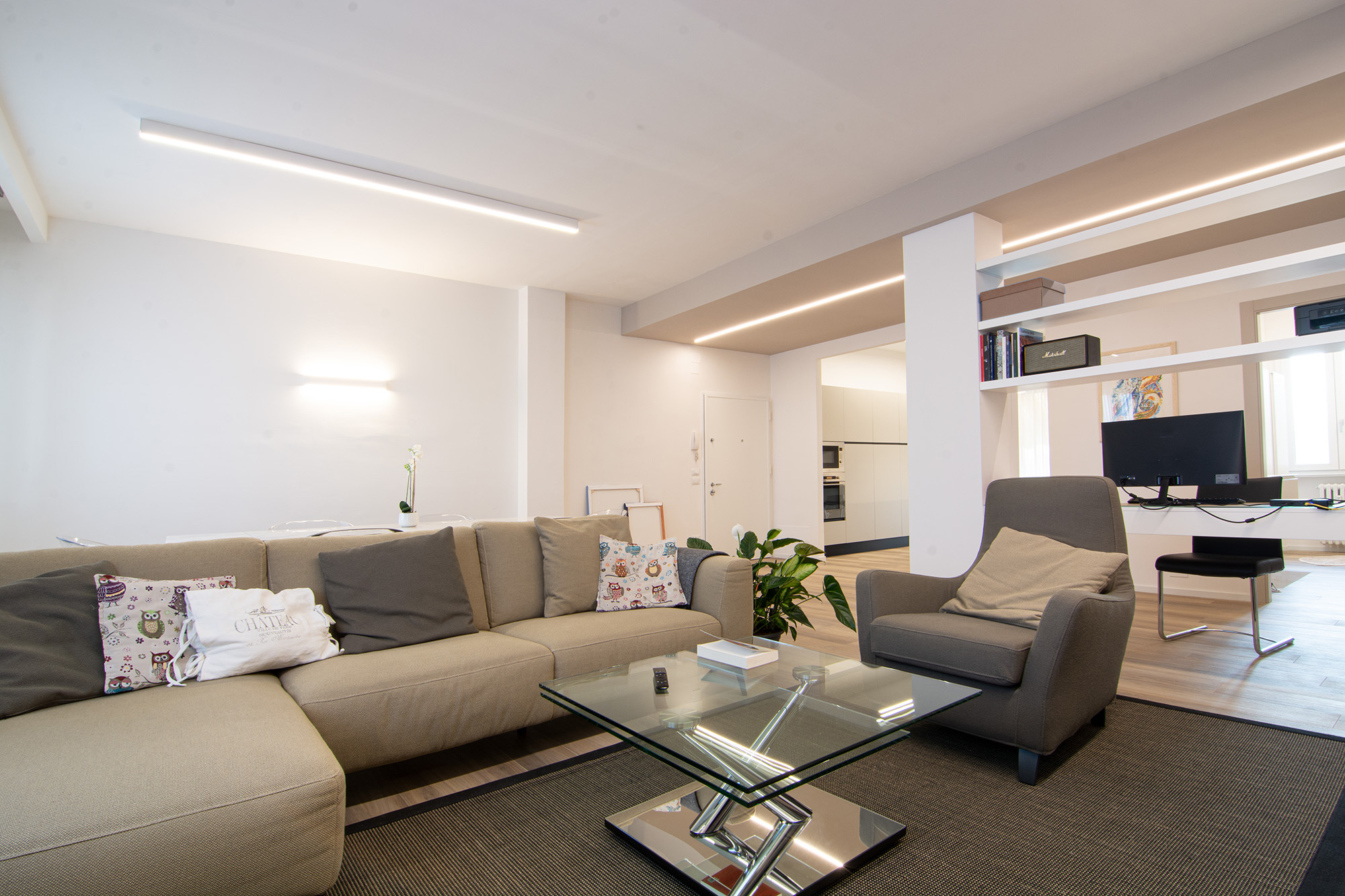 Per l’illuminazione sono stati utilizzati profili led molto tecnici con luce bianca dimmerabili in tutto l’appartamento.