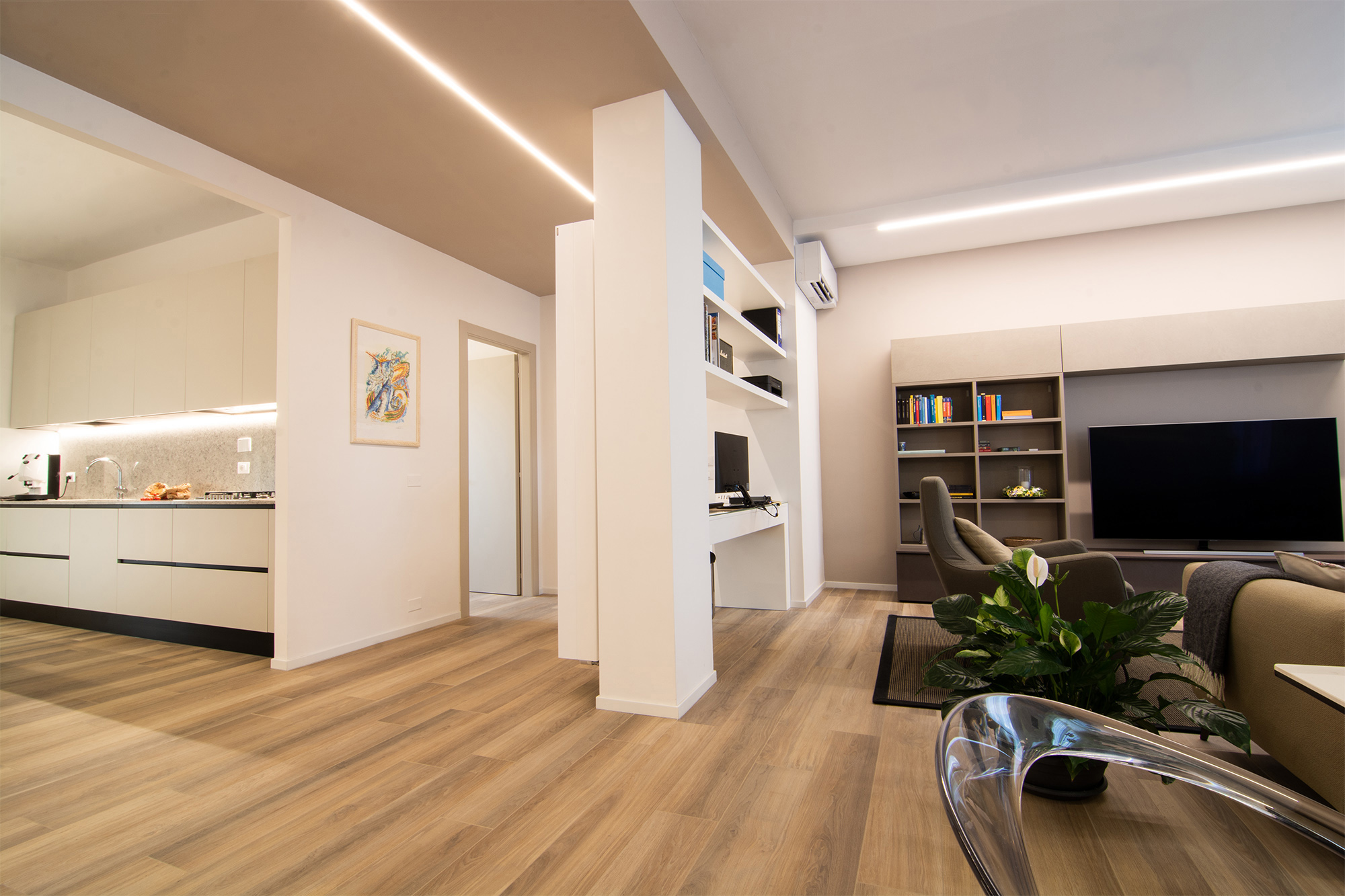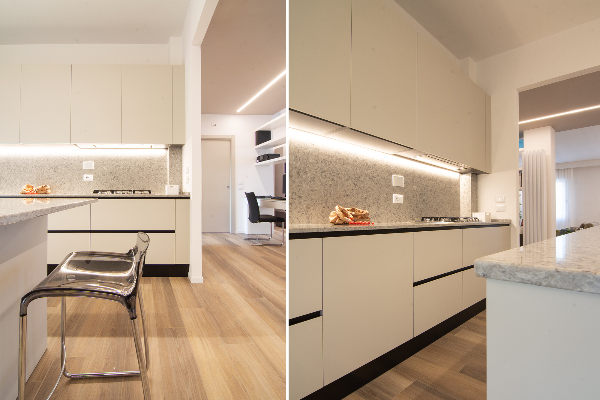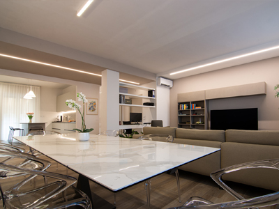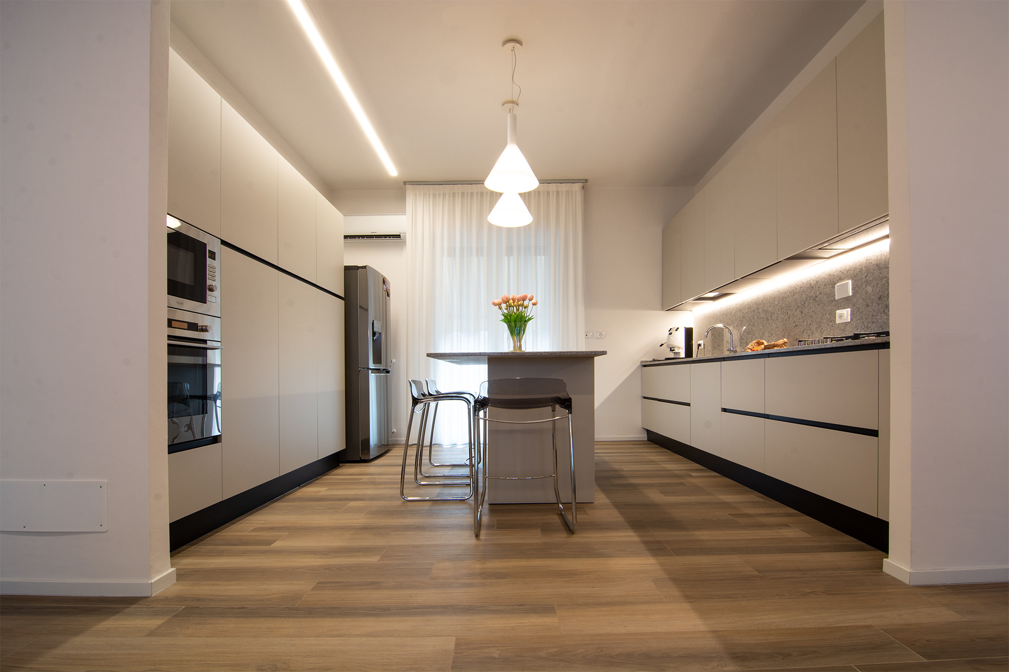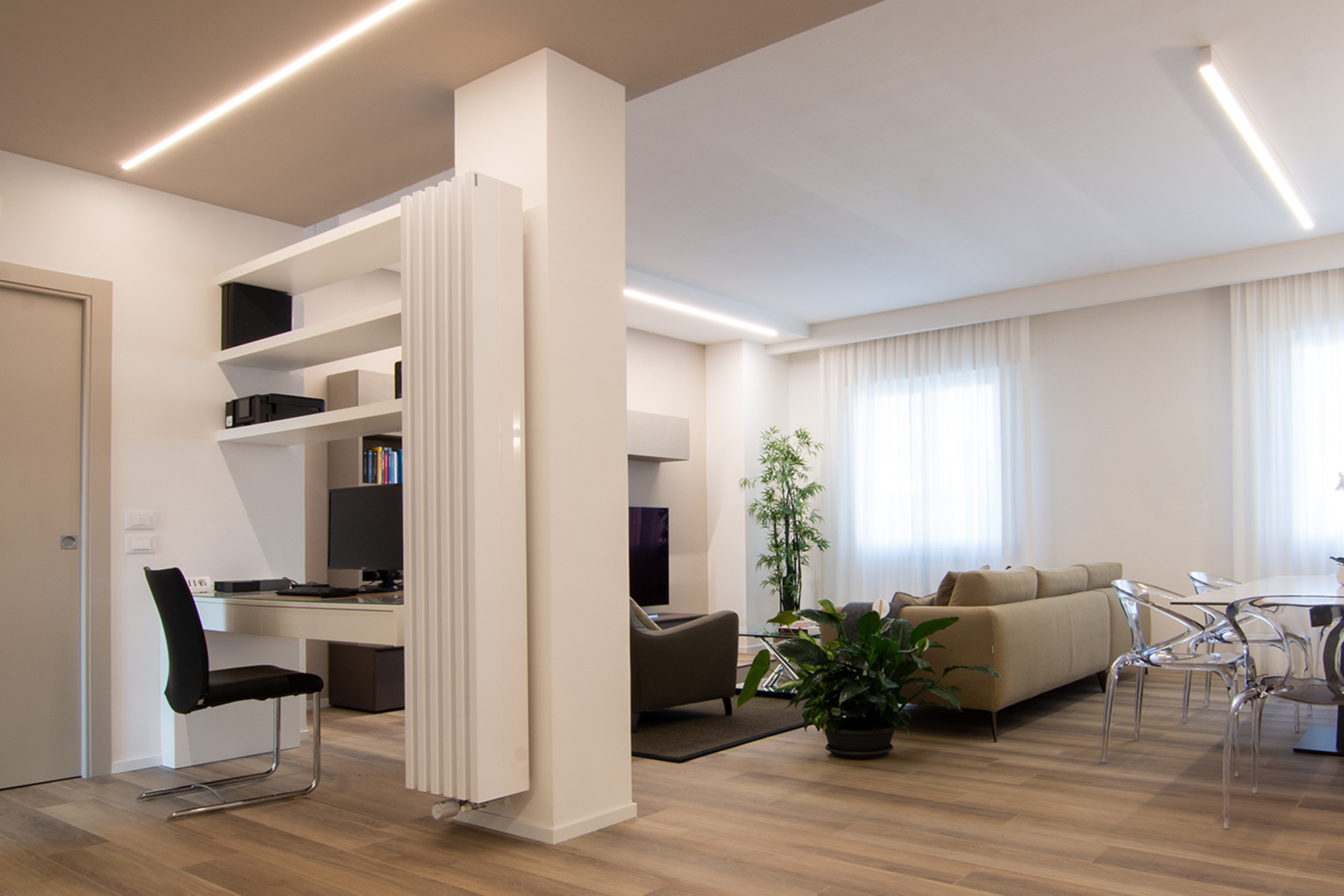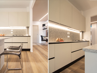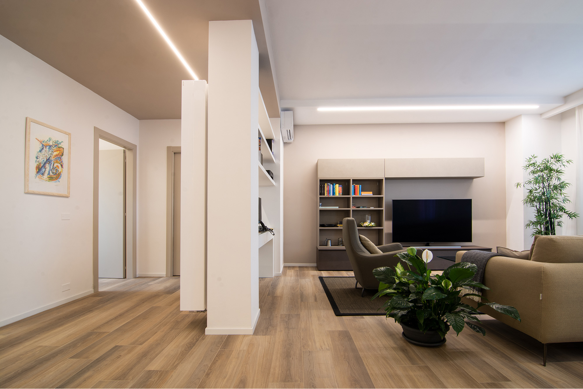 Per l’illuminazione sono stati utilizzati profili led molto tecnici con luce bianca dimmerabili in tutto l’appartamento.