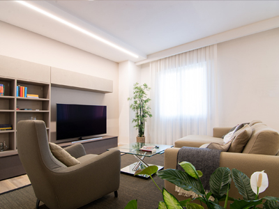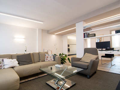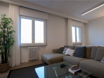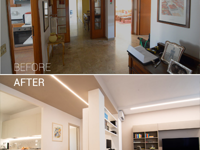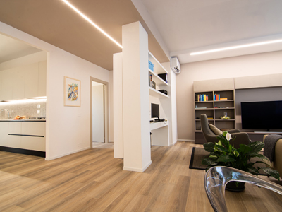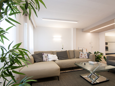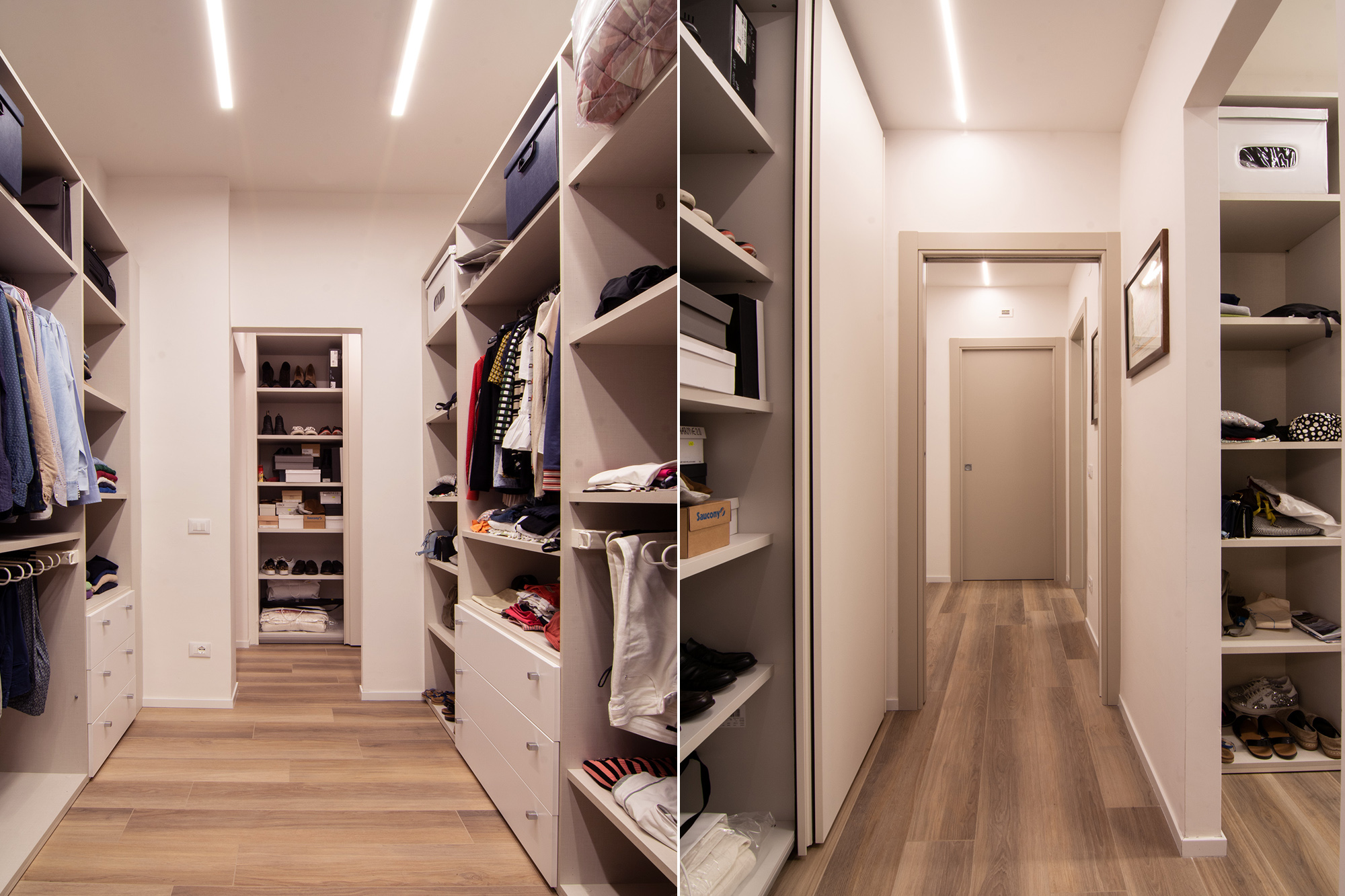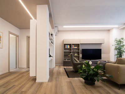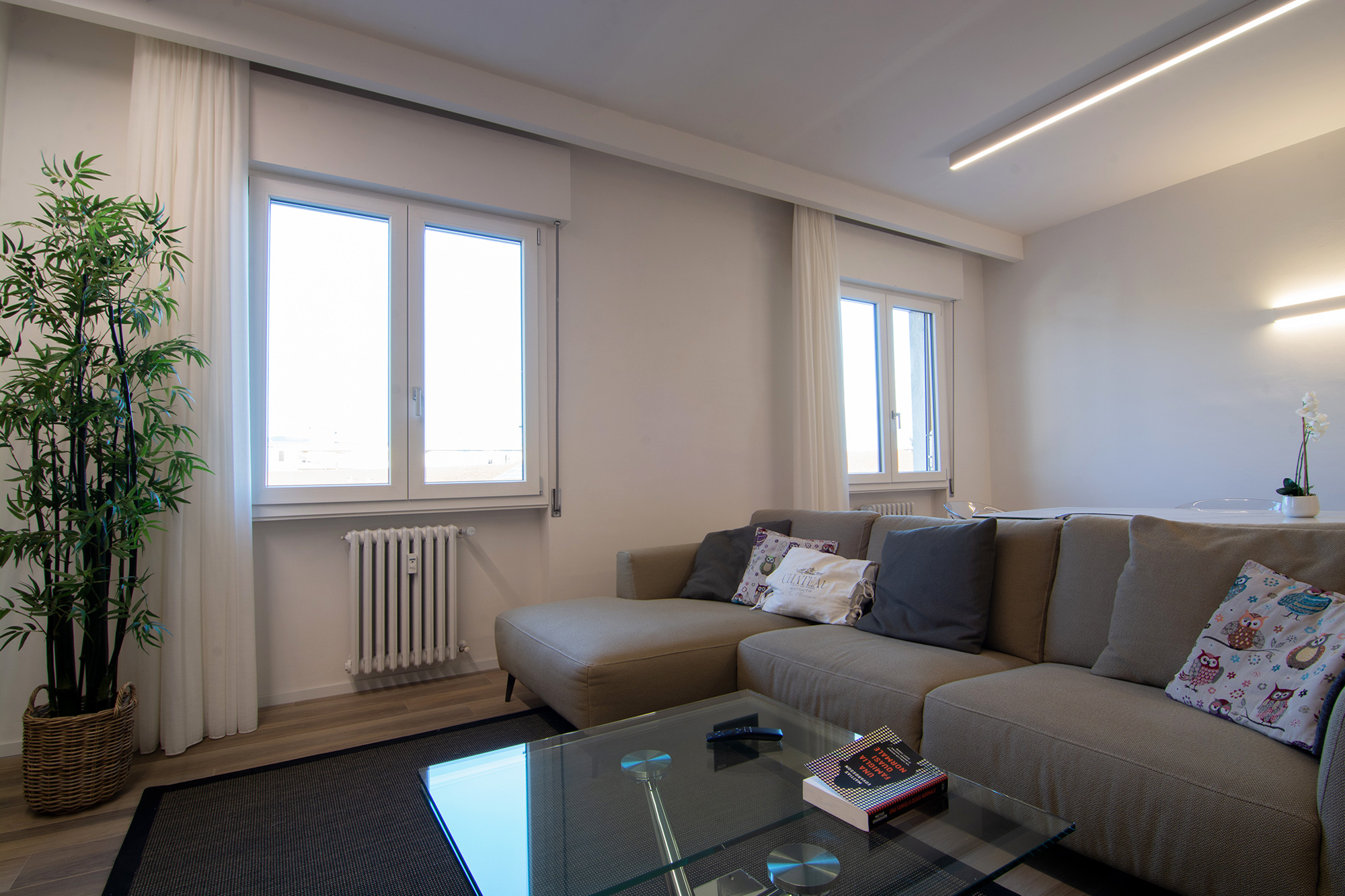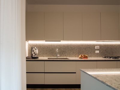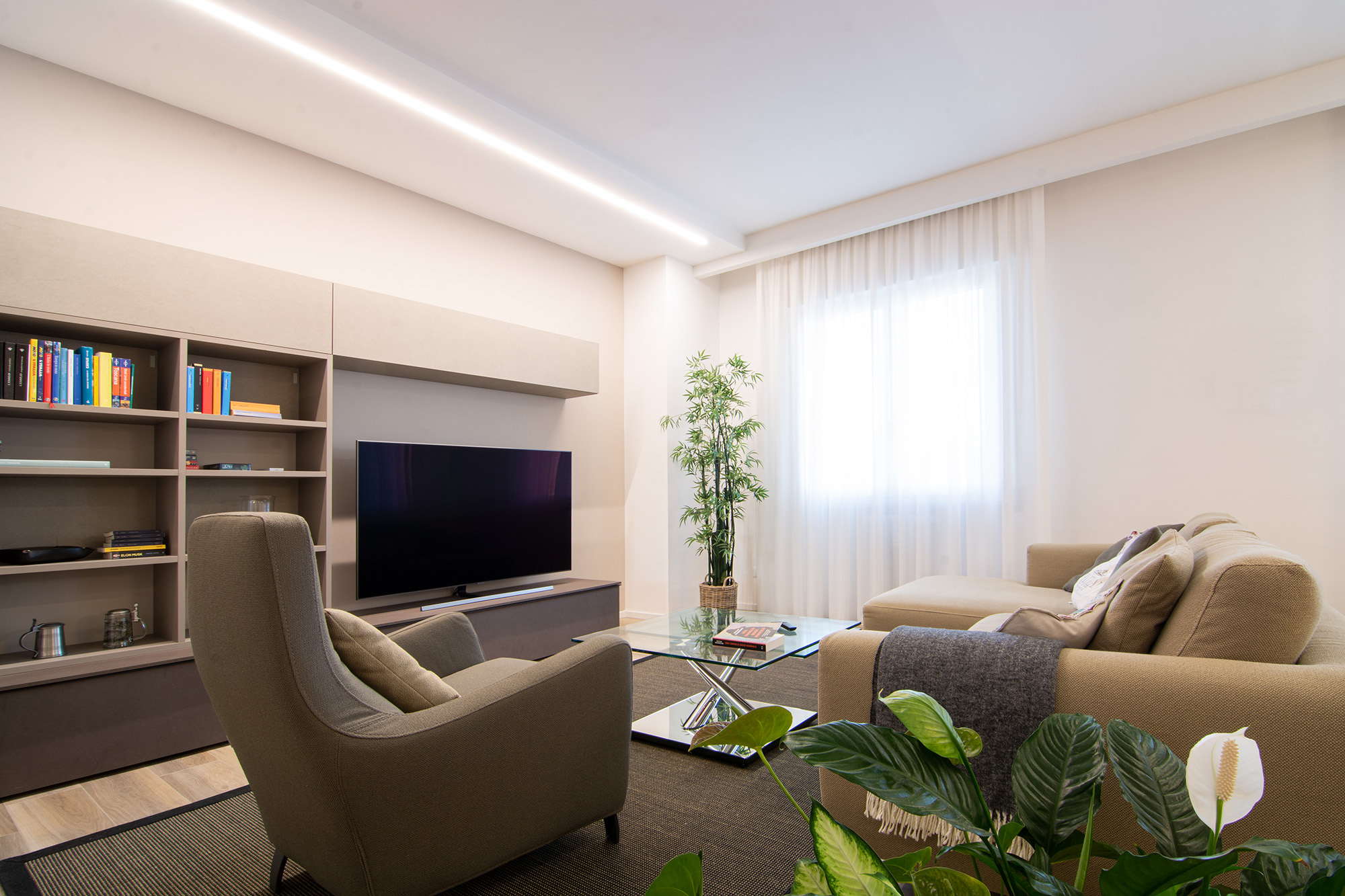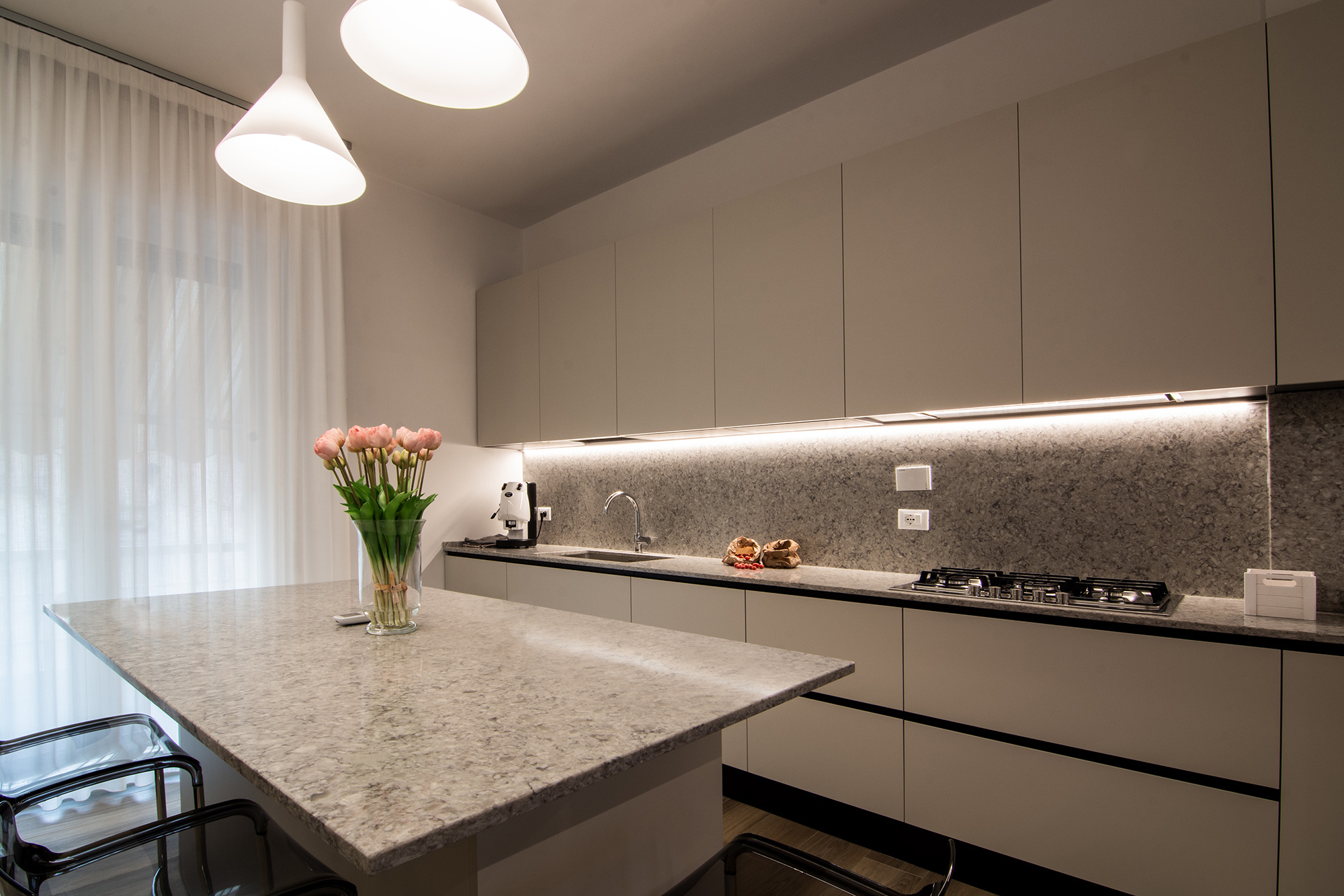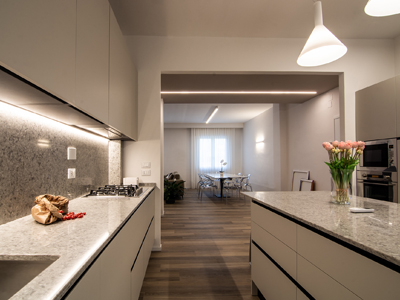 Per l’illuminazione sono stati utilizzati profili led molto tecnici con luce bianca dimmerabili in tutto l’appartamento.