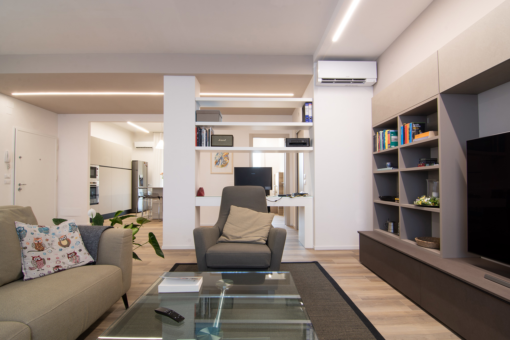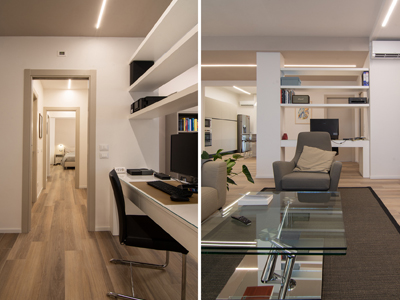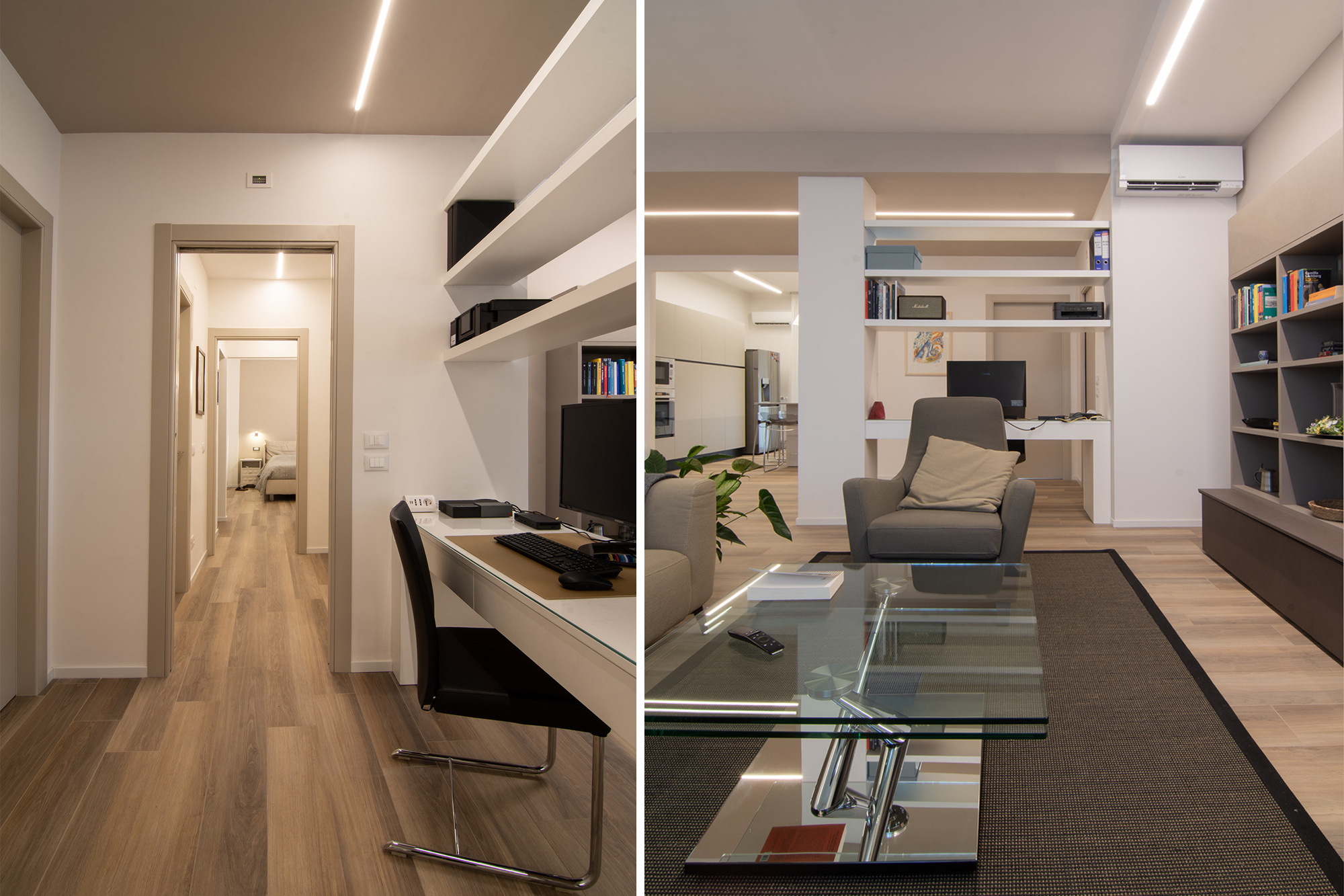 Nella zona giorno è stato creato un angolo attrezzato per lo smart working minuto di una grande scrivania disegnata su misura realizzata in MDF laccato bianco e piano in vetro affiancata da comode mensole che fungono da zona filtro tra disimpegno e zona divani
