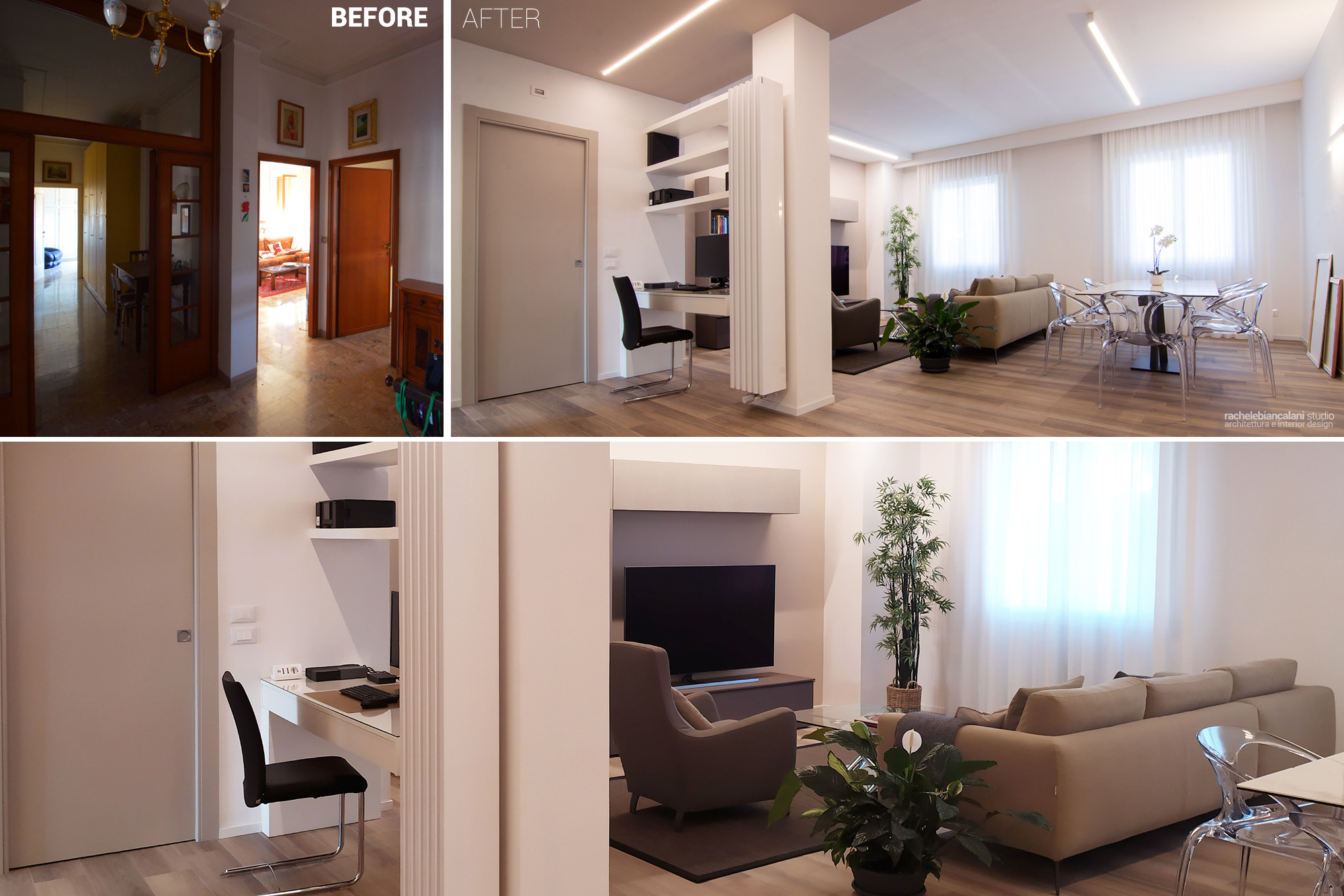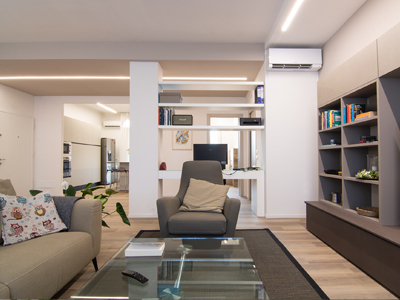 Come abbiamo proceduto? Innanzi tutto modificando gli spazi che erano davvero poco funzionali, aprendoli alla luce e rendendoli più luminosi e flessibili. Abbiamo effettuato alcune demolizioni di pareti non portanti perché fortunatamente la struttura presentava pilastri in calcestruzzo armato ed era facilmente modificabile senza dover intervenire sulle strutture portanti. I ragazzi preferivano finiture pratiche e minimali che sono state accostate da colori neutri e chiari: il bianco e il tortora.