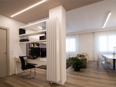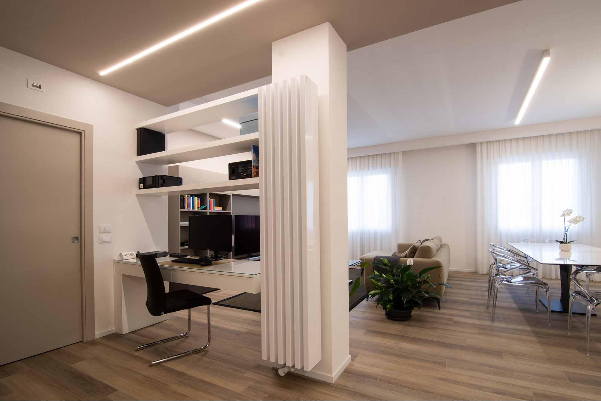 Il nuovo termoarredo all’ingresso, in posizione centrale è di TUBES, modello Soho bianco lucido.