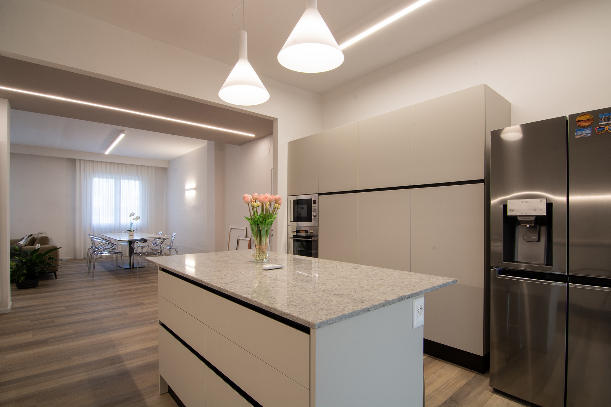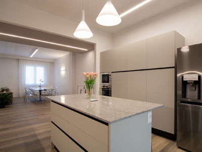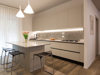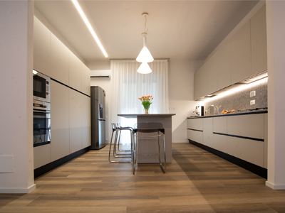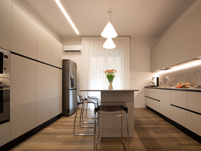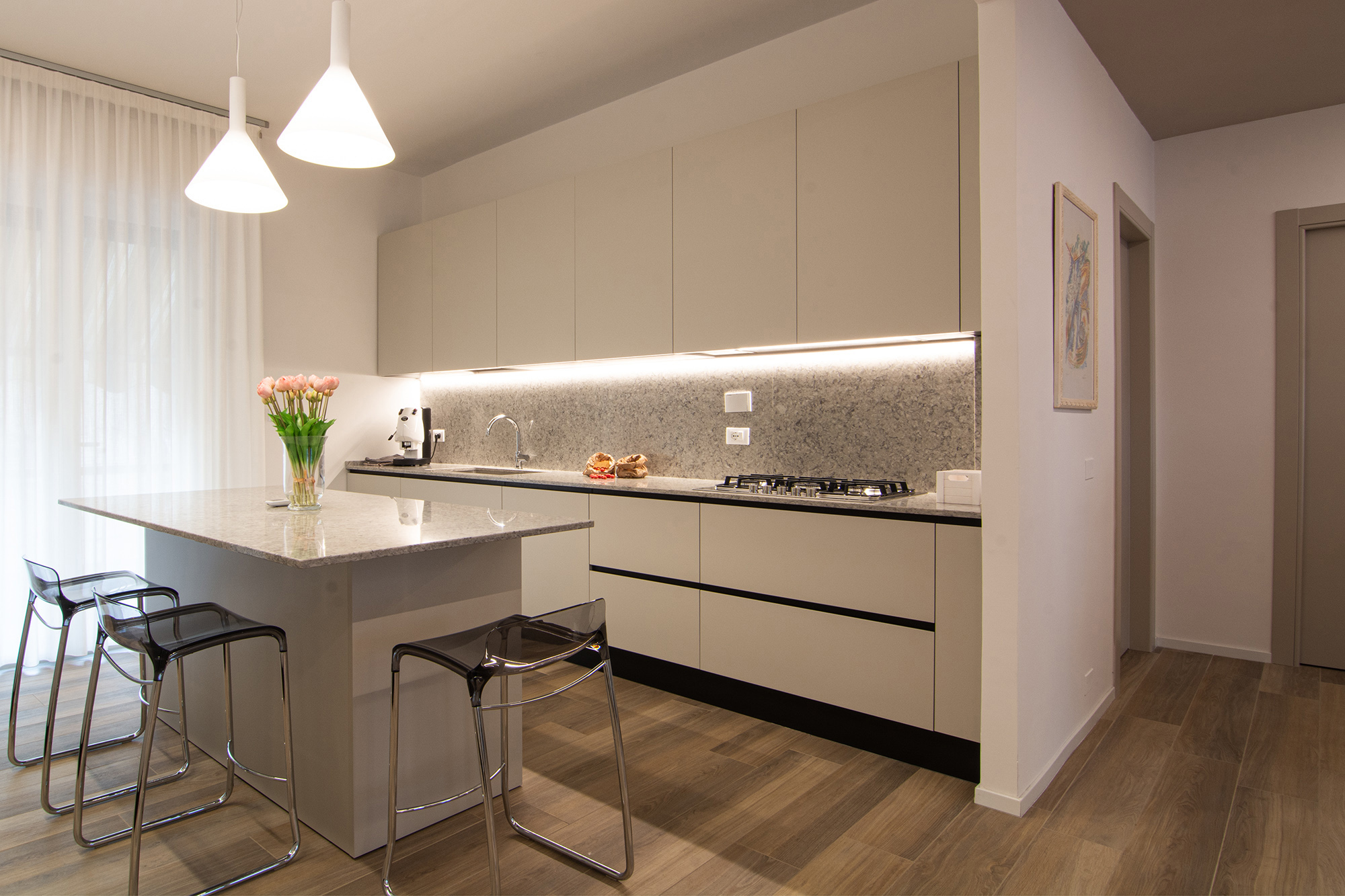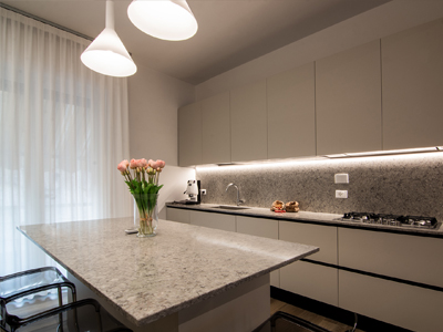 La cucina esistente è stata arredata in modo molto funzionale con una grande isola snack al centro munita di piano rivestito in quarzo ricomposto lucido (Technistone, colore Noble Perlato Luna) come il top e lo schienale della cucina. Tra le dotazioni un grande frigo doppio all’americana.