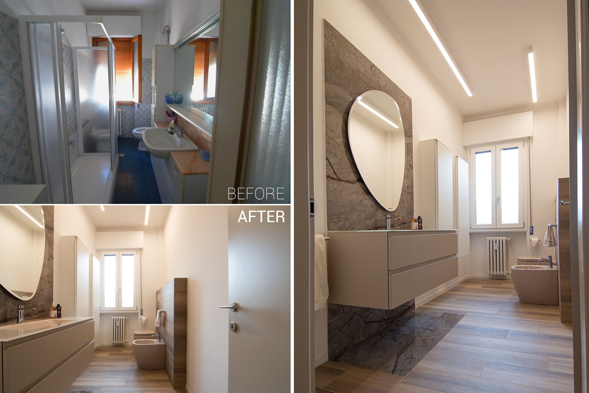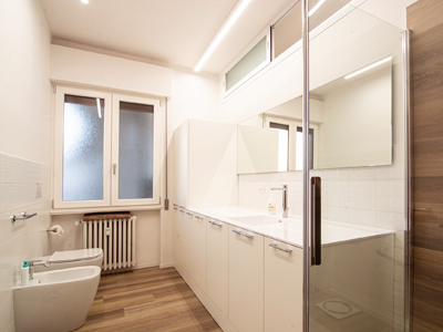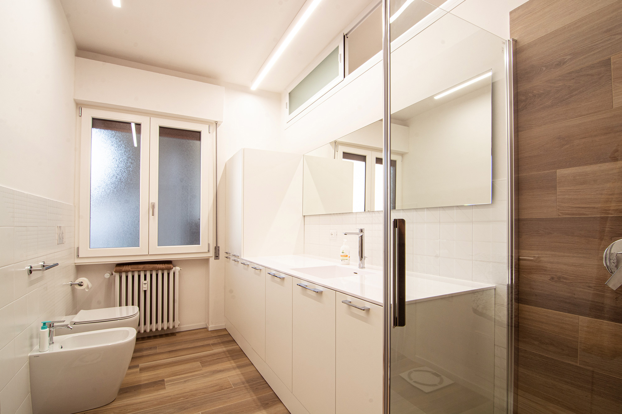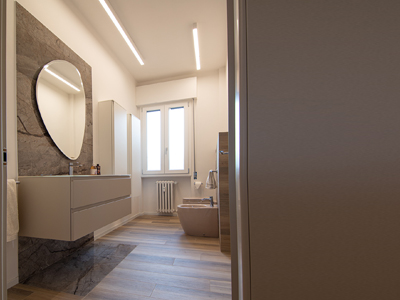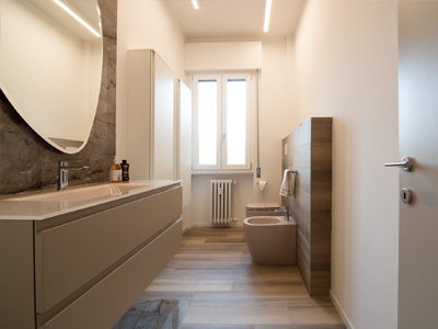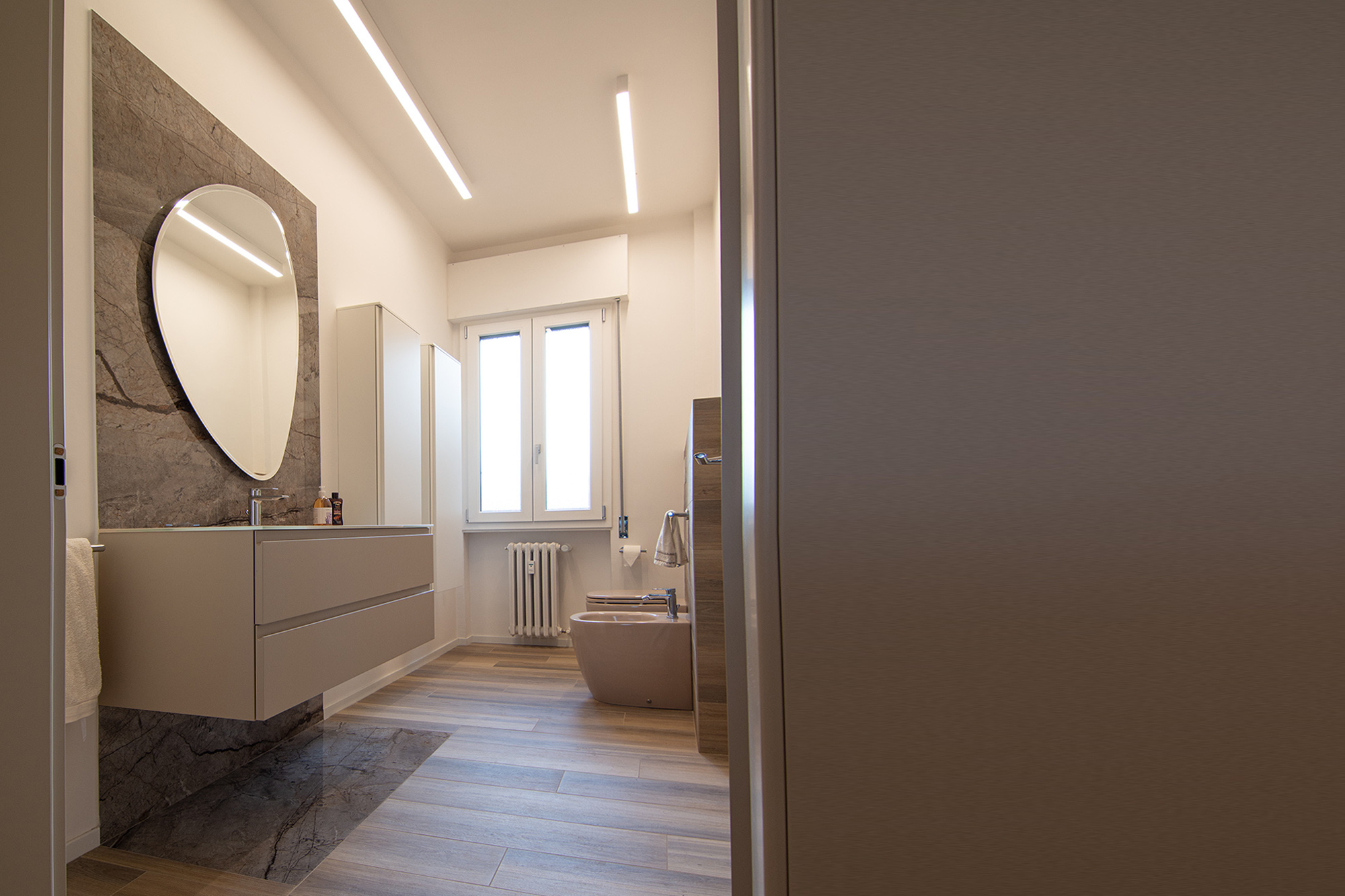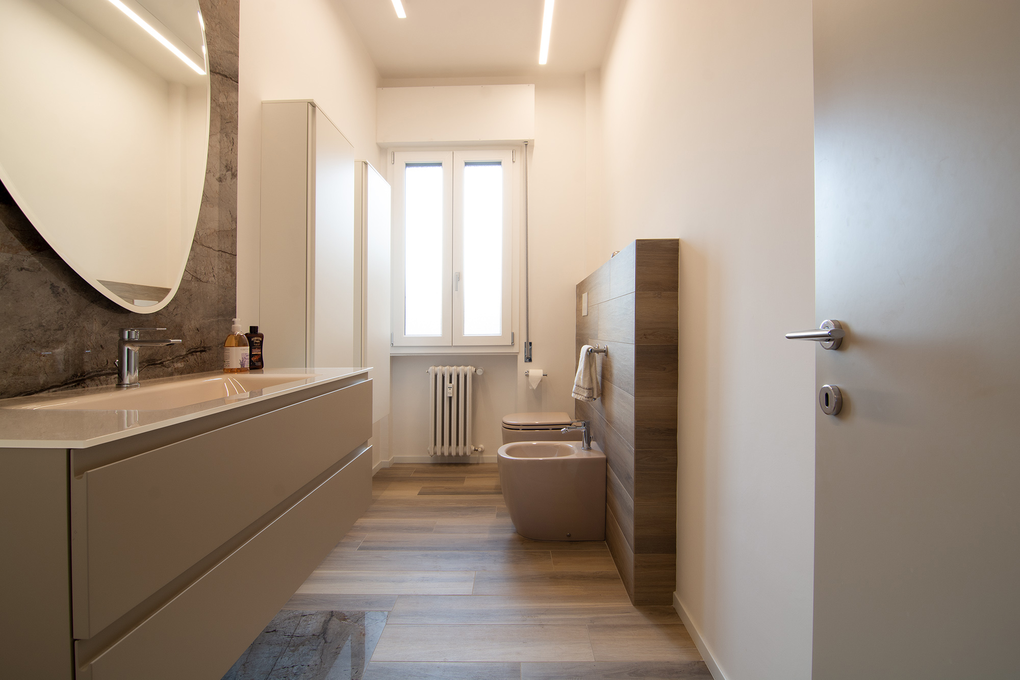 Il pavimento è in grès effetto legno della Ceramica Supergres, modello Natural Appeal. Questo rivestimento è stato usato in tutto l’appartamento bagni compresi. Nei due bagni è stato utilizzato anche in parete e abbinato ad altri due tipi di rivestimento: Ceramica Bardelli "TEKNE" , formato 20x20, colo-re bianco, decori geometrici che creano una texture in rilievo bianco su bianco per il grande bagno lavanderia; Ceramica Imola “The Room” SAN PE’ per le lastre effetto marmo color tortora lucido per il rivestimento a parete e a terra dietro e sotto al lavabo nel bagno ospiti.