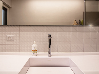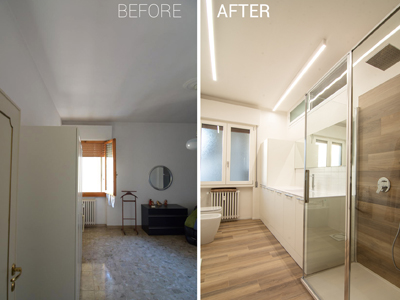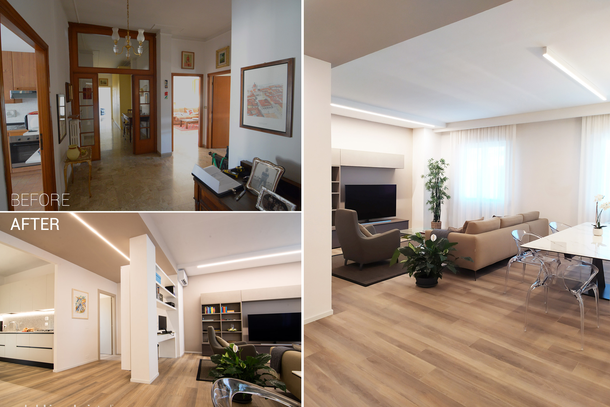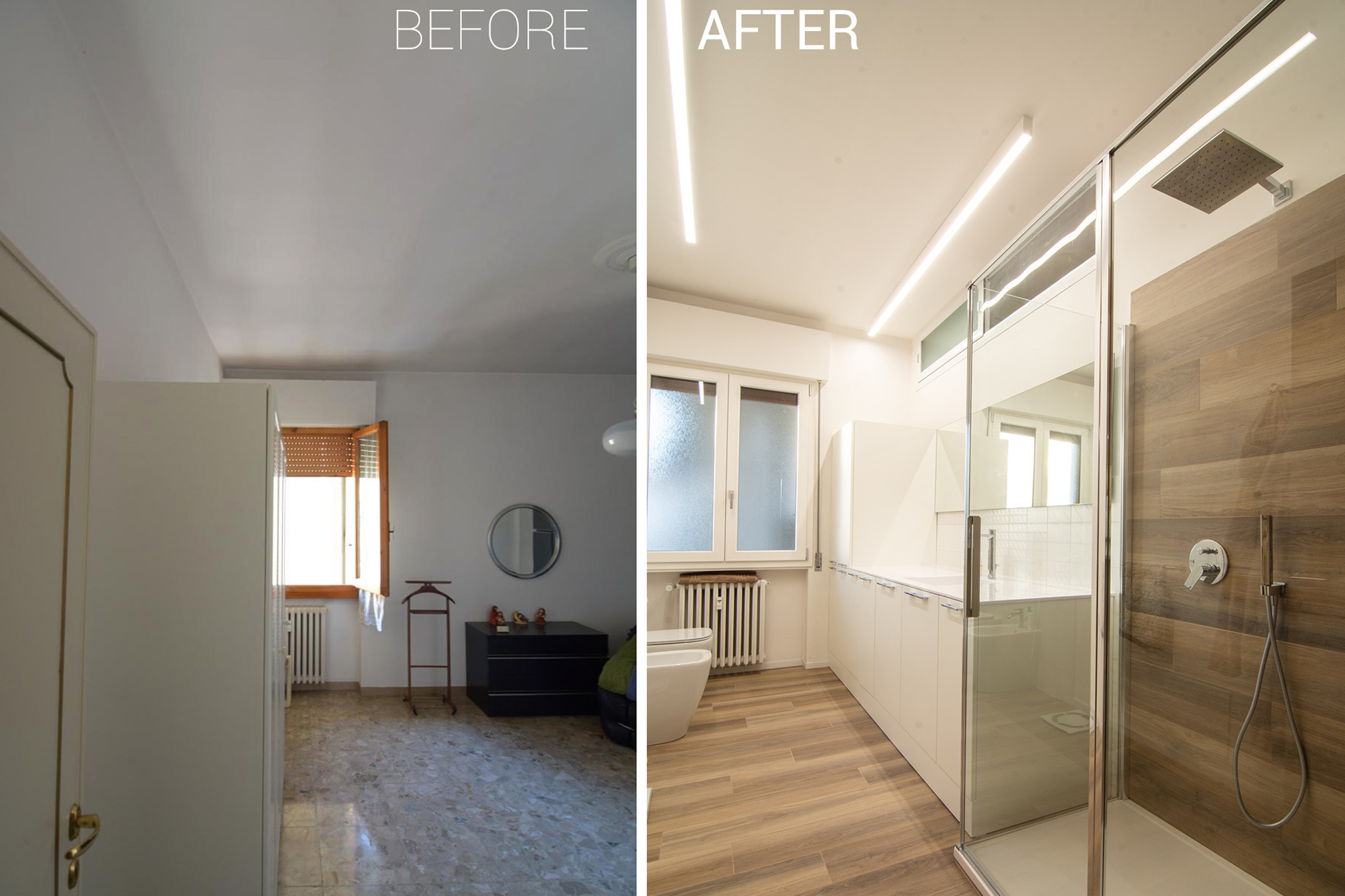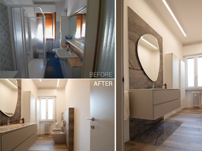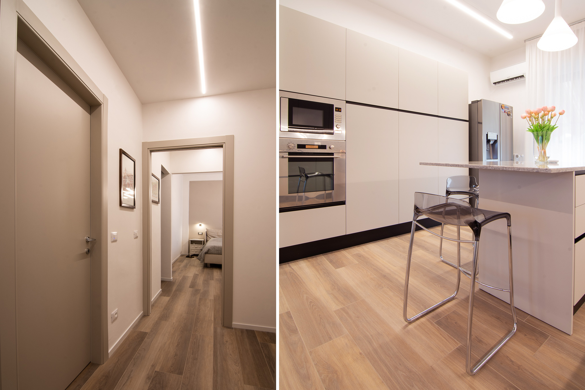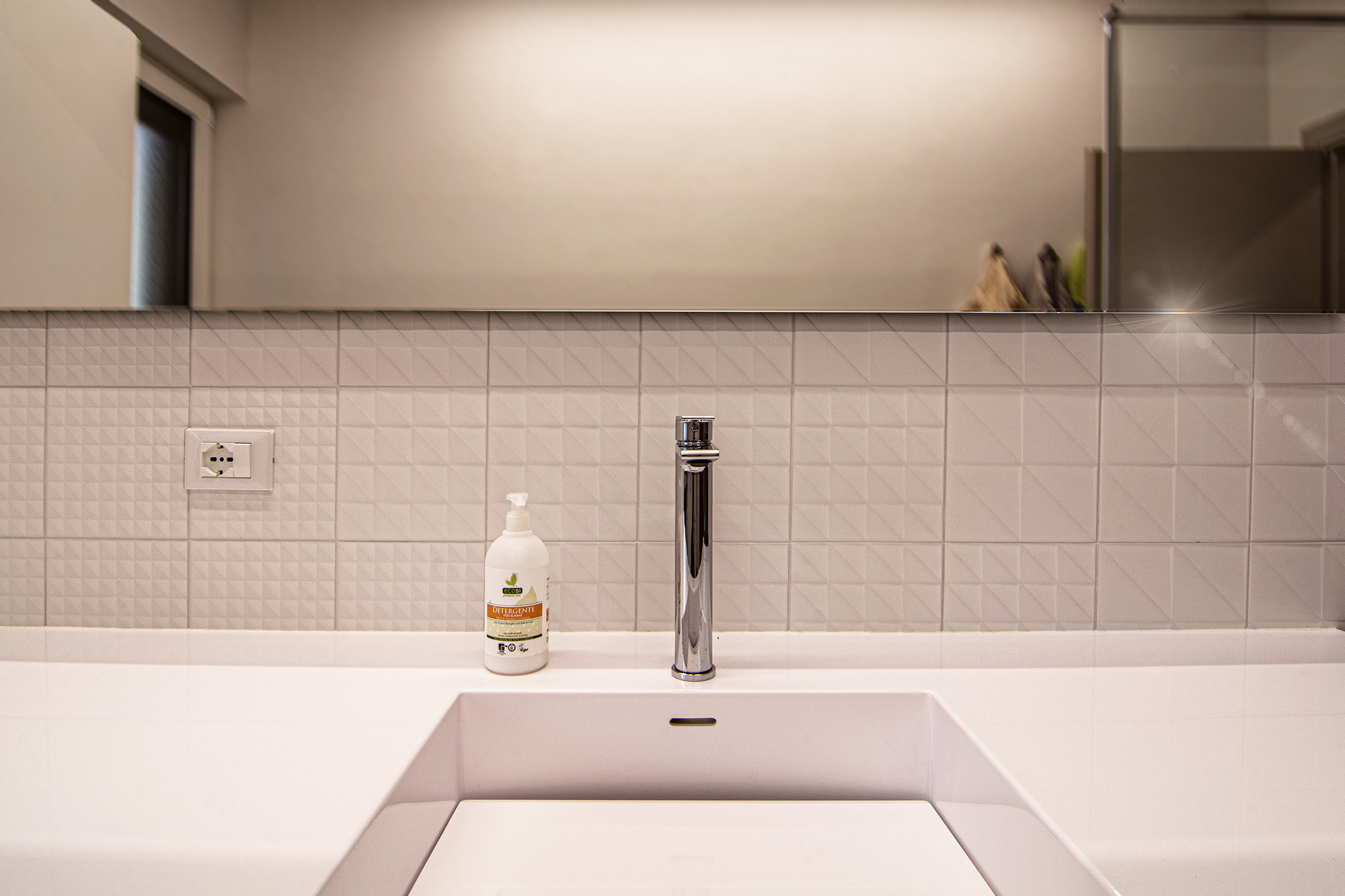 Il pavimento è in grès effetto legno della Ceramica Supergres, modello Natural Appeal. Questo rivestimento è stato usato in tutto l’appartamento bagni compresi. Nei due bagni è stato utilizzato anche in parete e abbinato ad altri due tipi di rivestimento: Ceramica Bardelli "TEKNE" , formato 20x20, colo-re bianco, decori geometrici che creano una texture in rilievo bianco su bianco per il grande bagno lavanderia; Ceramica Imola “The Room” SAN PE’ per le lastre effetto marmo color tortora lucido per il rivestimento a parete e a terra dietro e sotto al lavabo nel bagno ospiti.