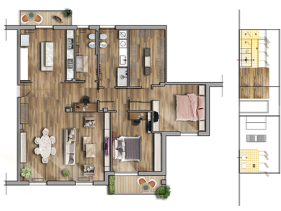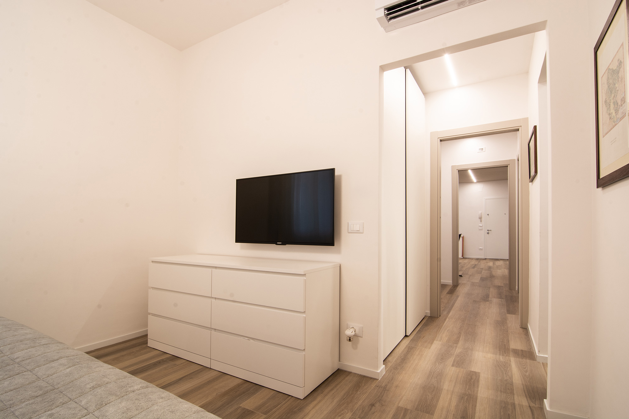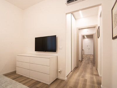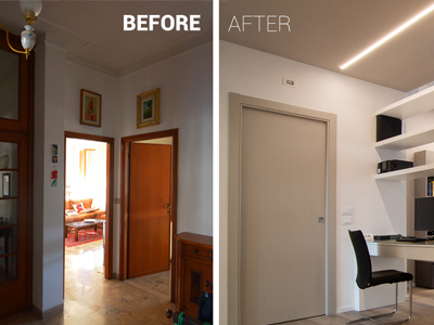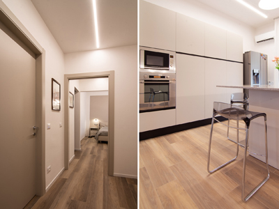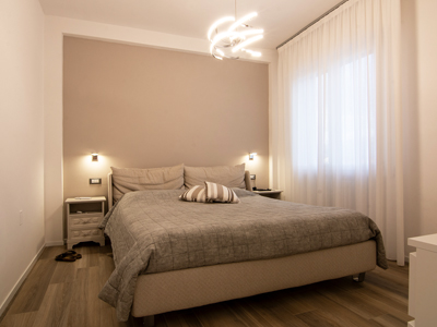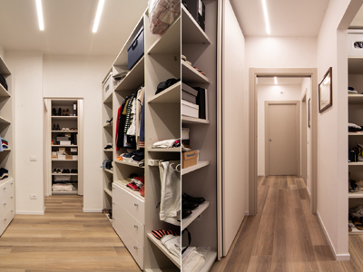 La zona notte è stata completamente stravolta dal progetto architettonico: una delle camere è stata trasformata in bagno-lavanderia e in una grande cabina armadio, il soggiorno che si trovava in una posizione defilata rispetto alla cucina è stato reso open space e comunicante con la cucina stessa mentre la seconda camera è stata ricavata nella zona notte accessibile da un disimpegno dedicato.
