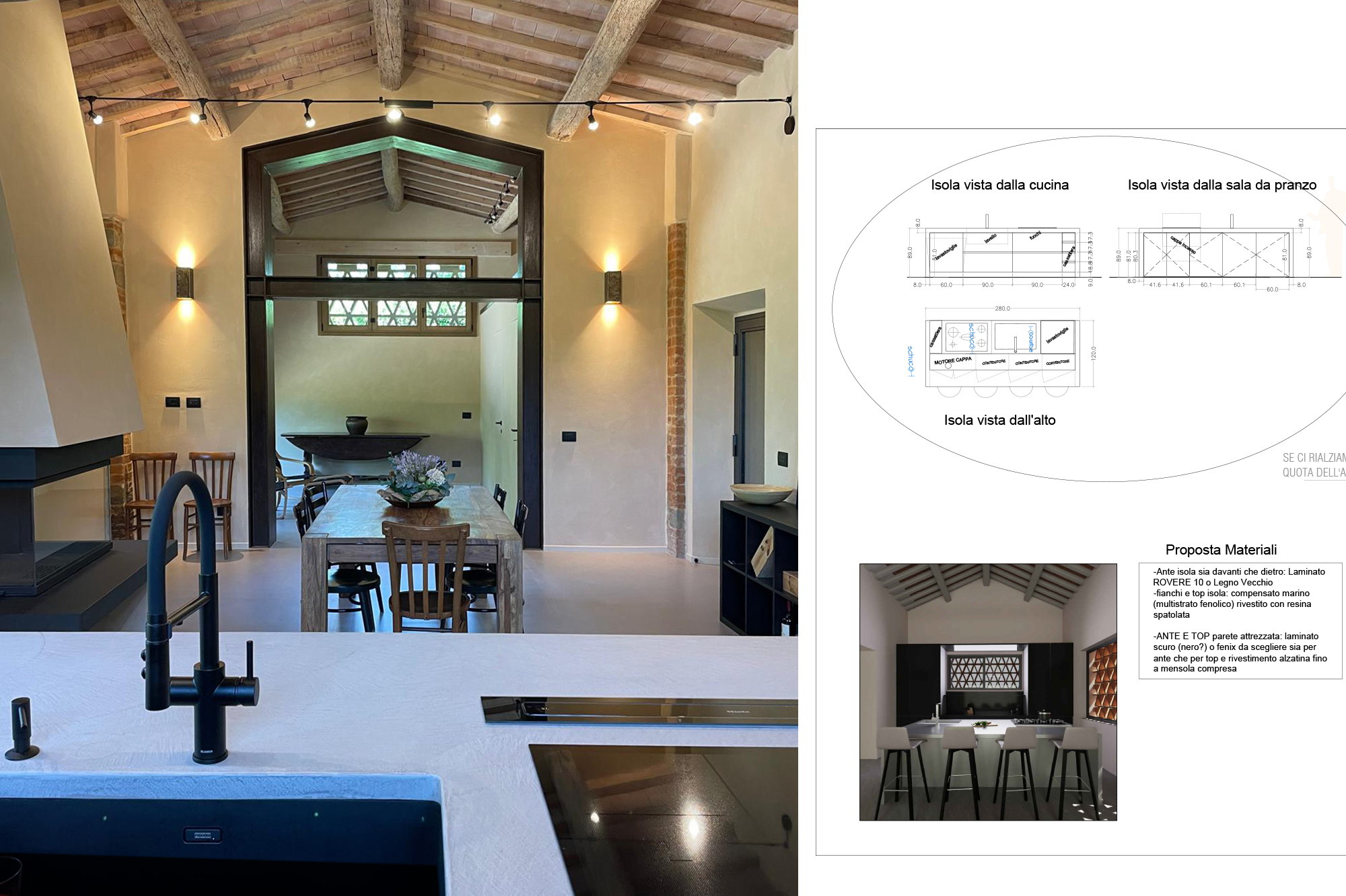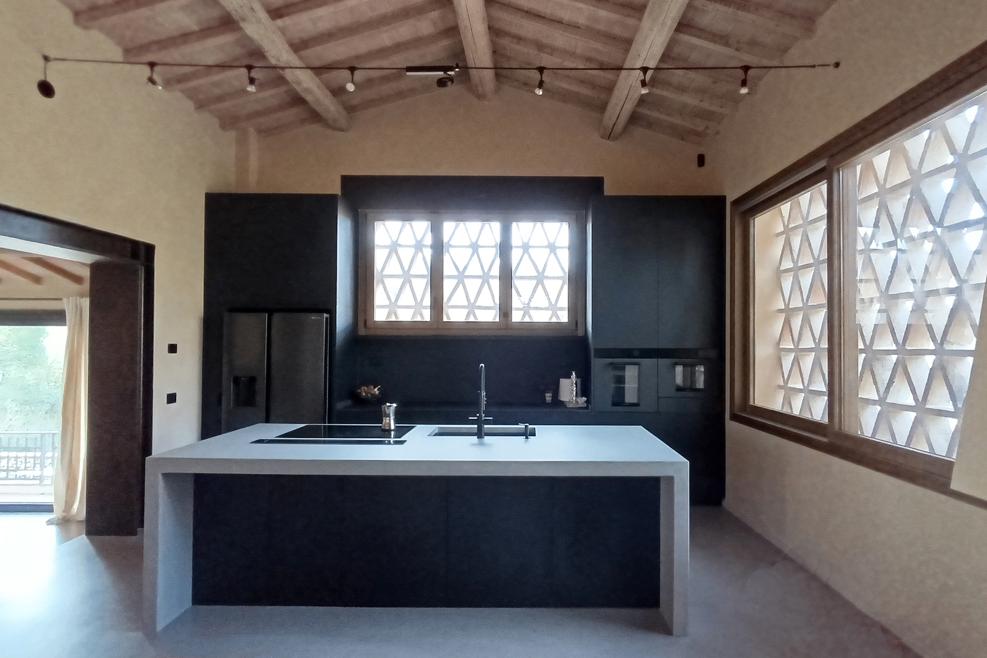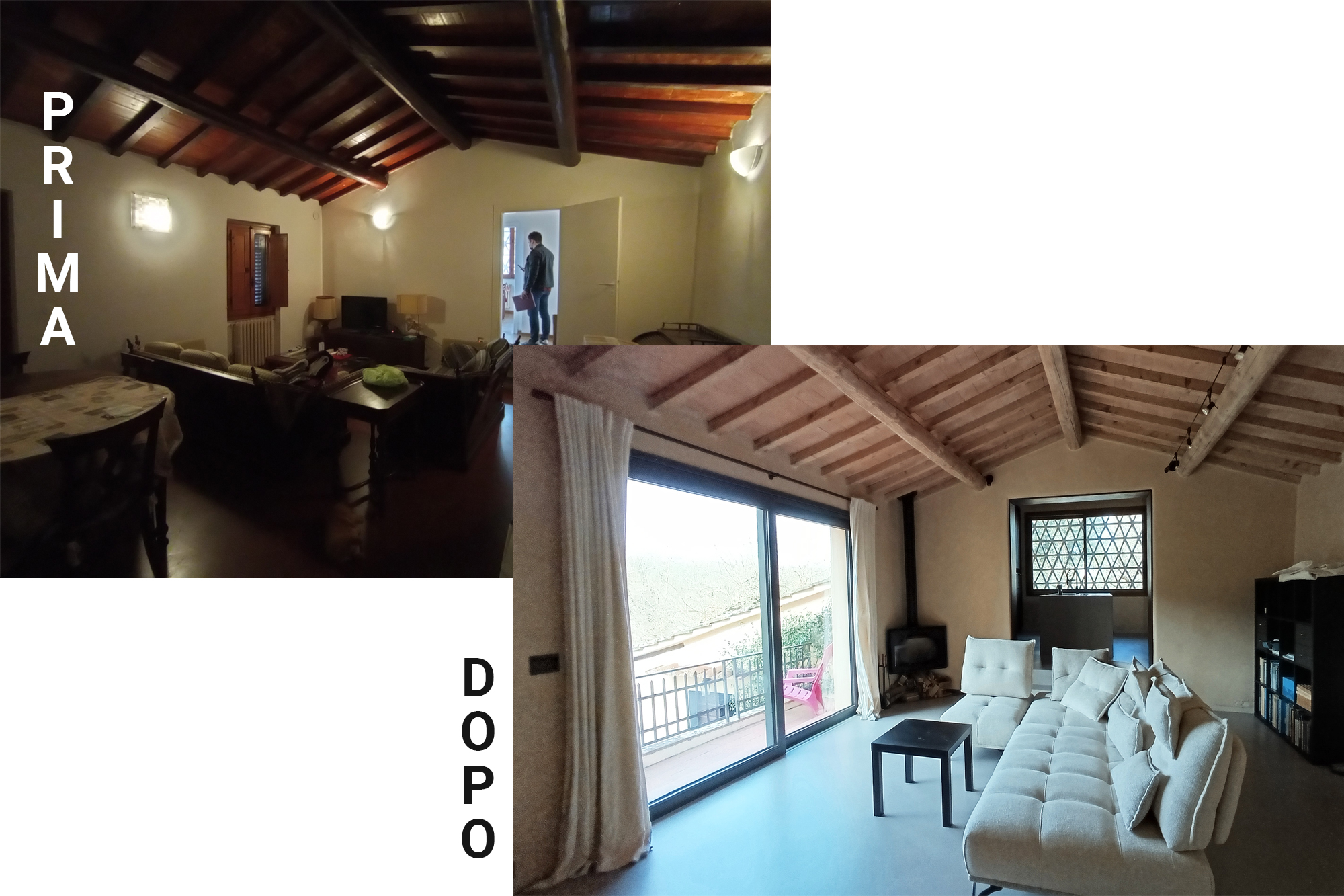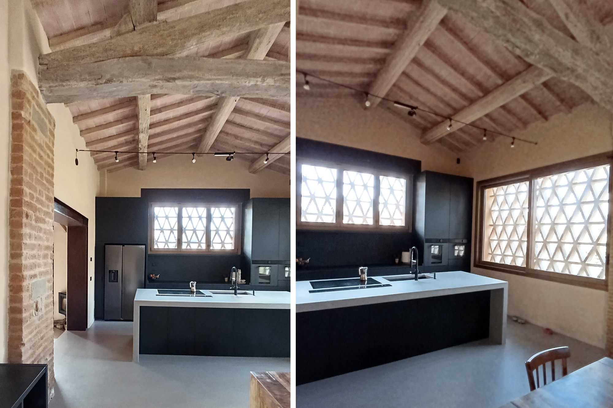 Una delle scelte fondamentali come progettista è stata quella di eliminare tutto il superfluo dal fienile 600esco che era stato controsoffittato e trasformato in appartamento in una ristrutturazione poco rispettosa degli anni’70. Altro intervento fondamentale da parte mia far riaprire tutte le gelosie che erano state murate e trasformare le piccole aperture del living in una enorme parete vetrata con vista sulla campagna circostante.