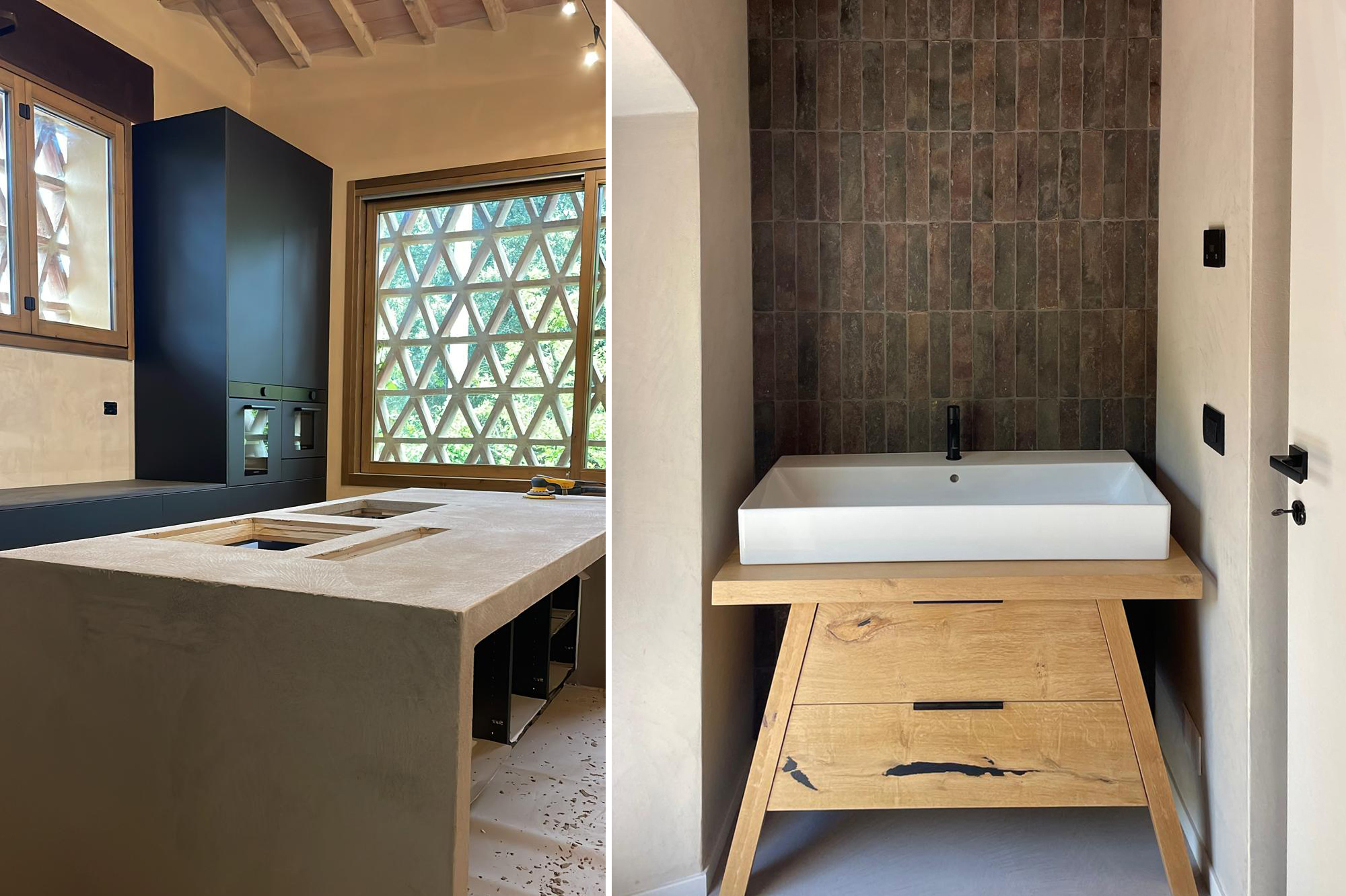 Decorazioni/rivestimenti parietali: resina nei bagni e come rivestimento dell’isola cucina, rivestimento parietale nei bagni in cotto artigianale fatto a mano.