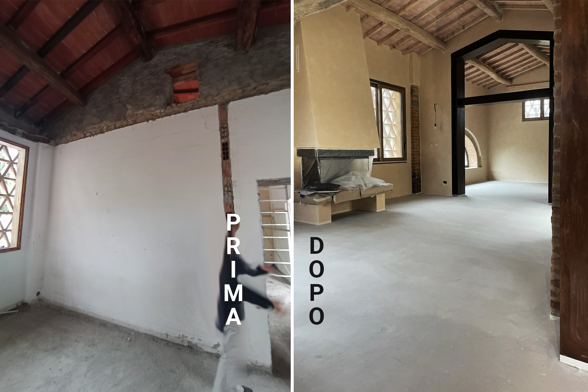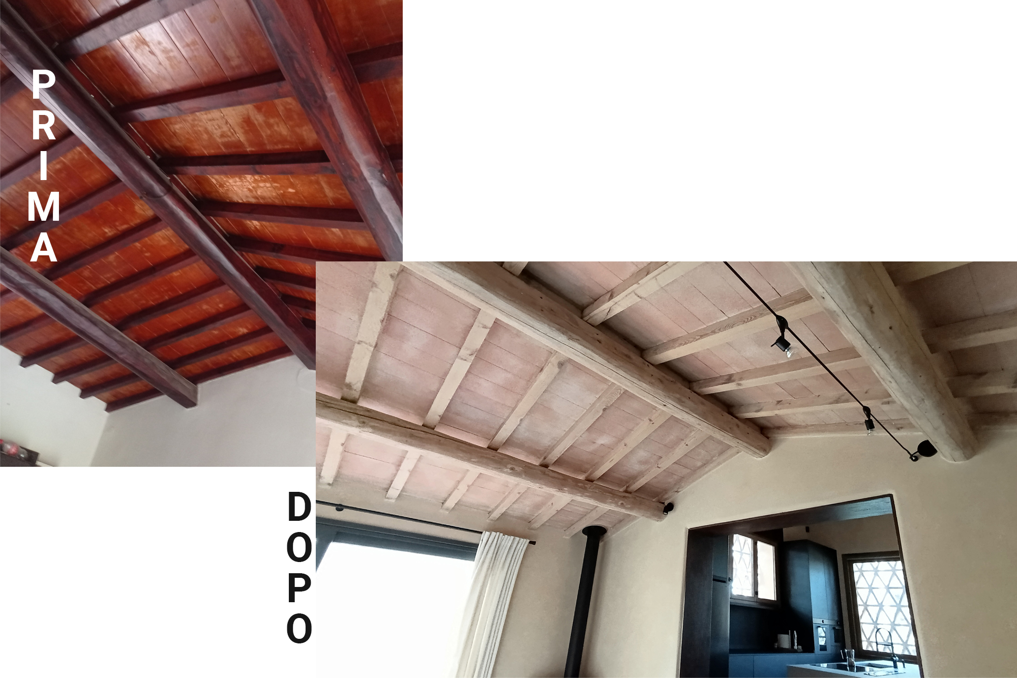 In ultimo, ma non per importanza, la decisione della progettista di far sabbiare e velare i soffitti con pianelle e travi a vista lasciando comunque visibile il colore originale del legno e delle pianelle in cotto, tecnica che utilizzo da innumerevoli anni in tutte le ristrutturazioni in cui voglio svecchiare dei solai troppo “pesanti”. Nelle foto del Prima e del Dopo si vede in piena evidenza quanto gli spazi ne abbiano giovato.