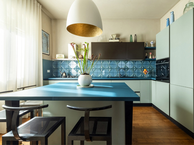 vecchia cucina e nuovi moduli. Il colore blu pavone utilizzato per il laminato del piano cucina riprende il
