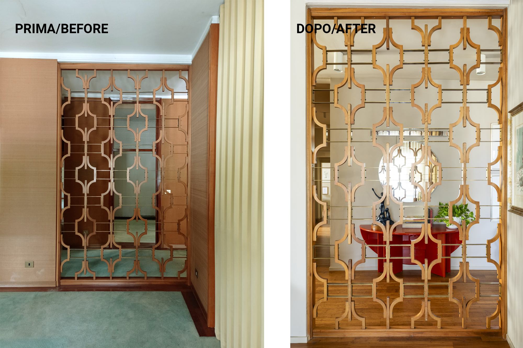 4-Mantenere le grandi porte a soffietto e il pannello in legno e ottone del living