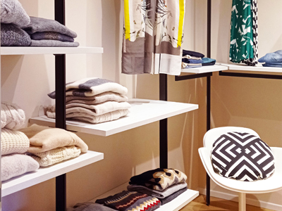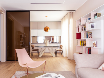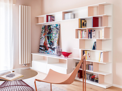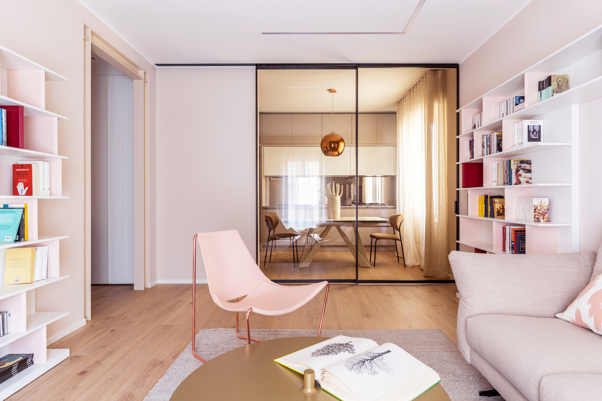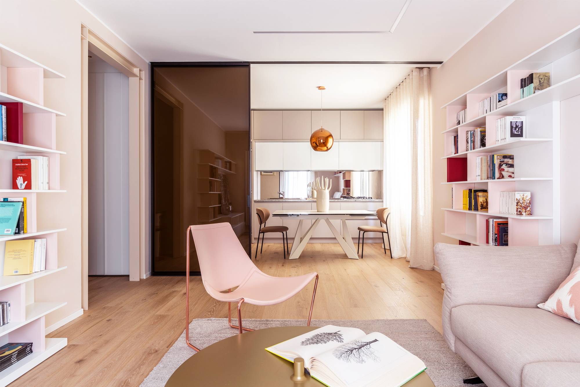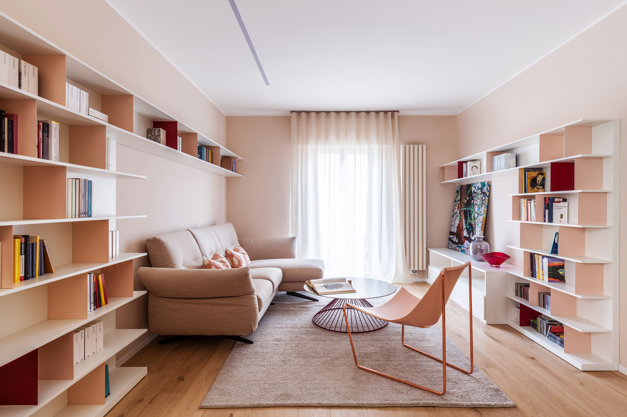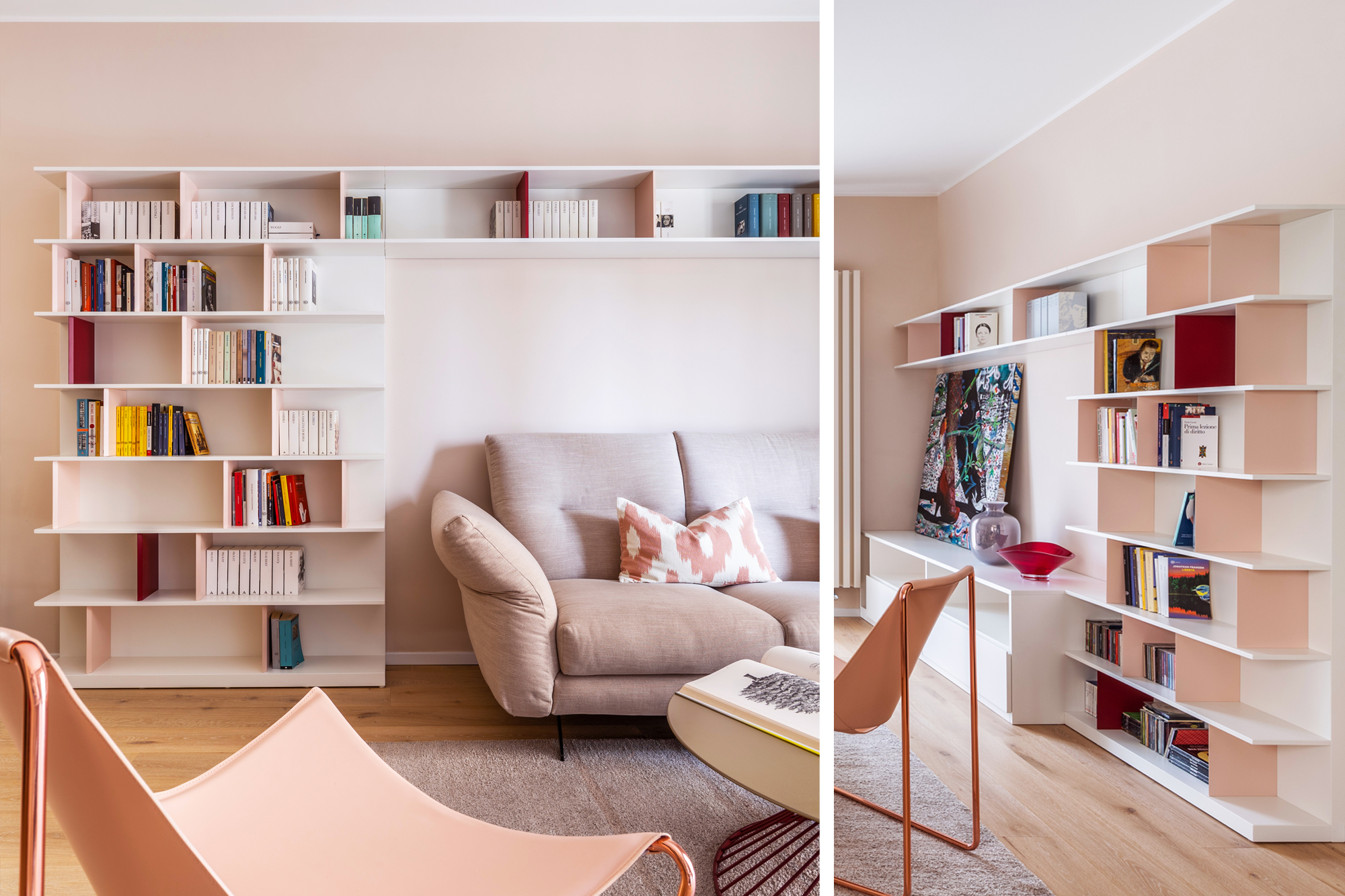 Molti degli arredi dell’abitazione sono stati realizzati su progetto, come ad esempio la libreria del living, tutta in legno laccato in tre diversi colori e in cui i reggilibro verticali hanno una forma smussata in modo da sembrare sottili quasi fossero in metallo. La zona conversazione è composta da un divano lineare con schienali e braccioli pieghevoli e da una poltrona in cuoio rosa italiano e metallo rosato.