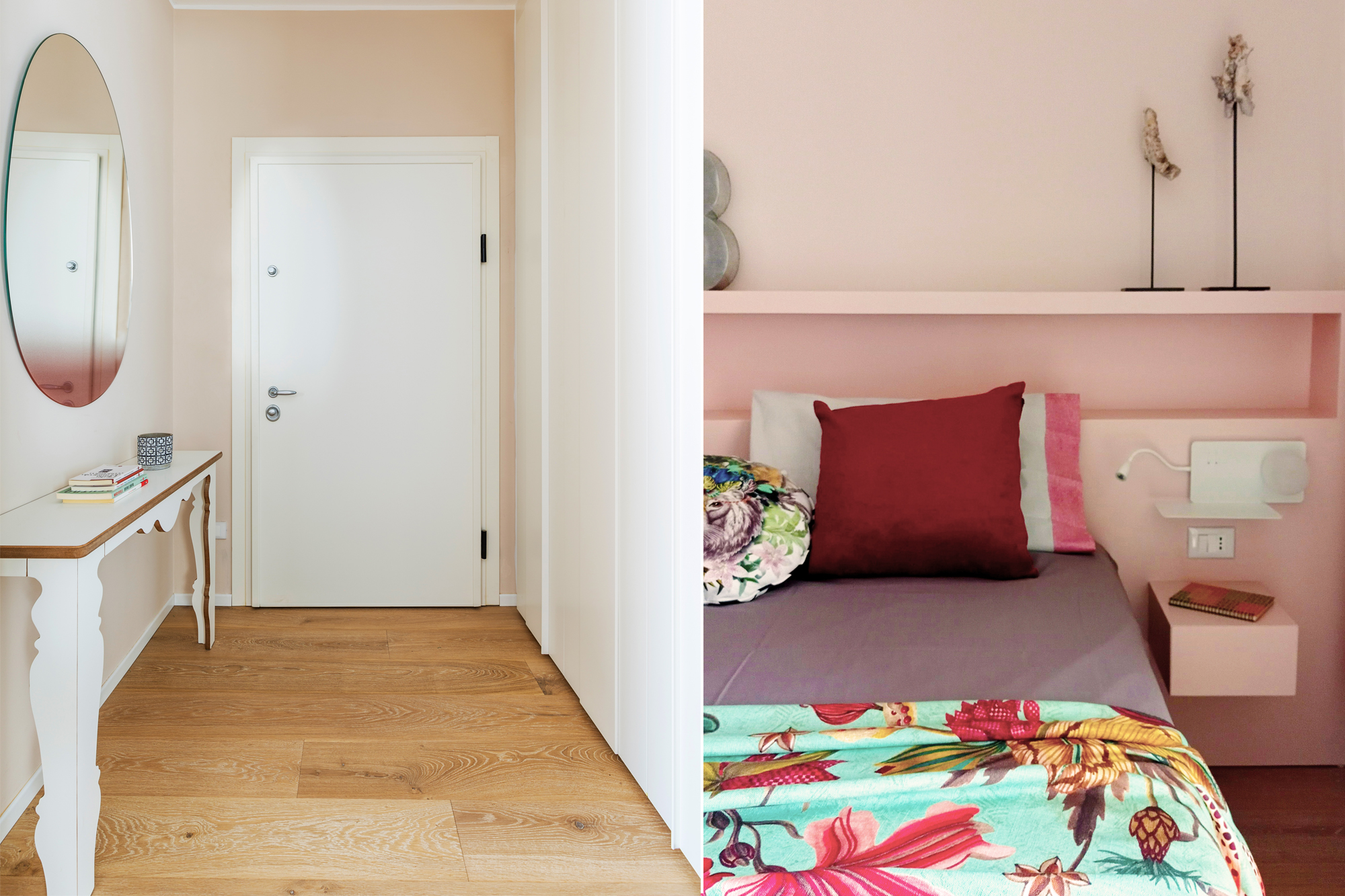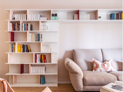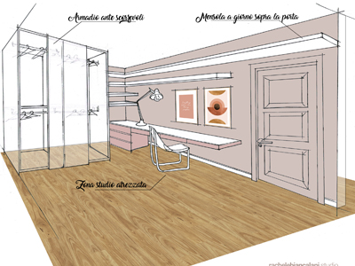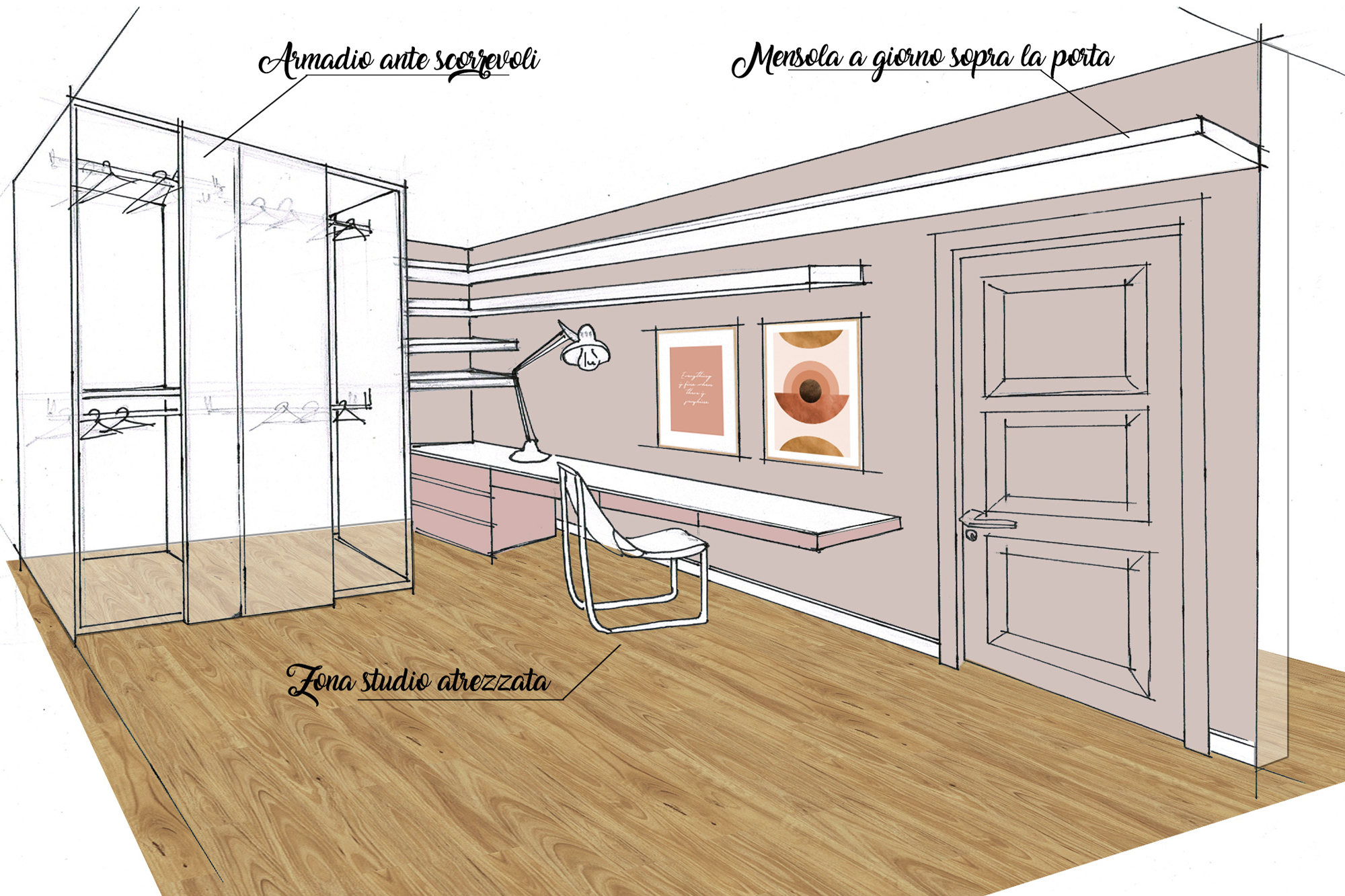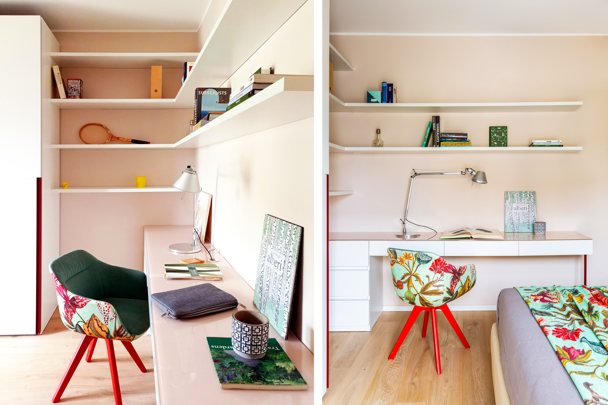L’abitazione ha molto spazio per i libri sia in camera che nel living, come espressamente richiesto dalla Committente. Nella camera da letto è stato progettato un grande angolo Home Office per eventuale Smart Working tramite mensole/librerie a giorno e una grande scrivania con cassetti completata da top in cristallo retroverniciato rosa cipria.