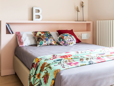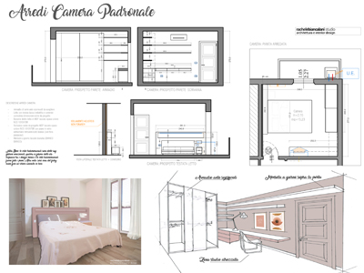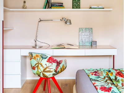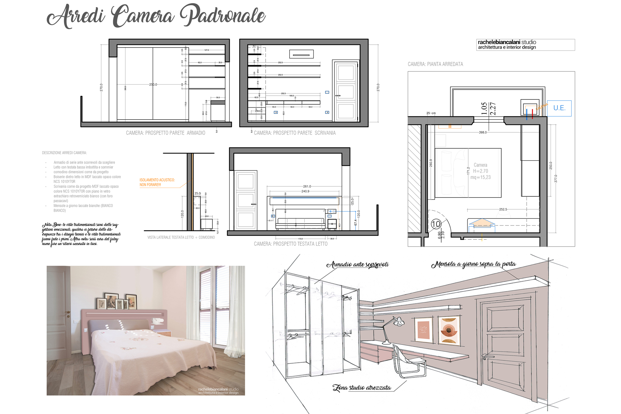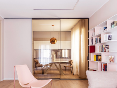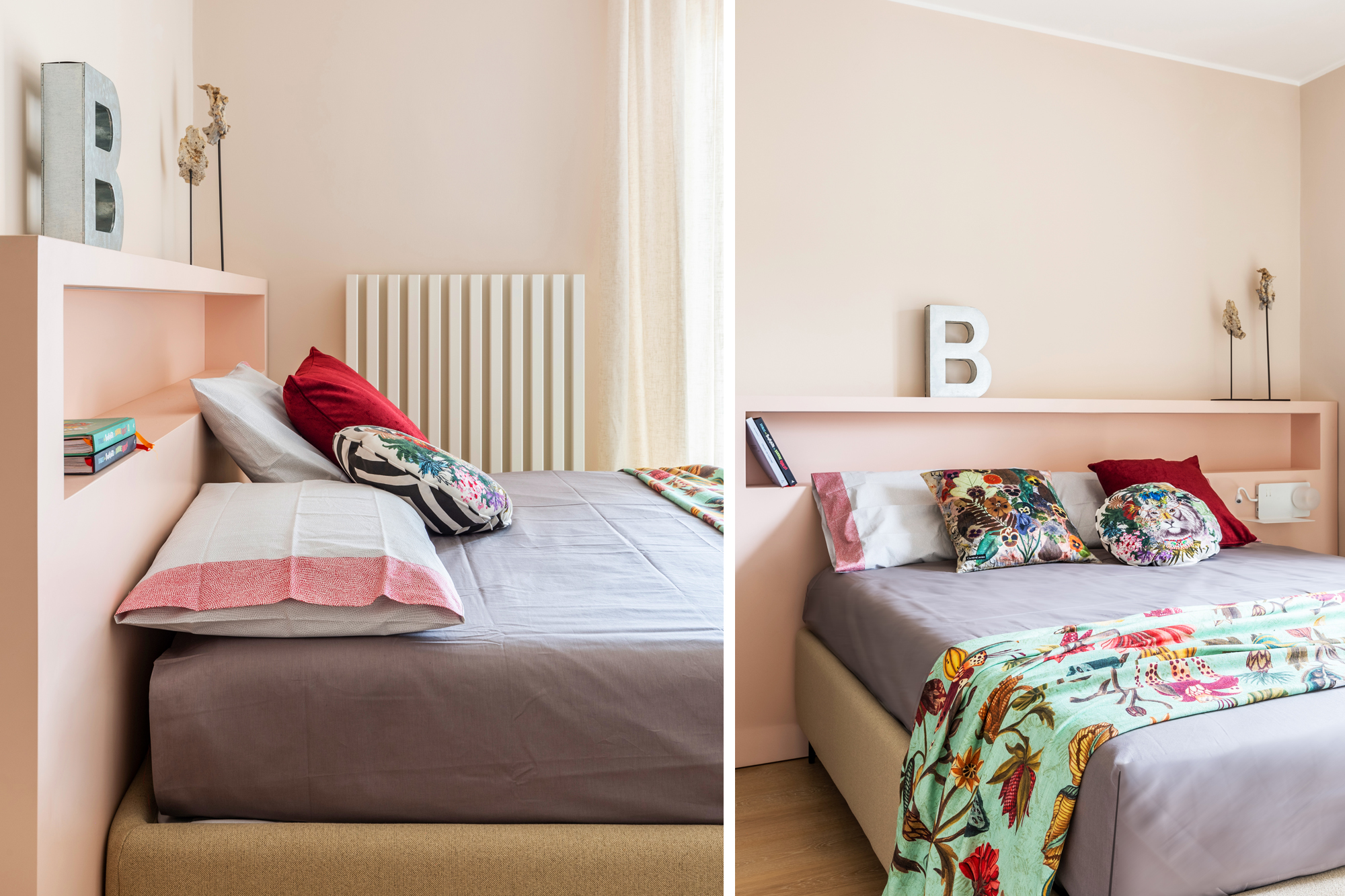 L’abitazione ha molto spazio per i libri sia in camera che nel living, come espressamente richiesto dalla Committente. Nella camera da letto è stato progettato un grande angolo Home Office per eventuale Smart Working tramite mensole/librerie a giorno e una grande scrivania con cassetti completata da top in cristallo retroverniciato rosa cipria.