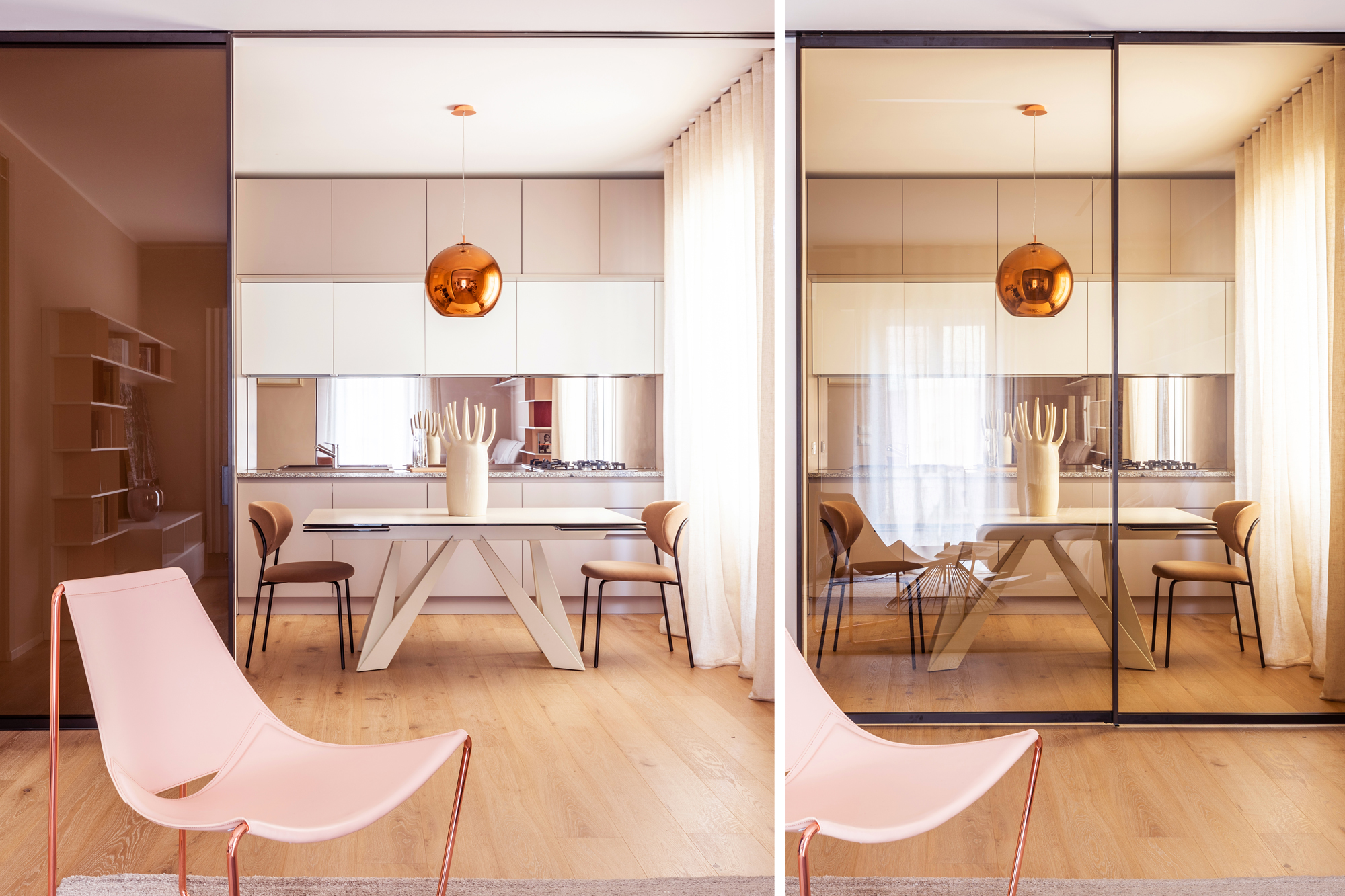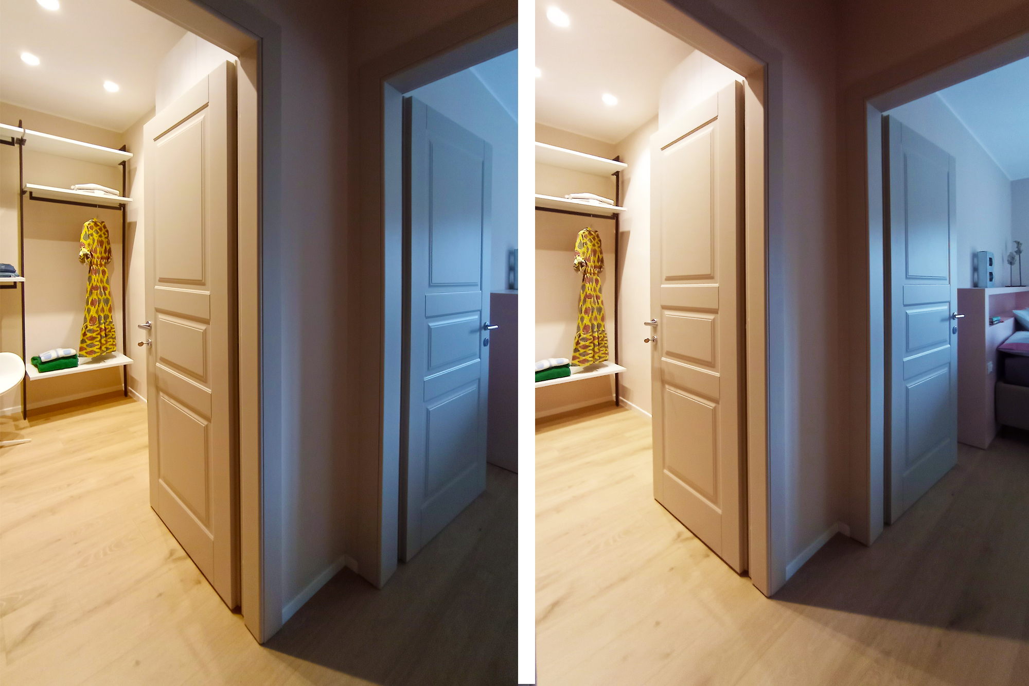 Un Progetto Architettonico ben studiato ha permesso, con poche semplici modifiche, di razionalizzare gli spazi creando ambienti di servizio adiacenti a spazi con funzione primaria che aggiungono valore all’intera abitazione. Il living ha un piccolo ingresso attrezzato con grande armadio a muro, la cucina ha la sua dispensa/ripostiglio dove trovano spazio anche lavatrice e asciugatrice, la grande camera da letto ha una cabina armadio accessibile dal piccolo disimpegno attiguo. La cucina è divisa dal living da una grande porta in cristallo fumé composta da due ante scorrevoli su binario a due vie incassato nel controsoffitto in cartongesso.