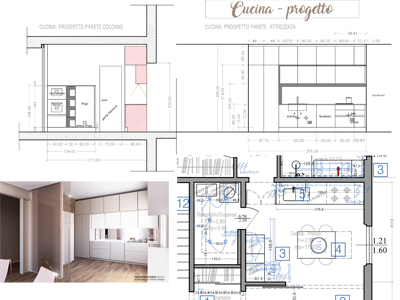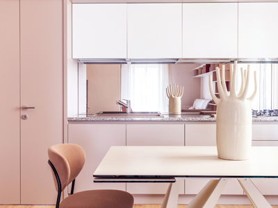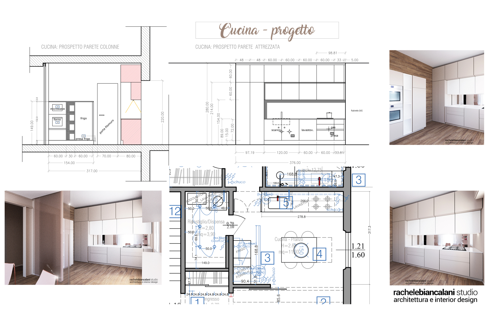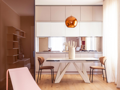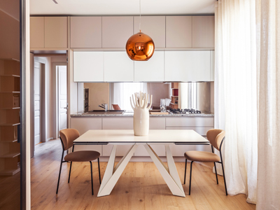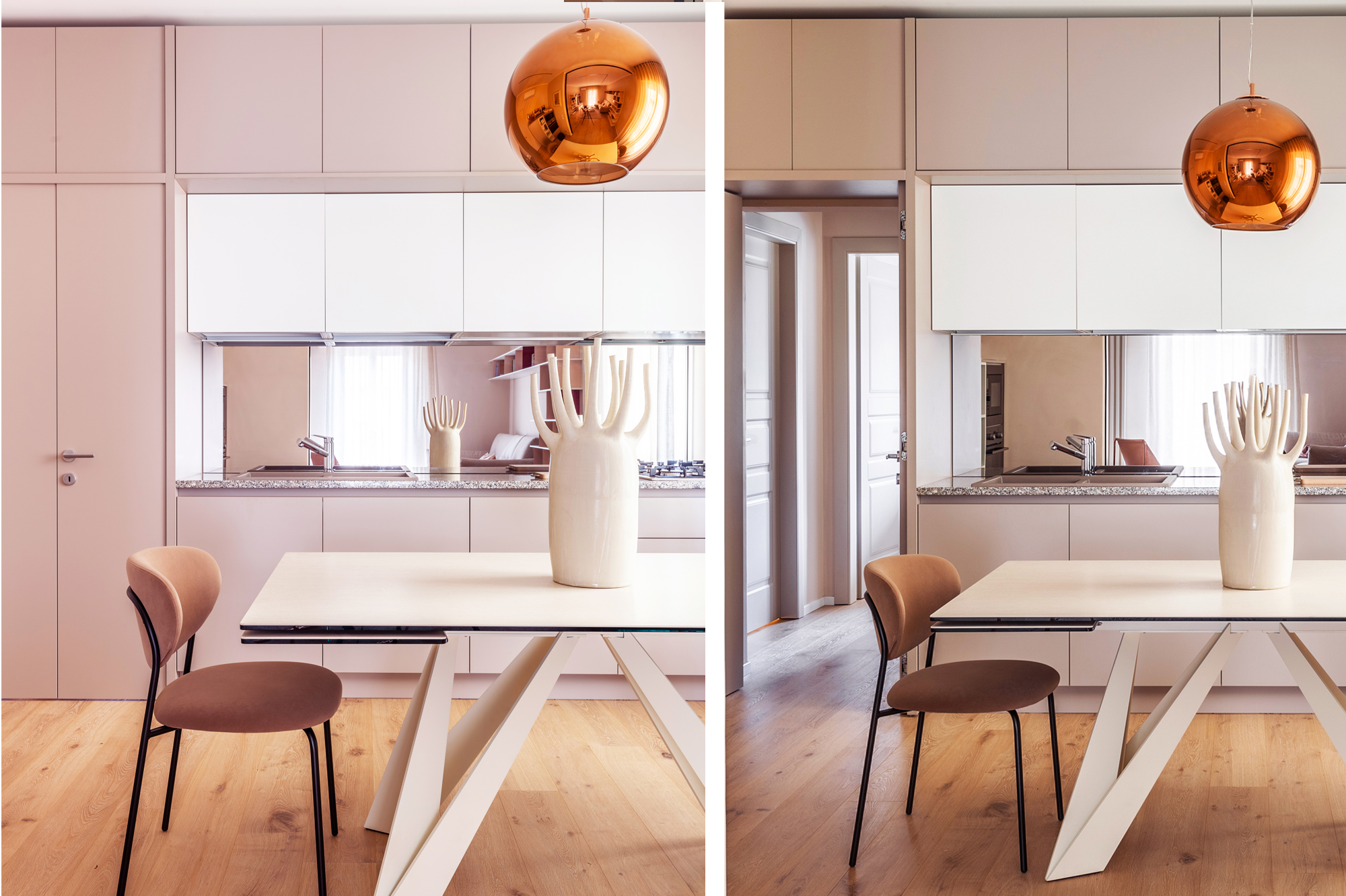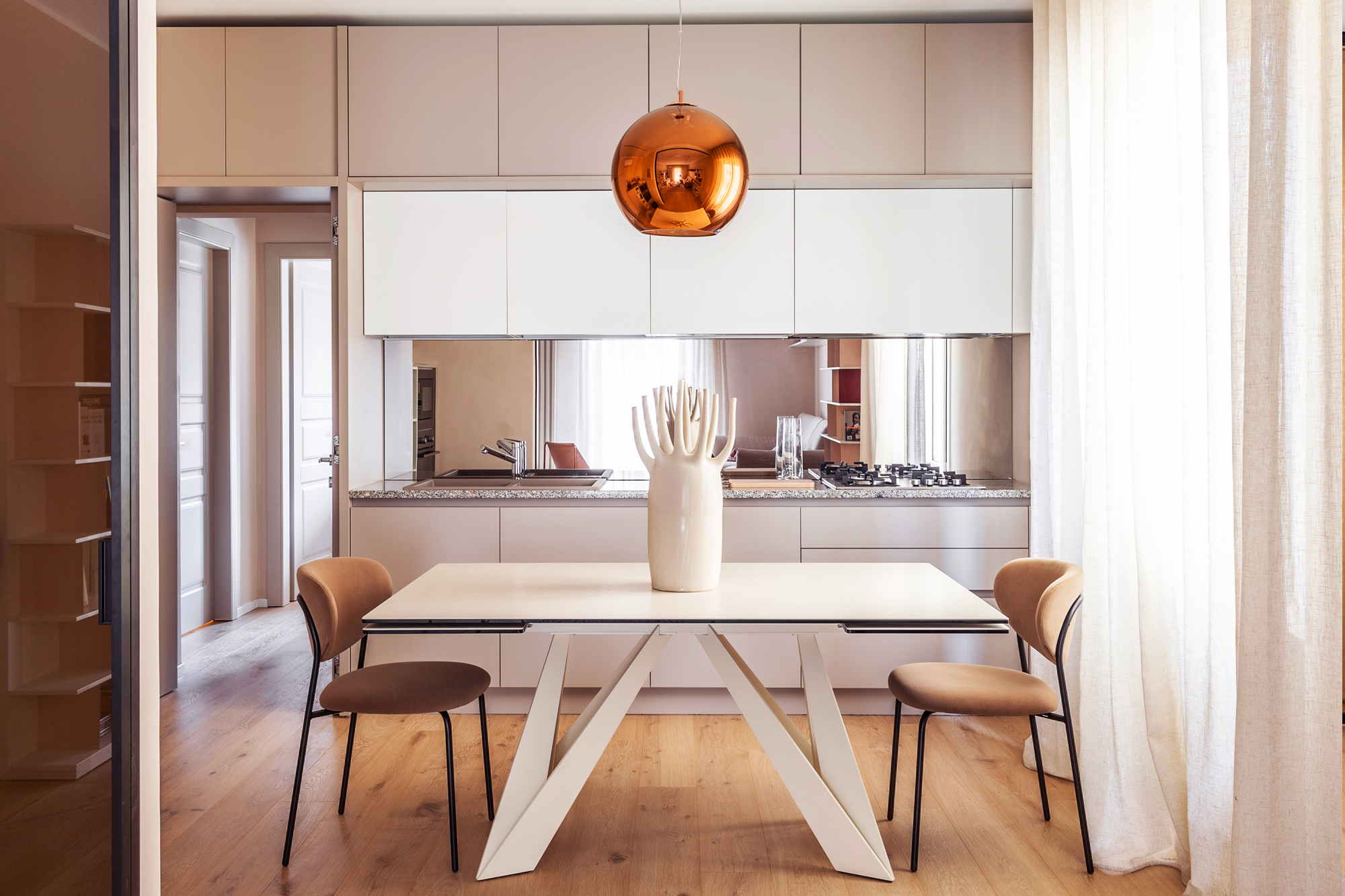 La cucina si sviluppa ottimizzando la parete attrezzata con doppia fila di pensili fino a soffitto e nasconde la porta di accesso al disimpegno zona notte realizzata in falegnameria. Il tavolo da pranzo allungabile ha base in acciaio verniciato RAL1013 e piano in grès effetto travertino chiaro opaco.