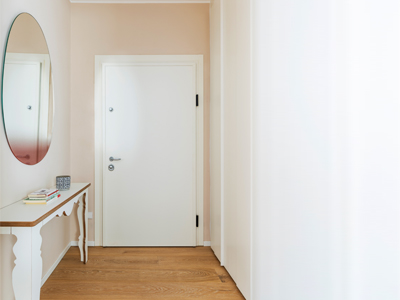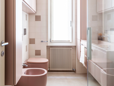 Per quanto riguarda le finiture è stato scelto un parquet in rovere sbiancato che è stato posato a correre in tutta casa ad eccezione del bagno, nel quale invece si trova del grès a pavimento e delle maioliche in pasta bianca finissima come rivestimento. La pittura parietale è uniforme in tutta casa ed è di colore beige rosato, i soffitti sono bianchi ad eccezione del bagno il cui soffitto è invece anch’esso beige rosato