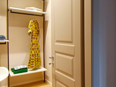 La zona dell’ingresso si apre sul living open-space; per renderla più funzionale è stato creato un grande ripostiglio-guardaroba prospicente l’ingresso con di fronte una console in mdf laminato realizzata su disegno della Progettista.