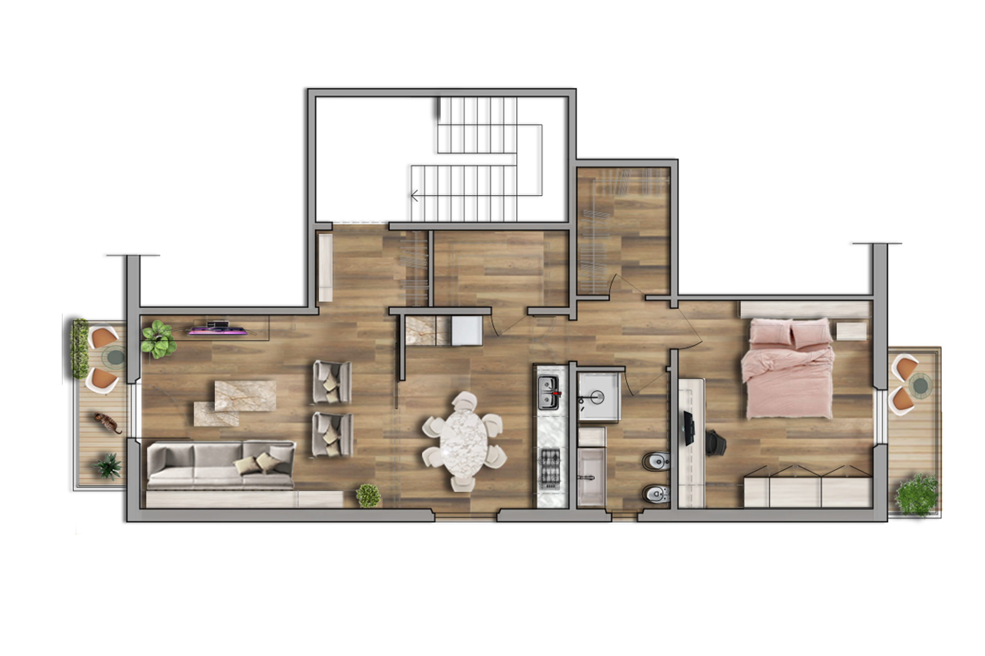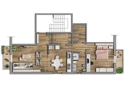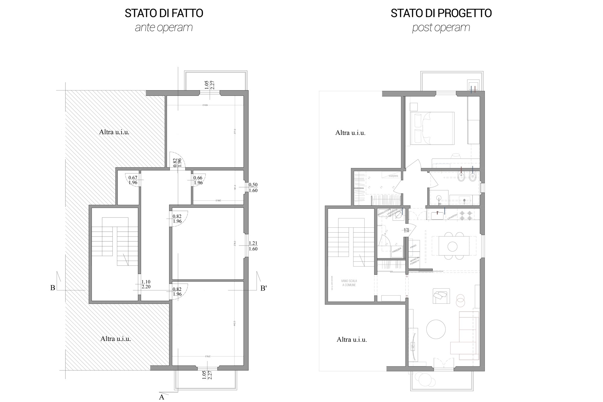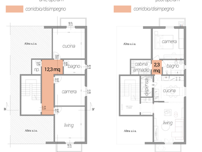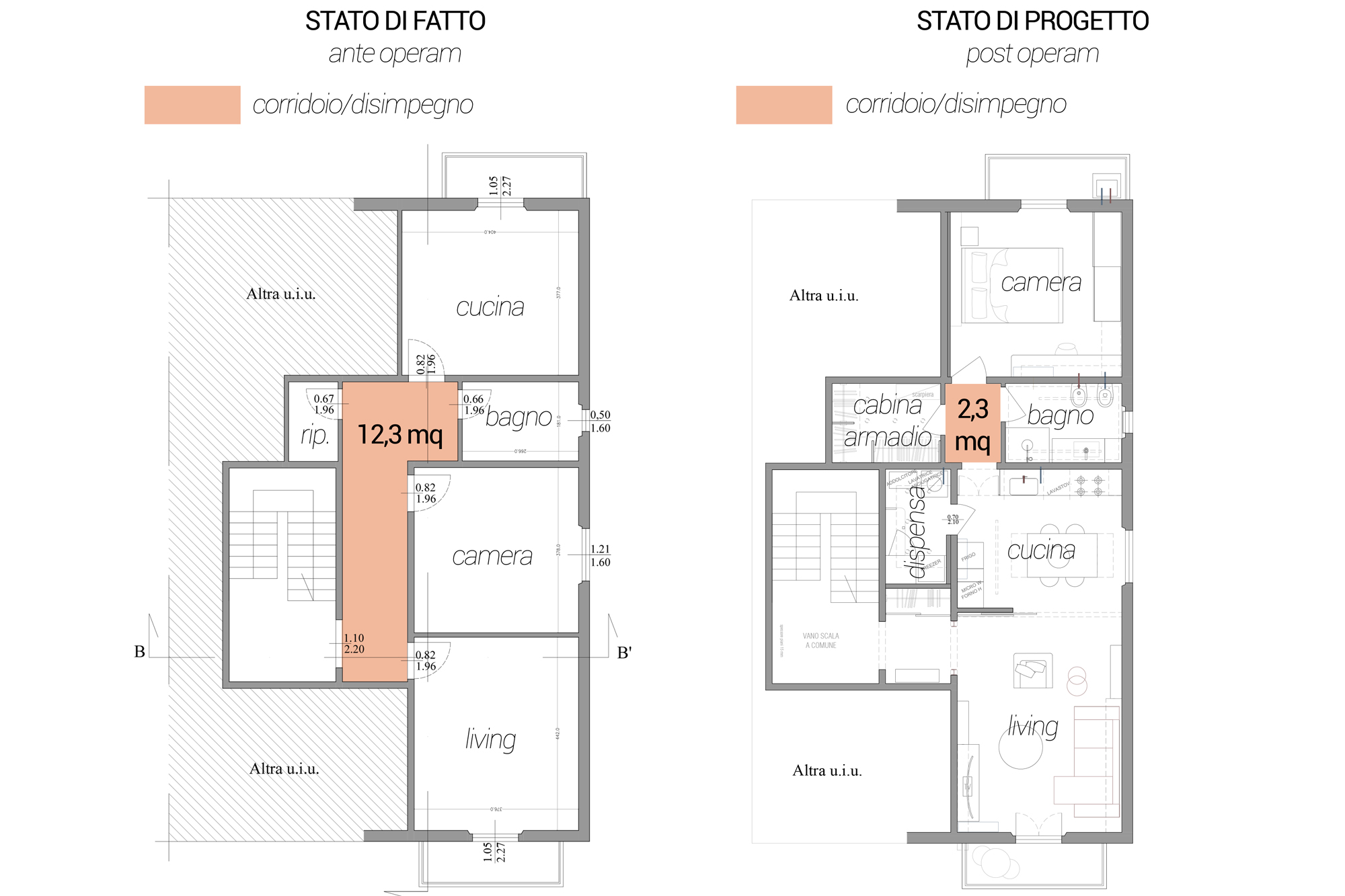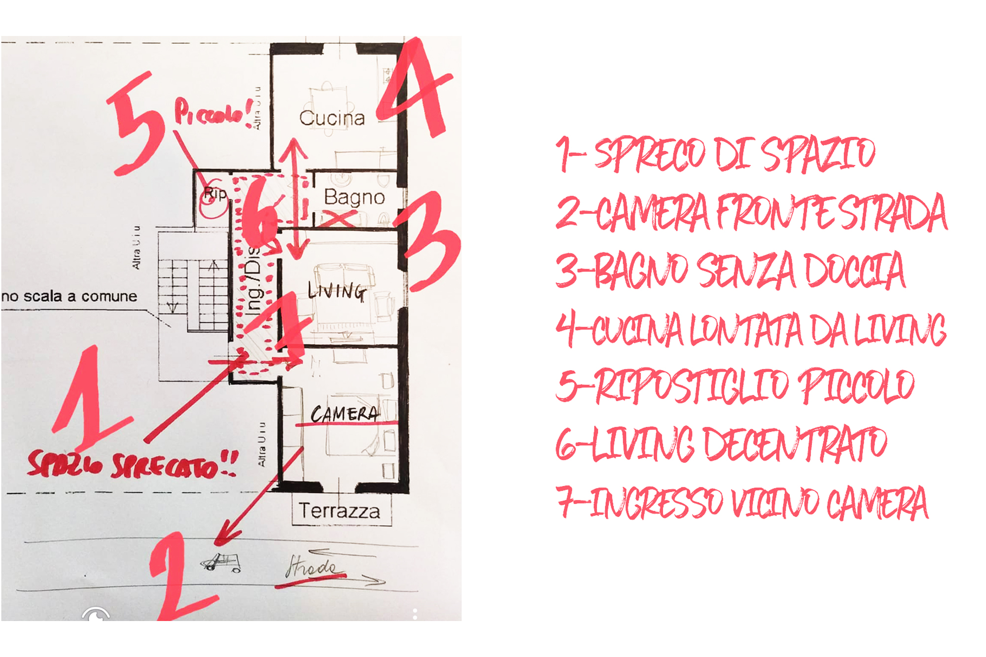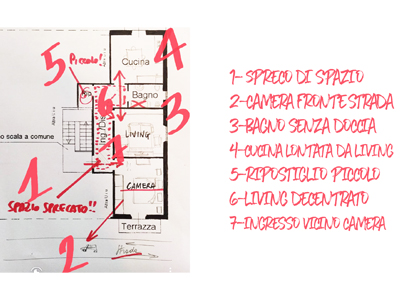 Ristrutturazione di un piccolo appartamento nei pressi di Firenze curato nei minimi dettagli dalla redazione della pratica edilizia fino al disegno degli arredi, servizio di home shopping e studio dell’illuminazione. La situazione dell’abitazione ante operam era talmente drammatica che, se la Committente avesse chiesto il parere degli architetti PRIMA dell’acquisto, sarebbe stata quasi sicuramente indirizzata altrove. Da una prima occhiata era palese che sarebbe stato necessario un intervento di consolidamento per ristrutturare un appartamento in condizioni fatiscenti. Inoltre essendo questo in muratura portante, sembrava impossibile sfruttare un corridoio di quasi 12 mq senza grandi interventi. Dopo delle attente analisi il colpo di genio: chiudere vicino all’ingresso il corridoio enorme (ben 12,3mq sprecati) per trasformarlo in tre ambienti ben più utili soprattutto quando si ha a disposizione poco spazio: un guardaroba all’ingresso, una dispensa adiacente alla cucina e una cabina armadio adiacente alla camera recuperando ben 10 mq e lasciando un piccolo disimpegno di soli 2,3mq per distribuire bagno, zona giorno e zona notte.
