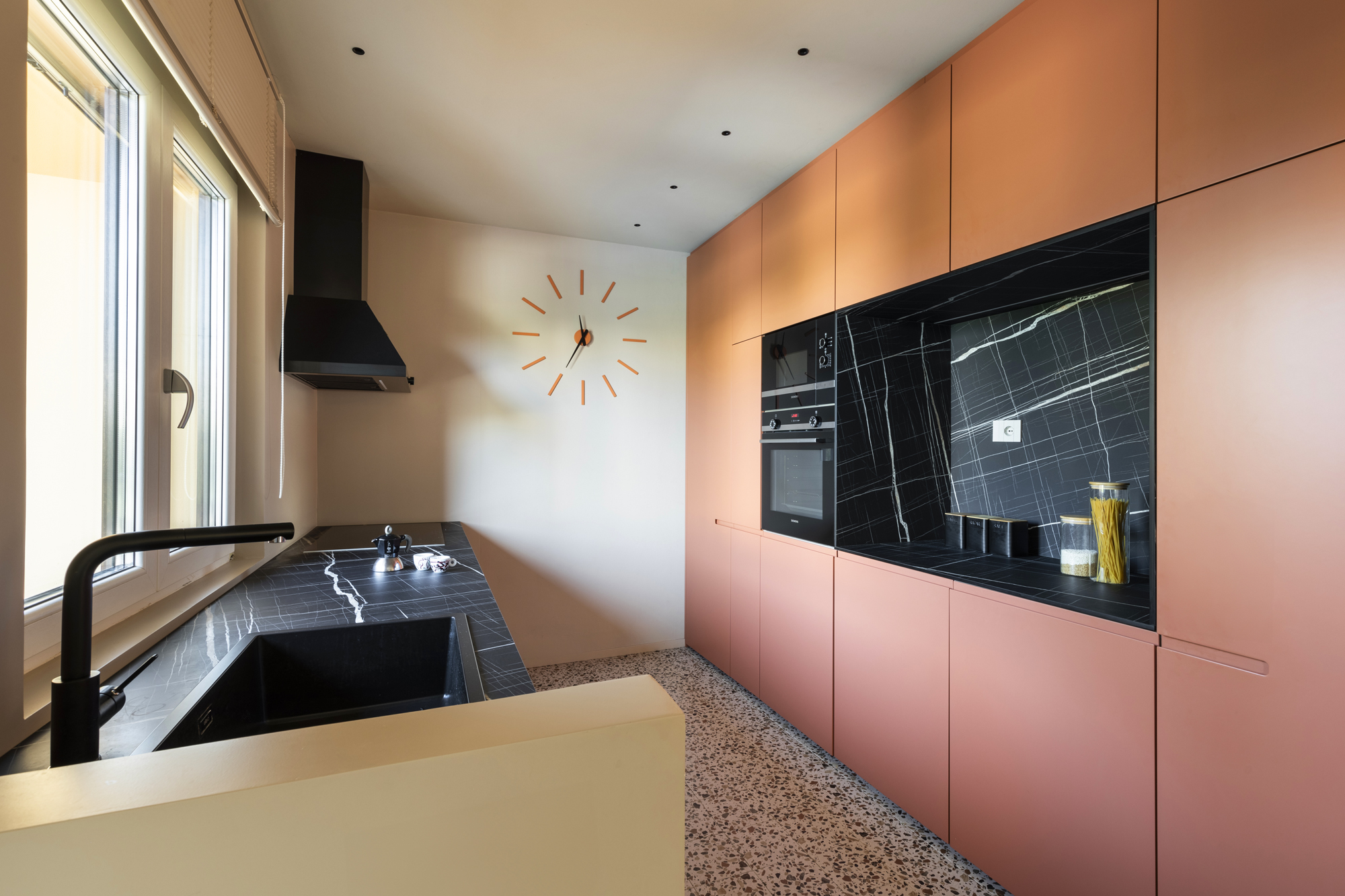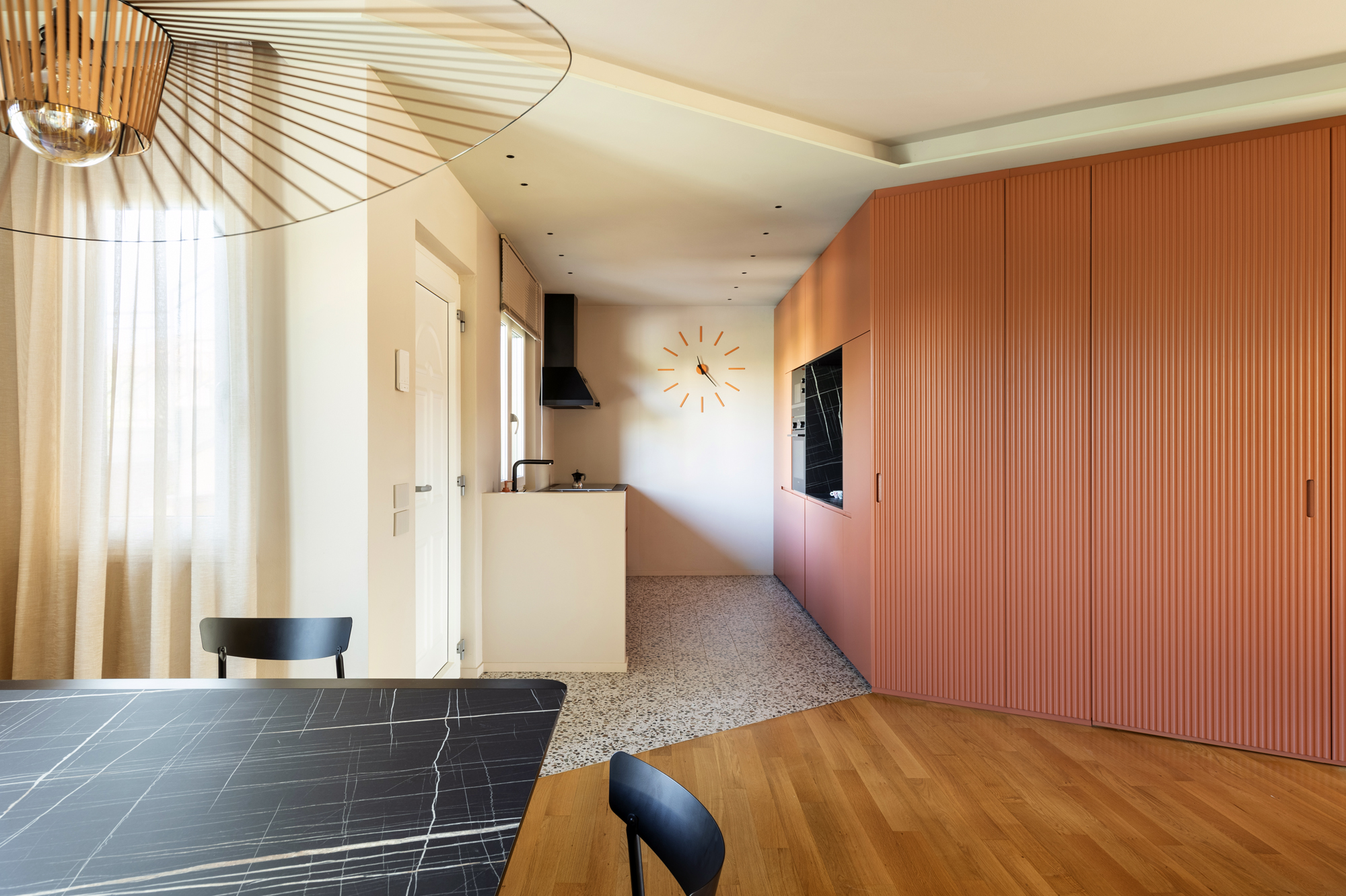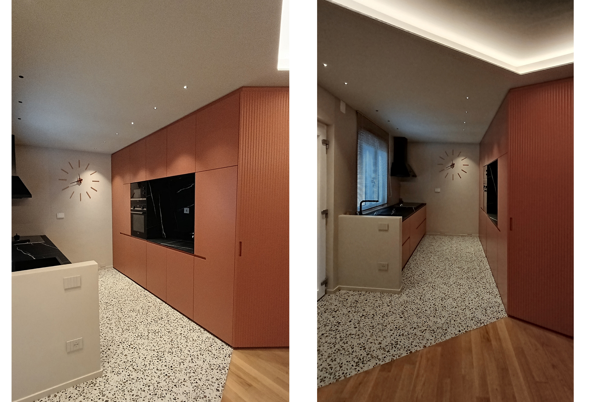 Per permettere di ampliare la cucina senza cambiarle posizione ho proposto una soluzione che ha eliminato la penisola e creato una cucina parallela con parte operativa dal lato finestra (cucina senza pensili) e di fronte una zona colonne con nicchia centrale. Il top è un HPL effetto marmo nero venato con cui abbiamo rivestito interamente la nicchia tra le colonne e realizzato il piano del tavolo da pranzo quadrato interamente realizzato su misura. La parete delle colonne si snoda e diventa boiserie cannettata in cui è nascosta la porta del reparto notte e del disimpegno della scala che porta al piano seminterrato; il tutto rigorosamente color terracotta, scala e corrimano compresi.