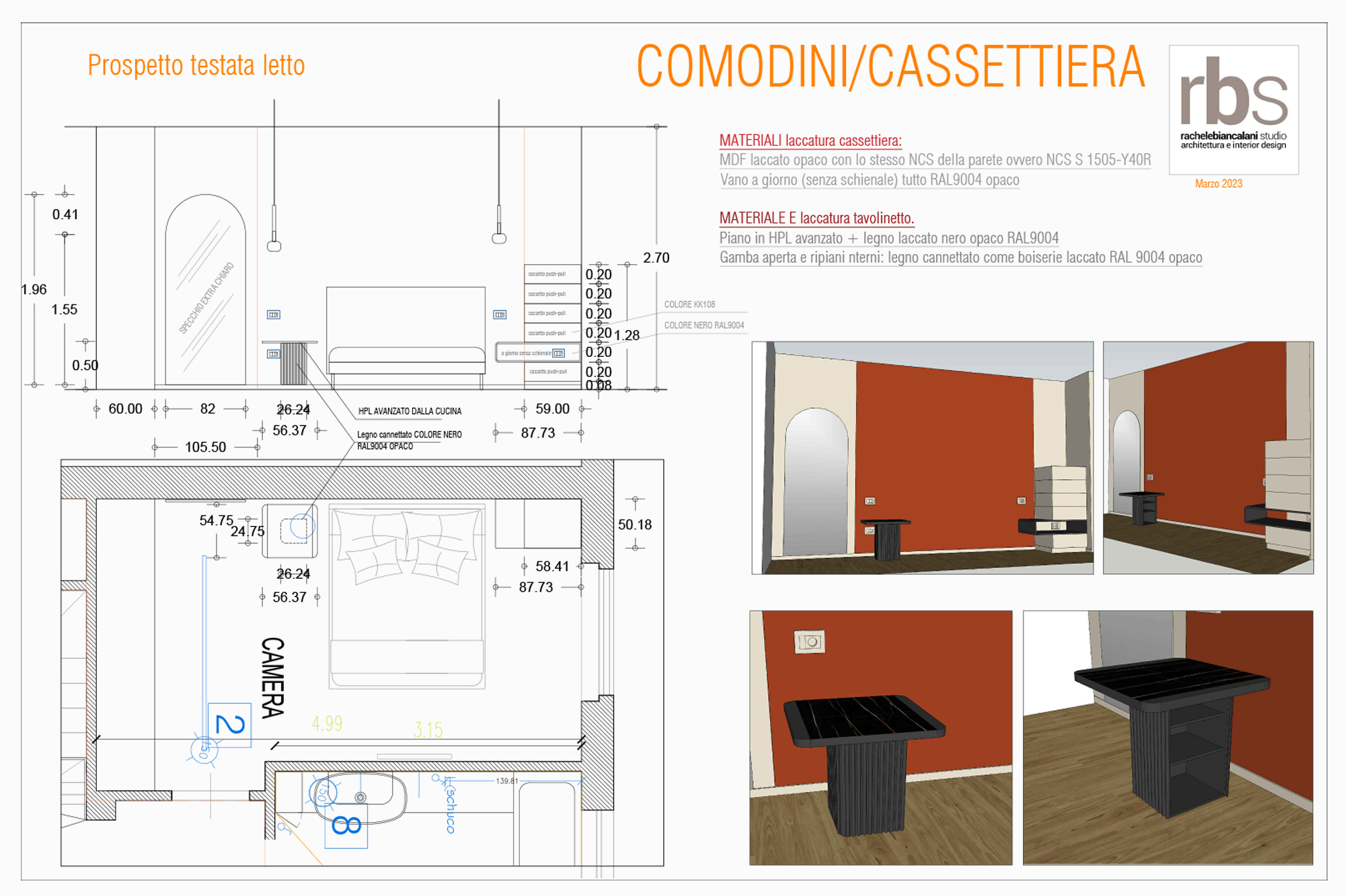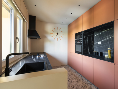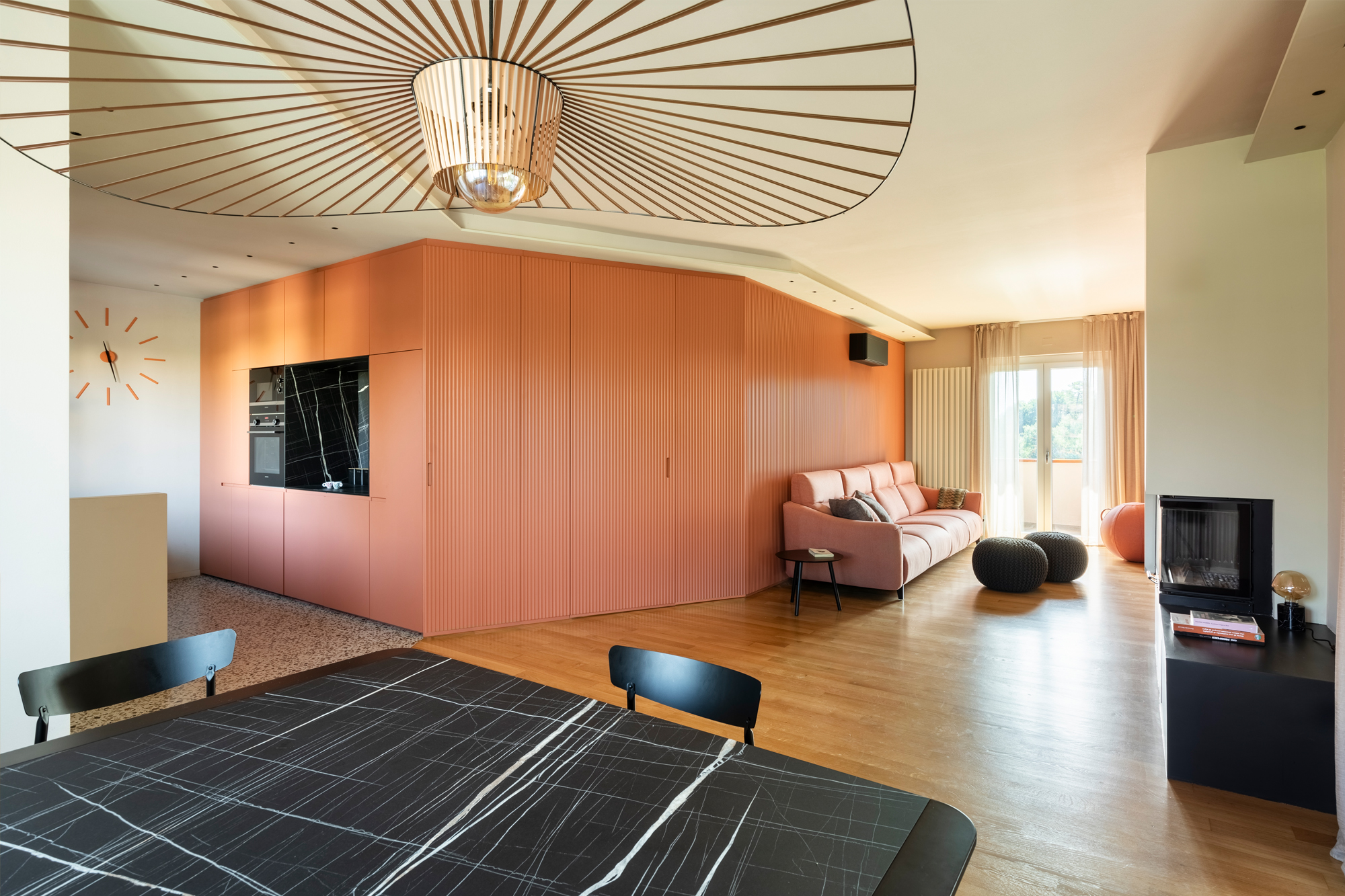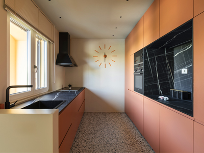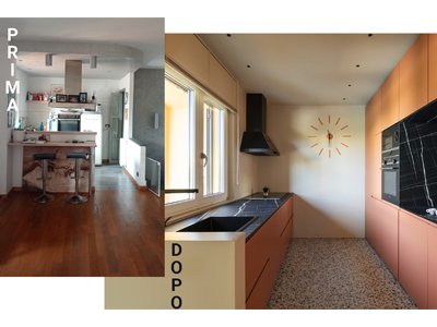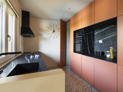 Per permettere di ampliare la cucina senza cambiarle posizione ho proposto una soluzione che ha eliminato la penisola e creato una cucina parallela con parte operativa dal lato finestra (cucina senza pensili) e di fronte una zona colonne con nicchia centrale. Il top è un HPL effetto marmo nero venato con cui abbiamo rivestito interamente la nicchia tra le colonne e realizzato il piano del tavolo da pranzo quadrato interamente realizzato su misura. La parete delle colonne si snoda e diventa boiserie cannettata in cui è nascosta la porta del reparto notte e del disimpegno della scala che porta al piano seminterrato; il tutto rigorosamente color terracotta, scala e corrimano compresi.
