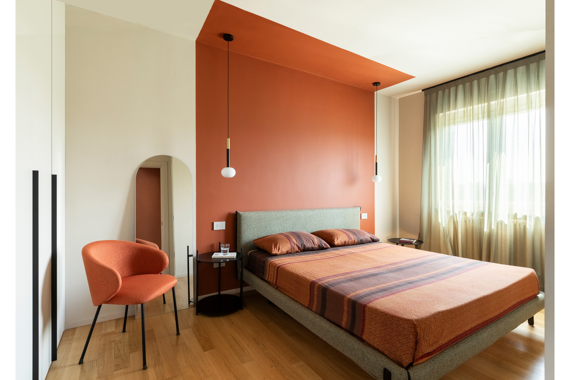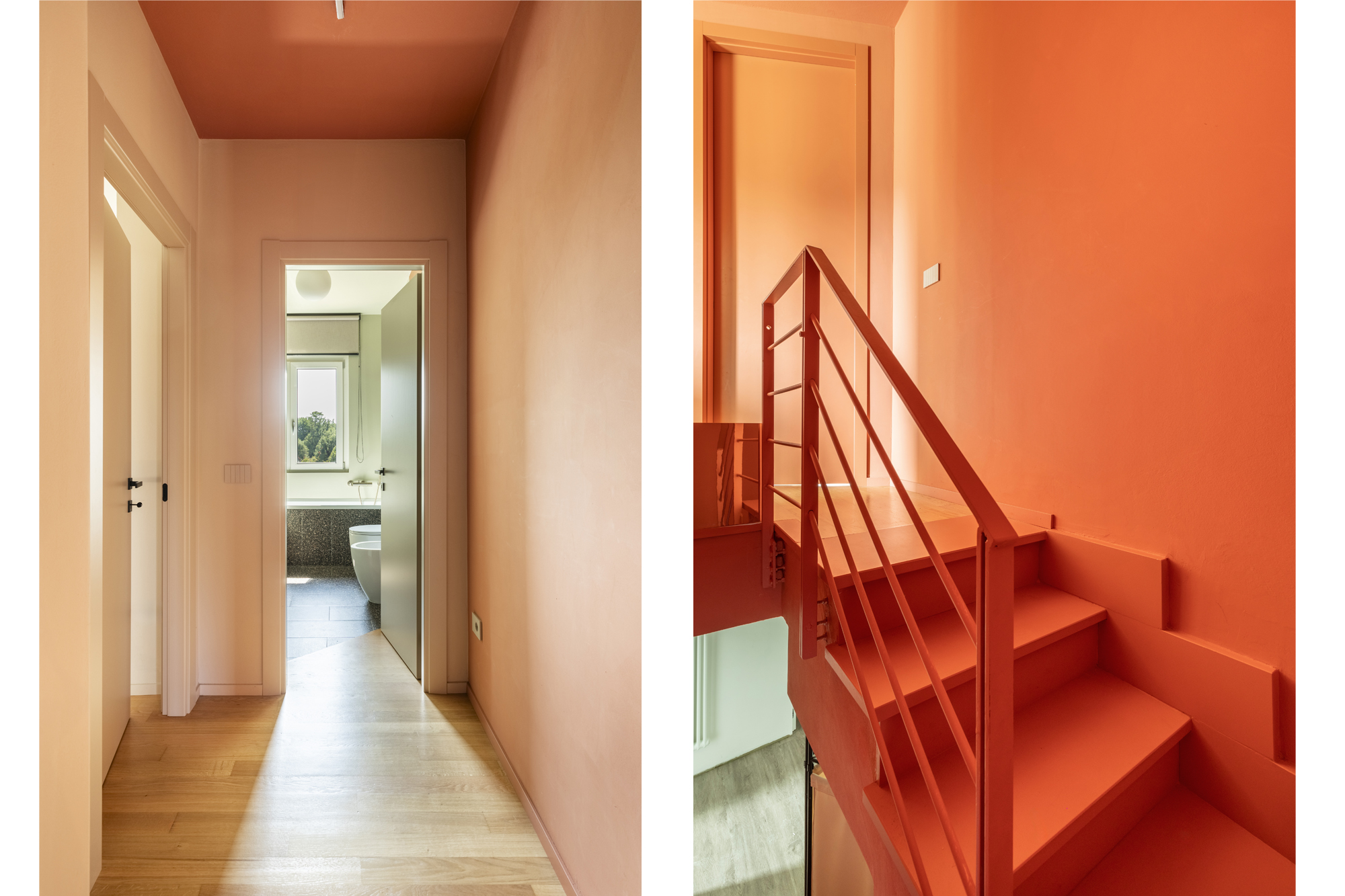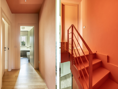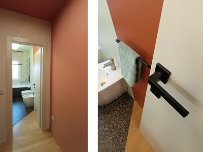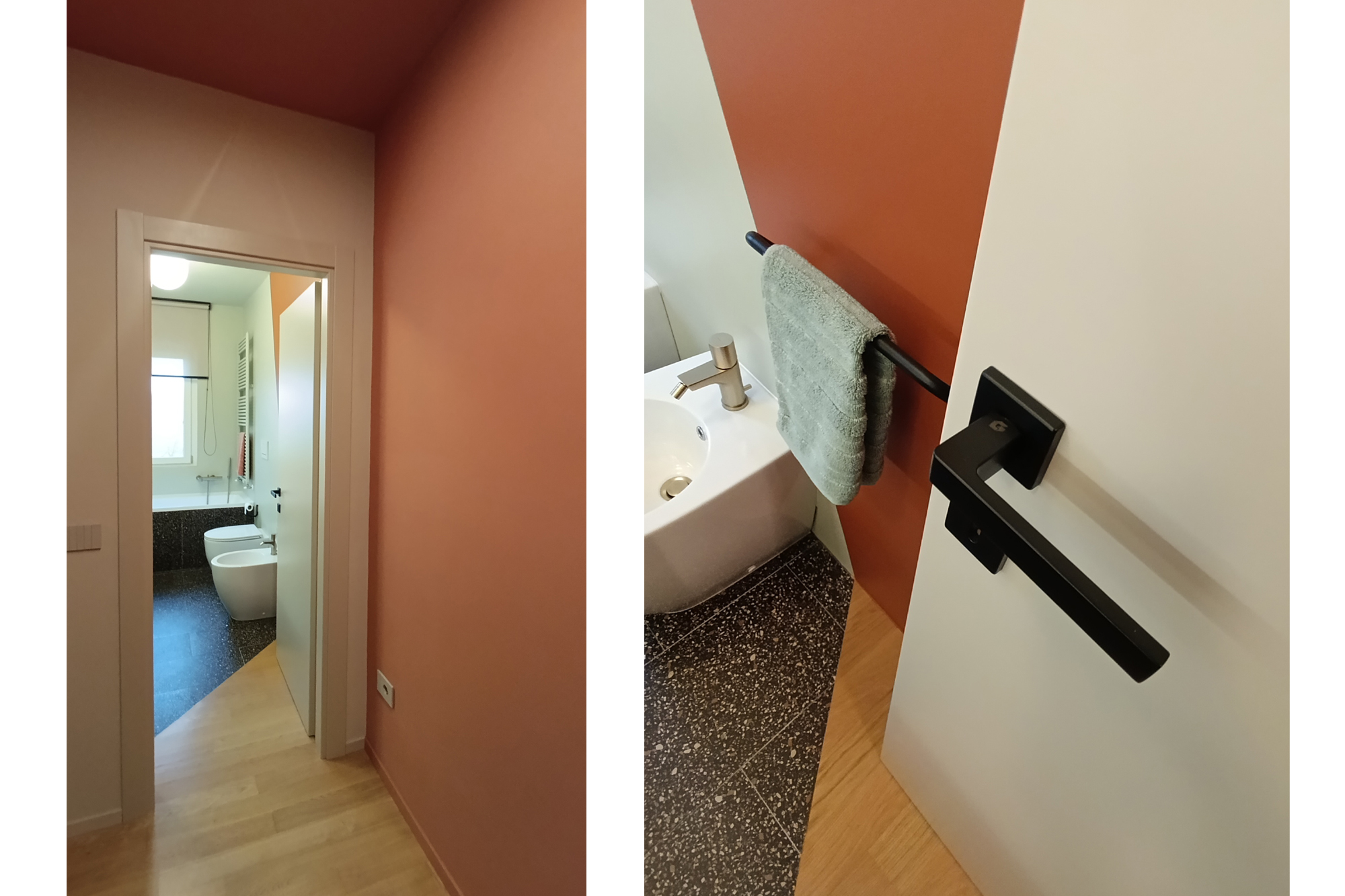 - La porta della zona notte mimetizzata nella boiserie cannettata color terracotta