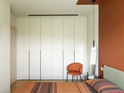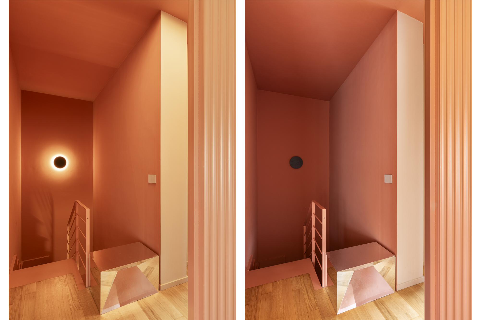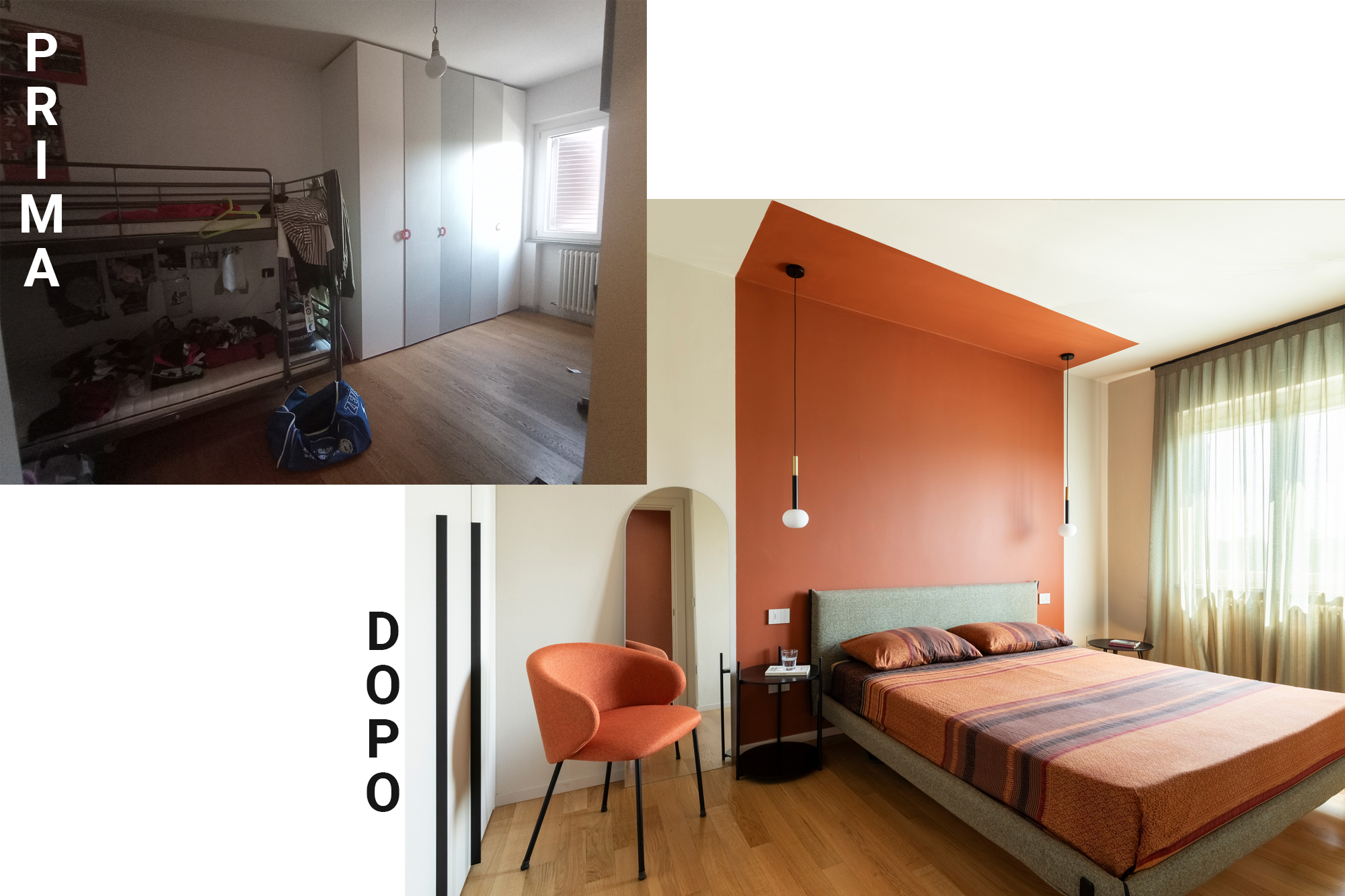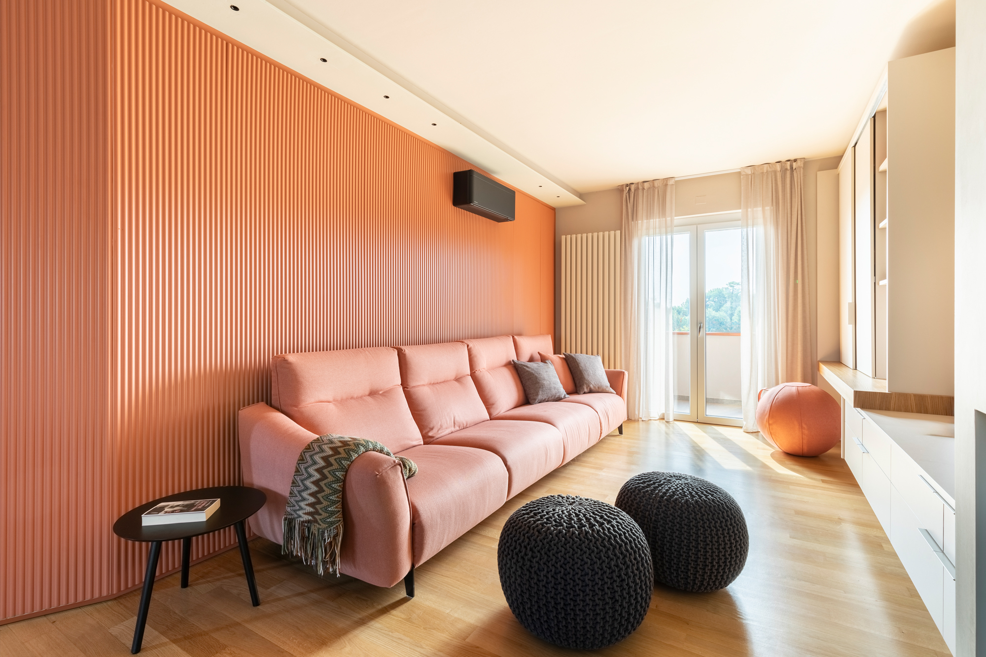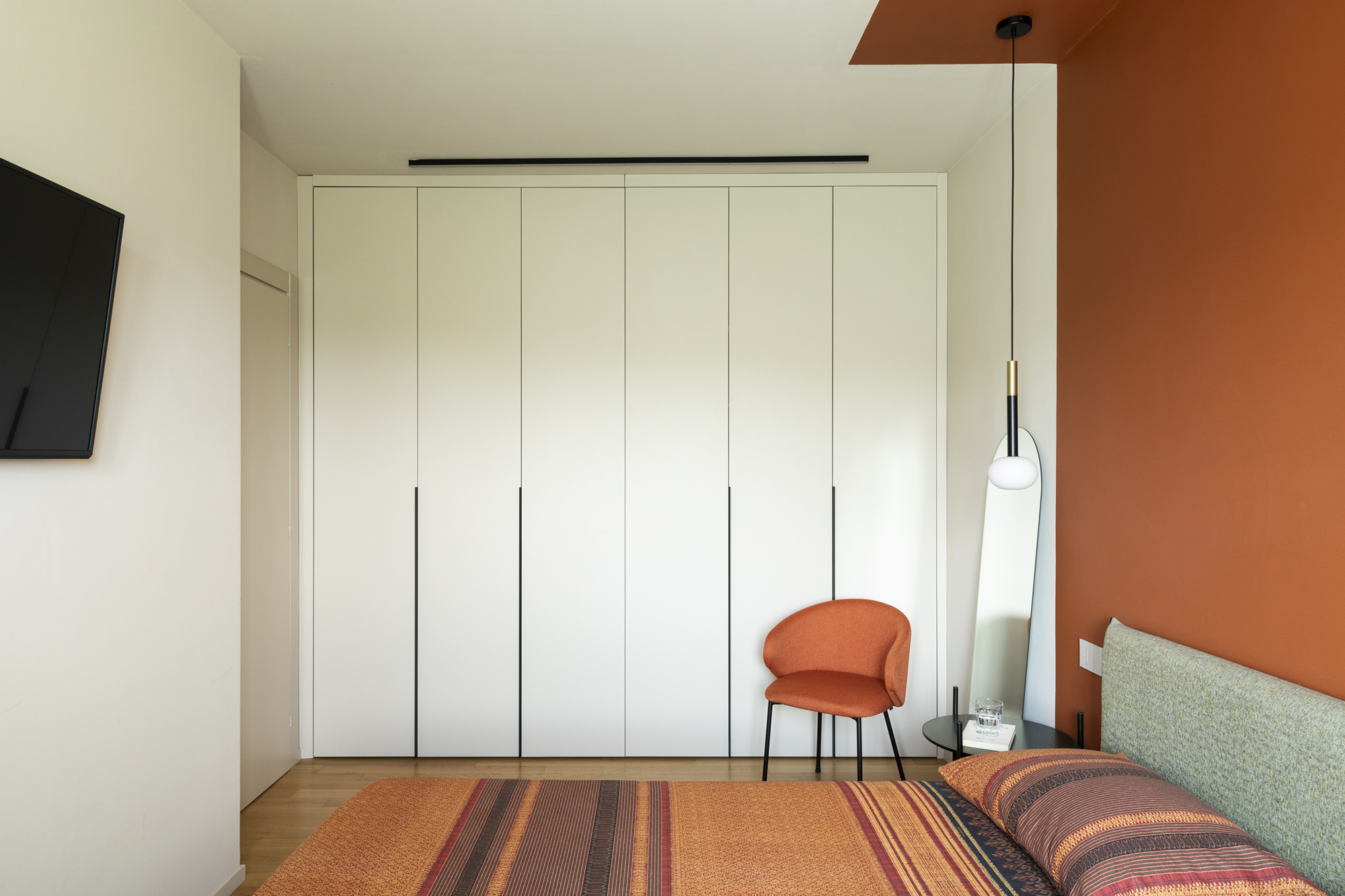 - La porta della zona notte mimetizzata nella boiserie cannettata color terracotta