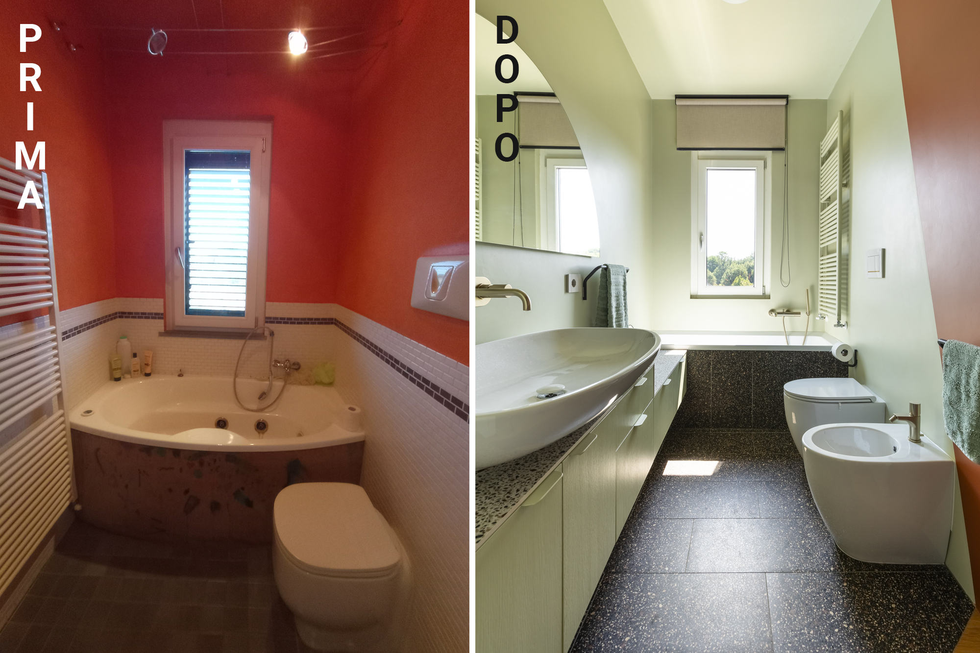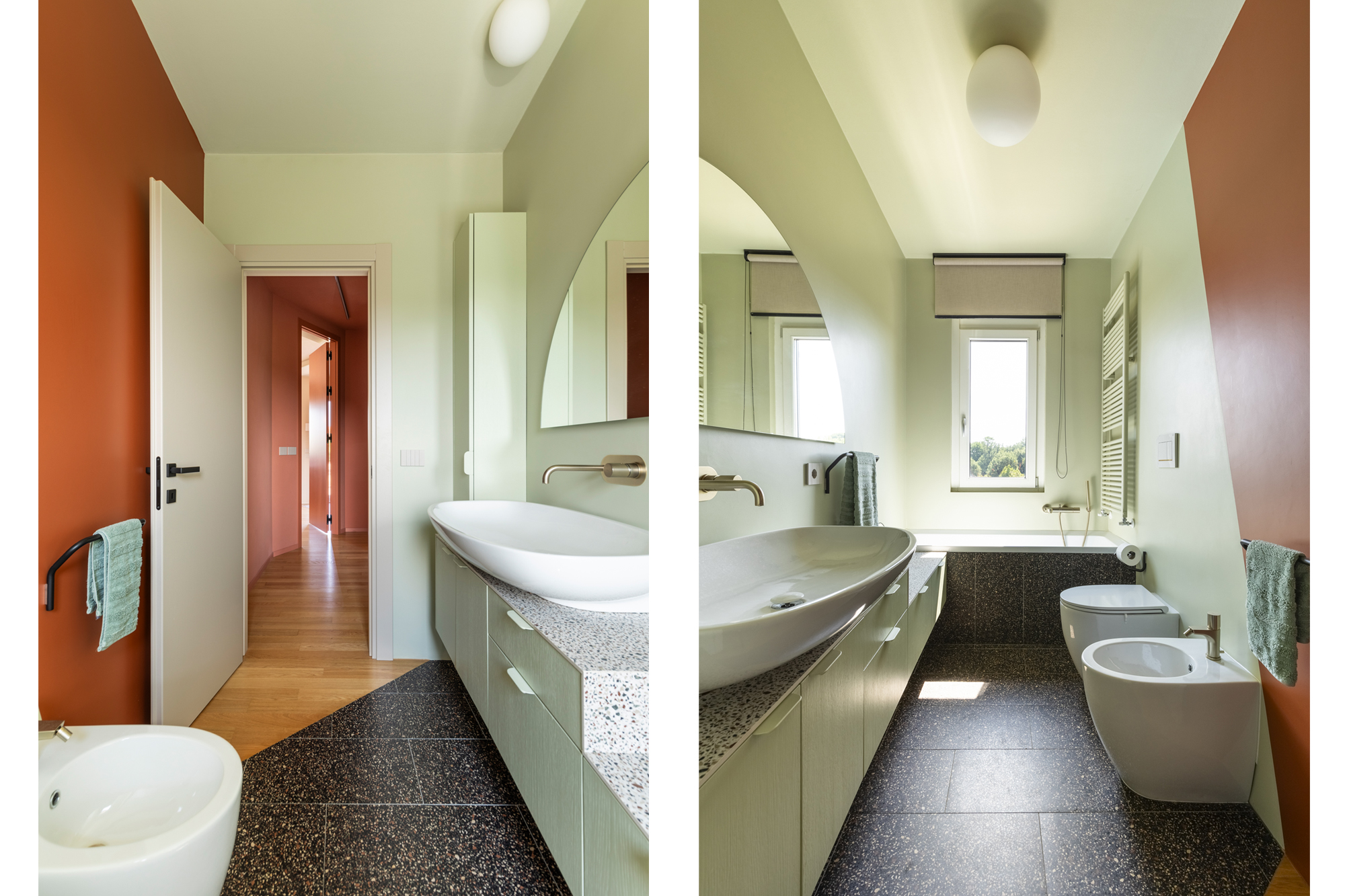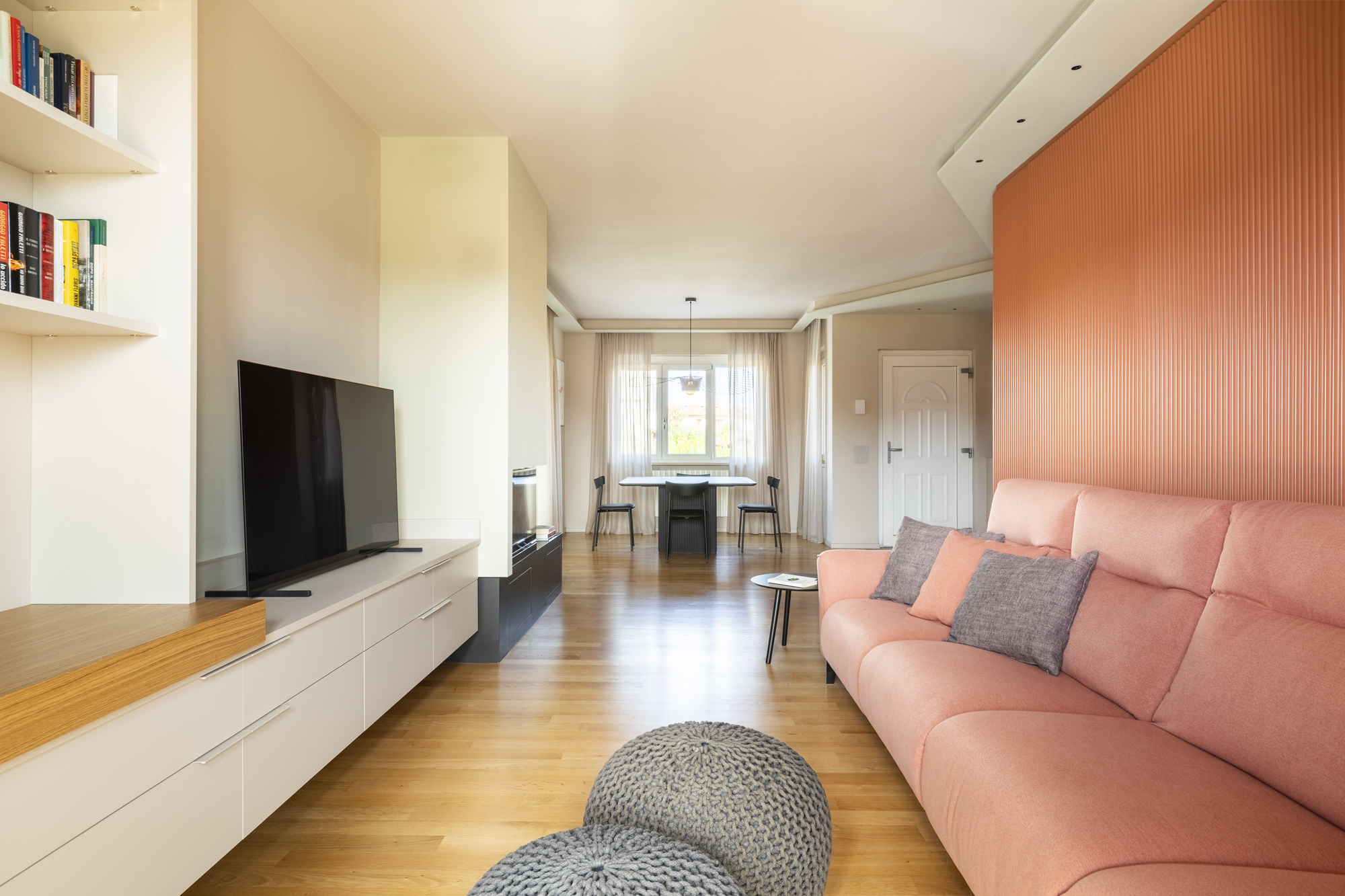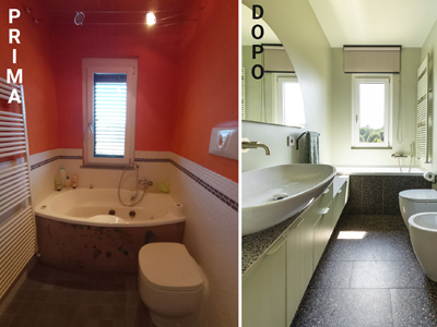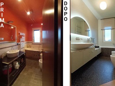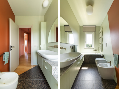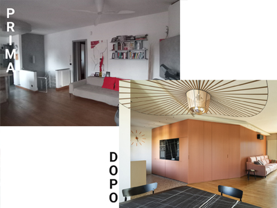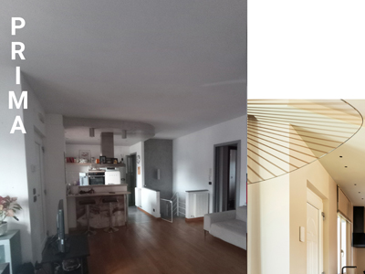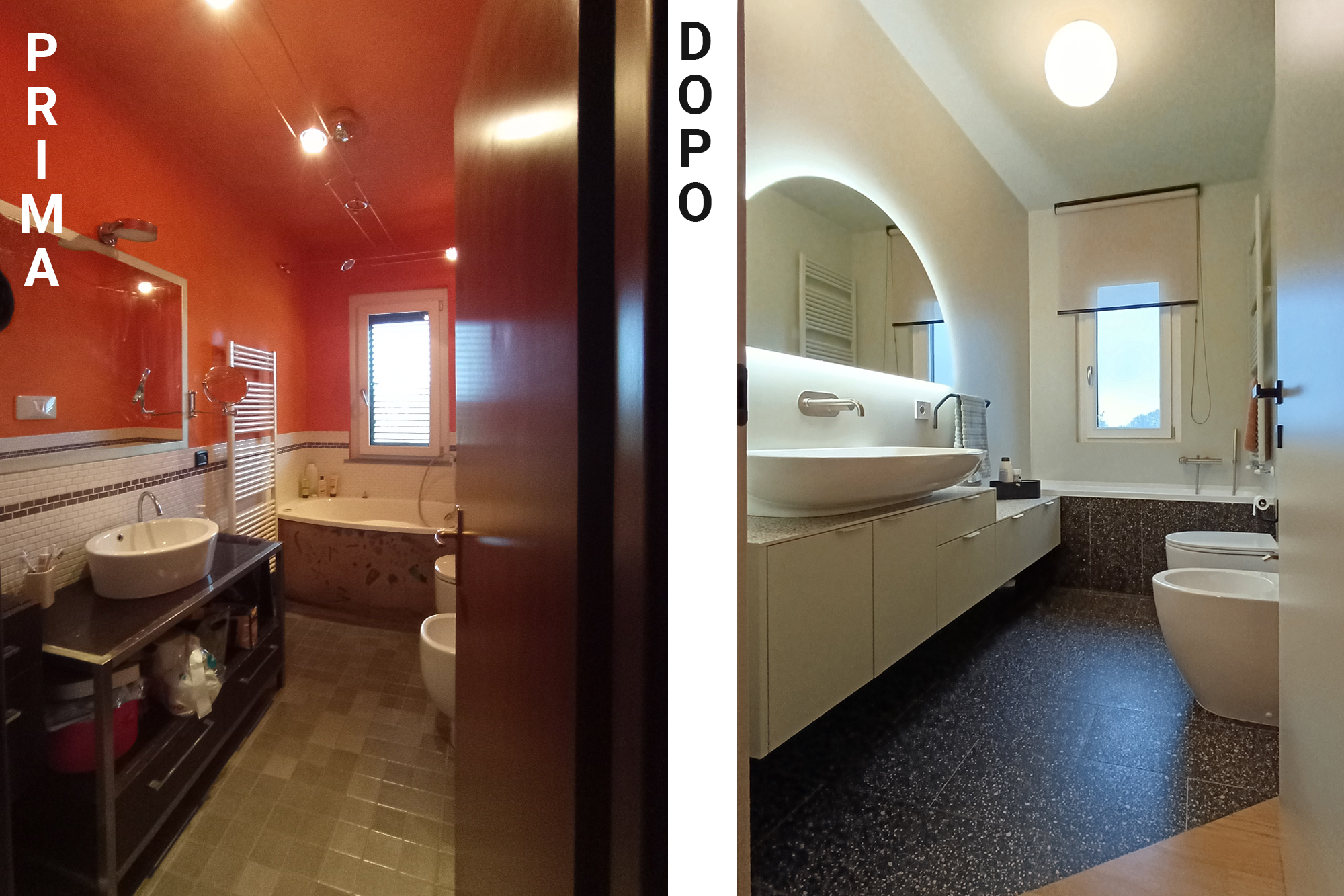 Su misura sono realizzati praticamente tutti gli arredi (cucina, tavolo indoor e outdoor, parete tv, armadio camera, mobili bagno) ed i rivestimenti in legno (boiserie living) dell’abitazione visto che il mio Committente è uno dei due titolari di una falegnameria (CB Interni) specializzata in arredamento d’interni. La planimetria di progetto è caratterizzata da alcune direttrici diagonali (da cui il nome del lavoro per assonanza con “diagonali”) che scandiscono gli spazi e disegnano volumi che prima non c’erano. Le stesse diagonali sono state disegnate a pavimento per separare in modo non solo decorativo ma soprattutto funzionale: le zone con parquet in rovere naturale esistente (che è stato rilamato e riverniciato all’acqua) che è un’essenza piuttosto sensibile all’umidità è stato sostituito dal gres in cucina, ingresso e bagno. Le linee diagonali a pavimento ritornano in parete e anche a soffitto (vedi cartongesso nel living). Nel bagno sono state lasciate le medesime posizioni dei sanitari che c’erano prima dei lavori ma il resto è stato rinnovato completamente a partire dai rivestimenti. Si è usato lo stesso taglio diagonale che si è usato in cucina per separare il grès dal legno, rigorosamente SENZA PROFILI!