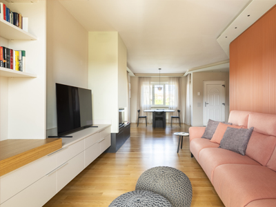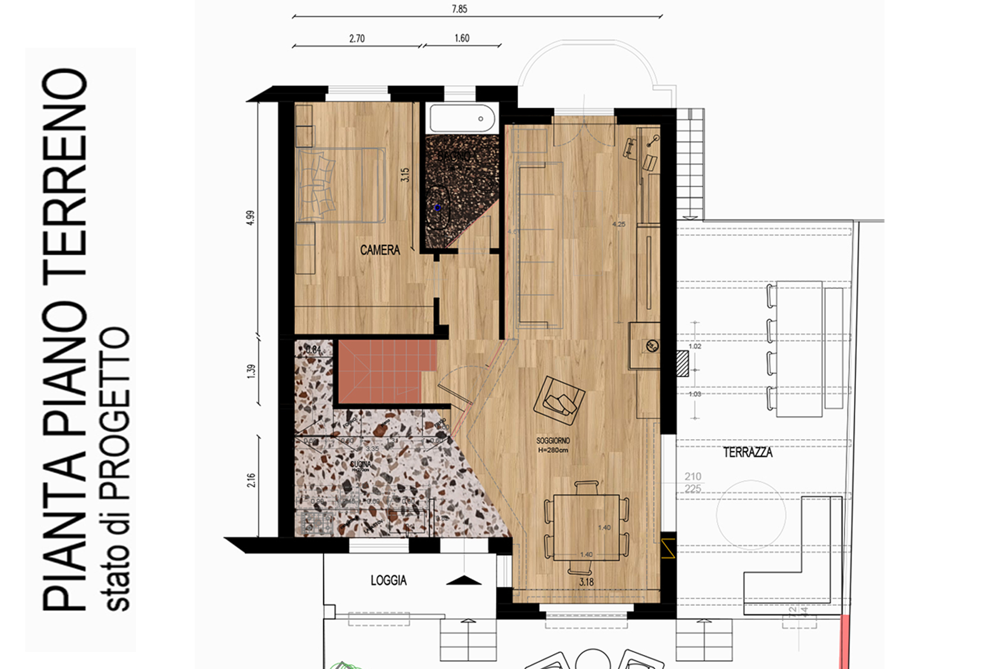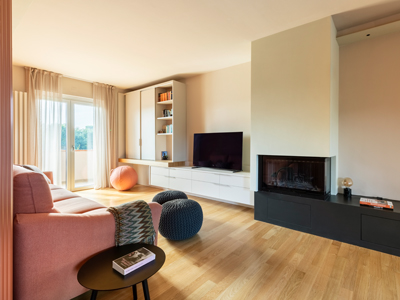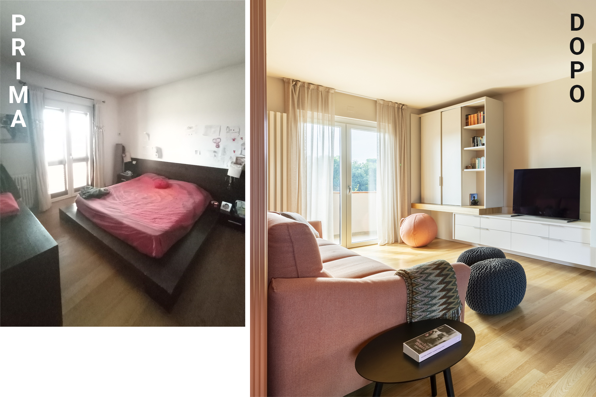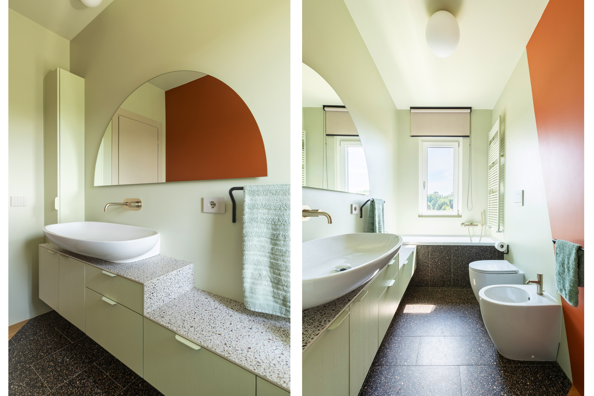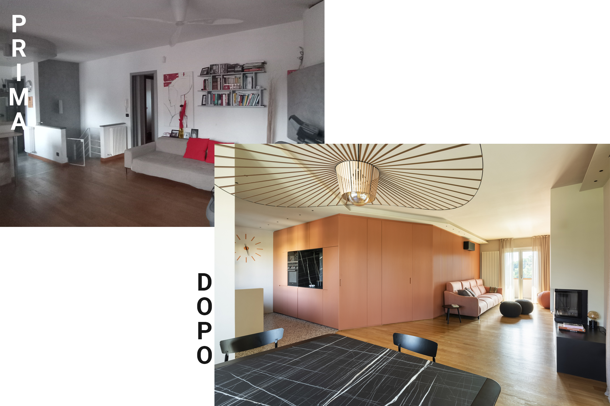 Su misura sono realizzati praticamente tutti gli arredi (cucina, tavolo indoor e outdoor, parete tv, armadio camera, mobili bagno) ed i rivestimenti in legno (boiserie living) dell’abitazione visto che il mio Committente è uno dei due titolari di una falegnameria (CB Interni) specializzata in arredamento d’interni. La planimetria di progetto è caratterizzata da alcune direttrici diagonali (da cui il nome del lavoro per assonanza con “diagonali”) che scandiscono gli spazi e disegnano volumi che prima non c’erano. Le stesse diagonali sono state disegnate a pavimento per separare in modo non solo decorativo ma soprattutto funzionale: le zone con parquet in rovere naturale esistente (che è stato rilamato e riverniciato all’acqua) che è un’essenza piuttosto sensibile all’umidità è stato sostituito dal gres in cucina, ingresso e bagno. Le linee diagonali a pavimento ritornano in parete e anche a soffitto (vedi cartongesso nel living). Nel bagno sono state lasciate le medesime posizioni dei sanitari che c’erano prima dei lavori ma il resto è stato rinnovato completamente a partire dai rivestimenti. Si è usato lo stesso taglio diagonale che si è usato in cucina per separare il grès dal legno, rigorosamente SENZA PROFILI!